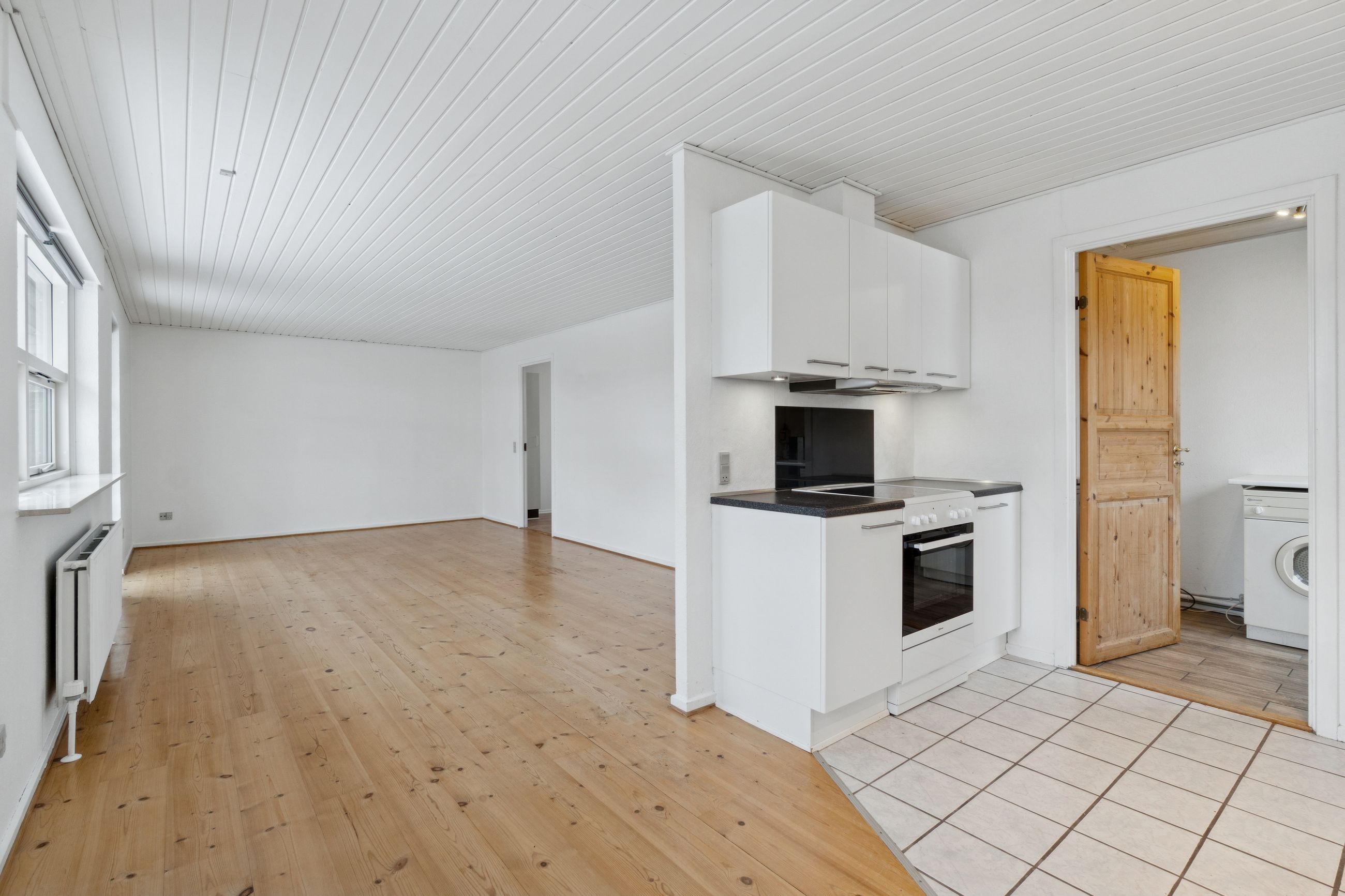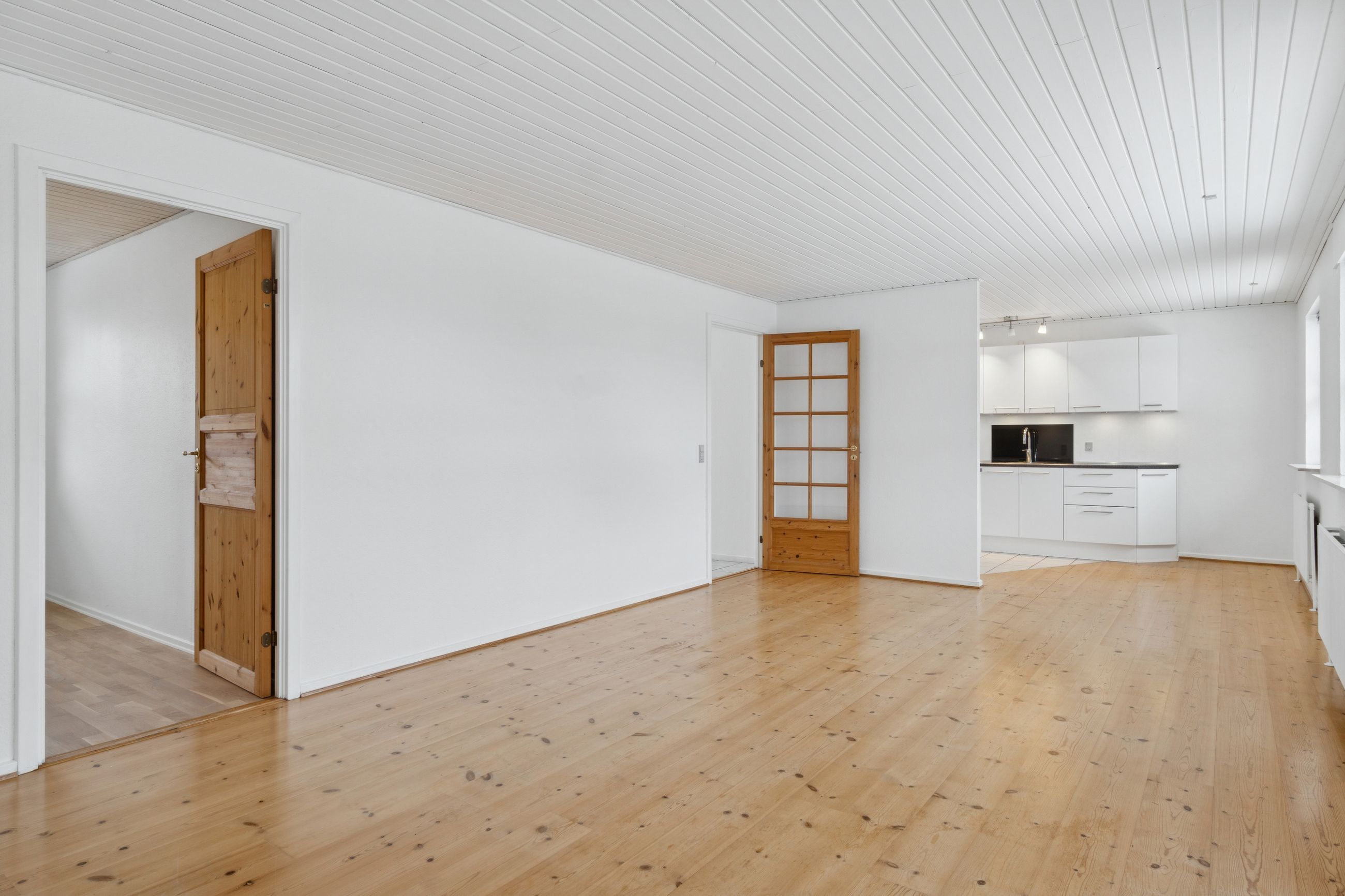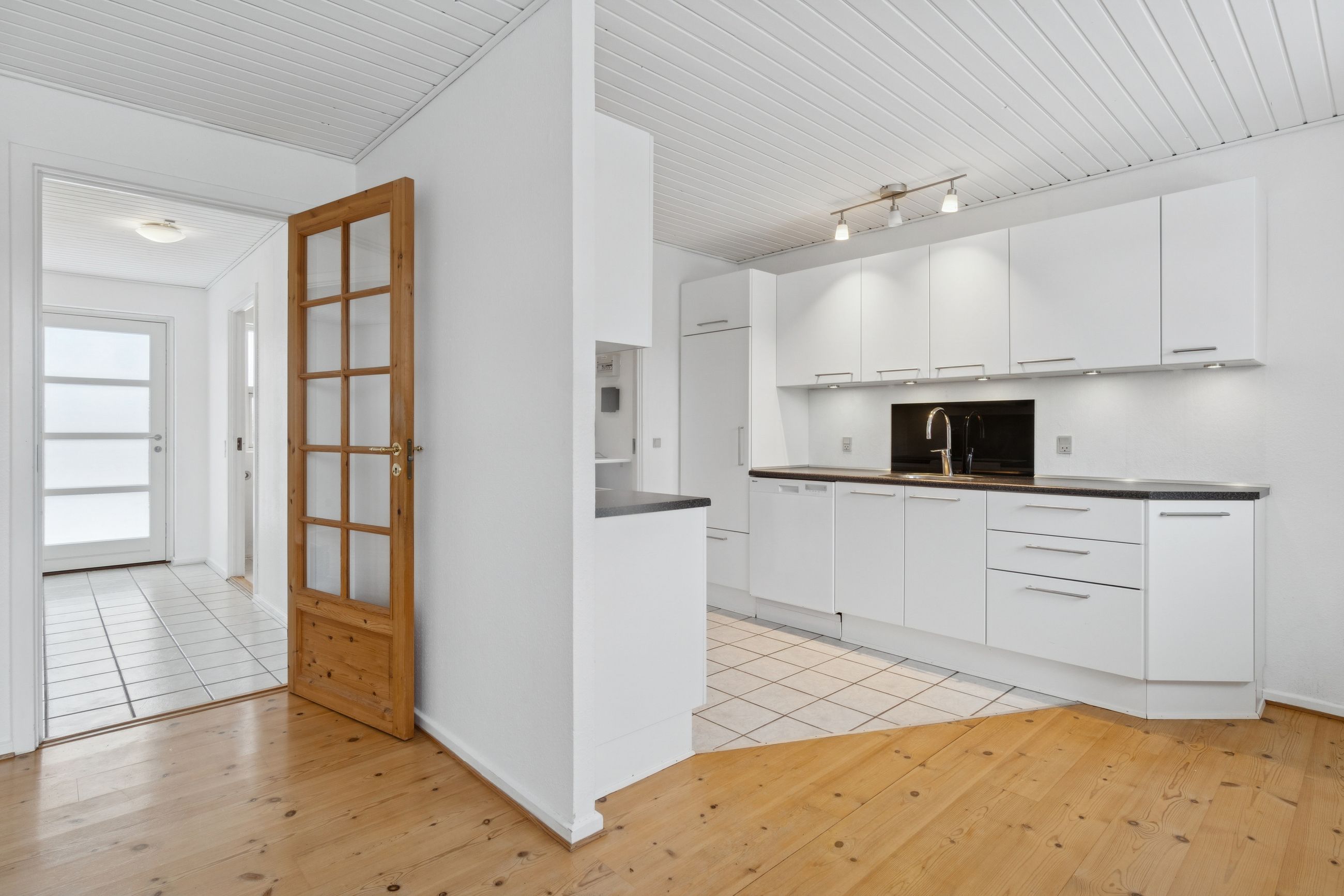 Boligen rummer et lyst og indbydende opholdsrum med plads til både spise- og sofagruppe, hvor de store vinduespartier giver et dejligt lysindfald. Køkkenet ligger i åben eller let adskilt forbindelse med stuen og har god skabsplads og funktionel indretning.