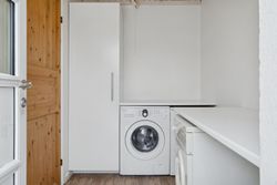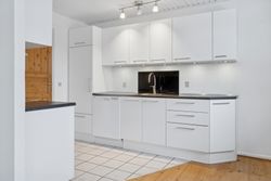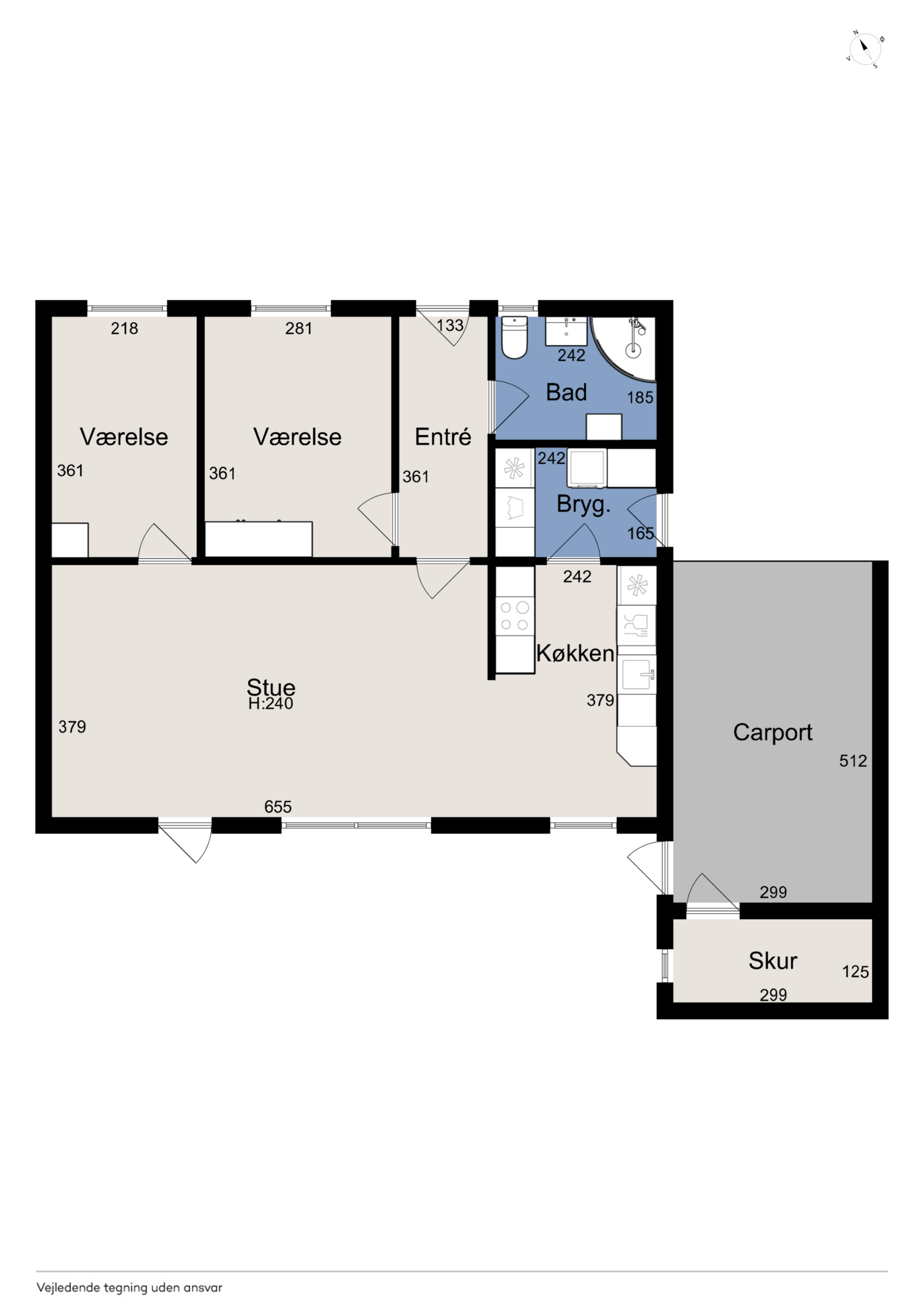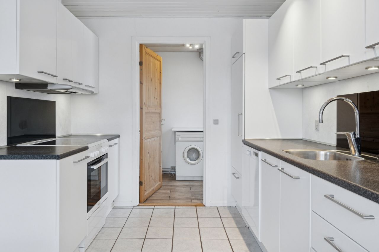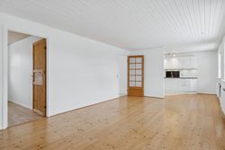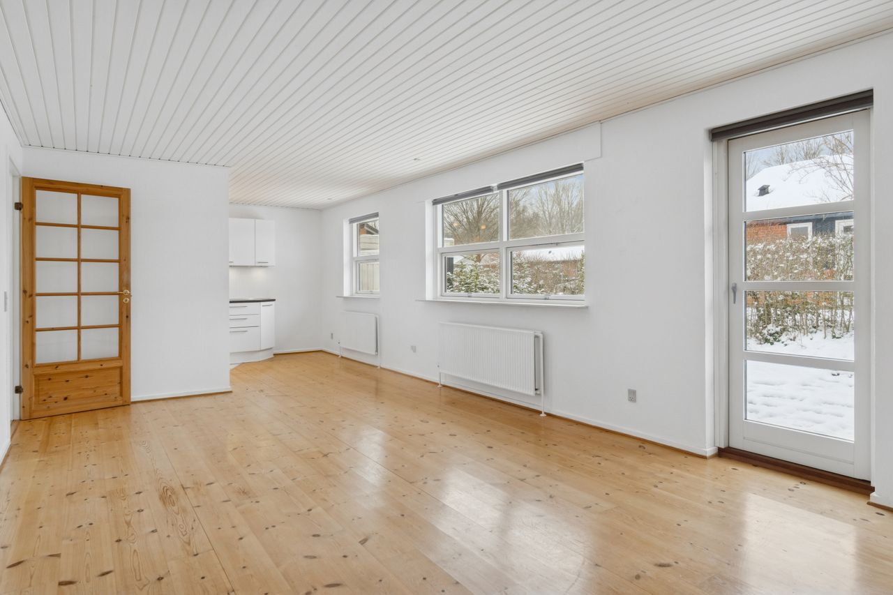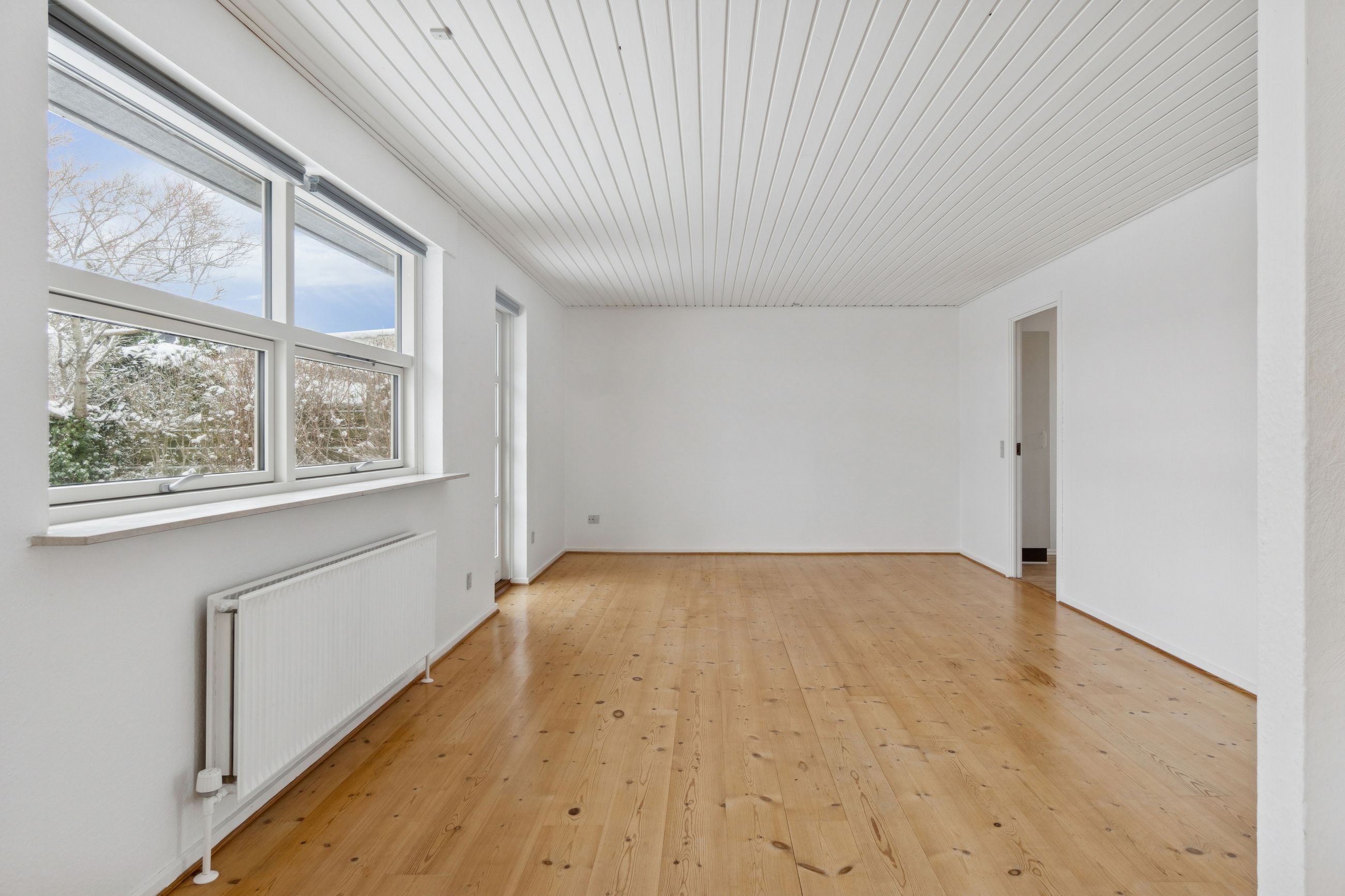 Boligen rummer et lyst og indbydende opholdsrum med plads til både spise- og sofagruppe, hvor de store vinduespartier giver et dejligt lysindfald. Køkkenet ligger i åben eller let adskilt forbindelse med stuen og har god skabsplads og funktionel indretning.