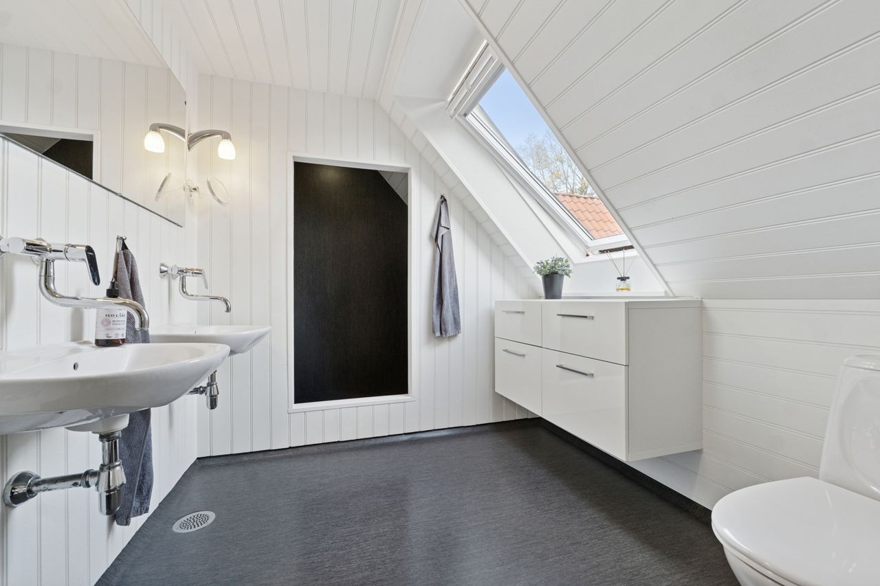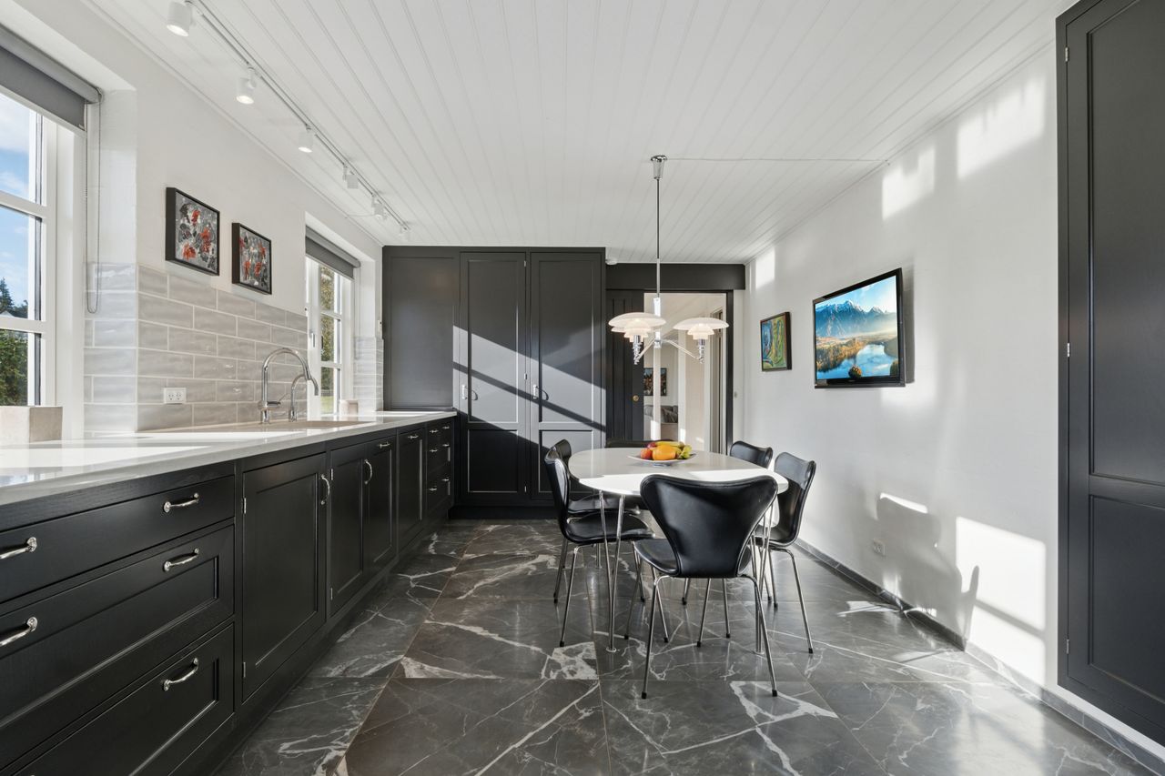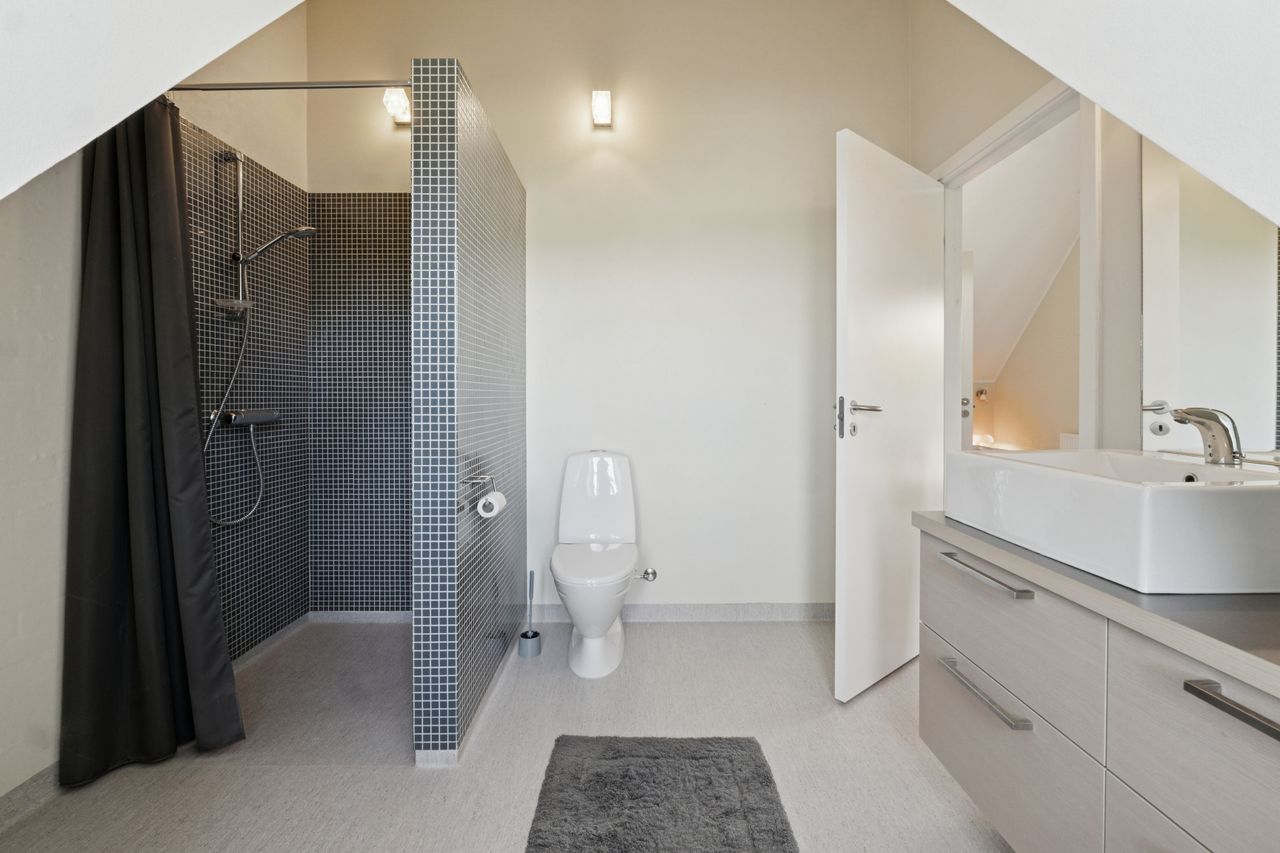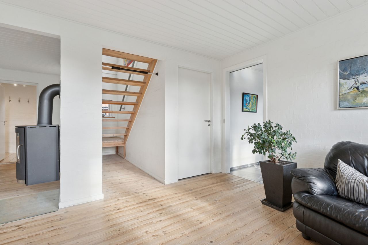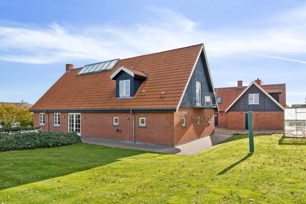 Ejendommens boligdel fremstår indbydende og funktionel med en gennemtænkt planløsning, hvor hver kvadratmeter er udnyttet optimalt. I stueplan mødes du af et stilrent køkken, der smukt komplementerer husets arkitektoniske udtryk – et naturligt samlingspunkt for både hverdag og gæster. Herfra er der adgang til en lys og rummelig stue, hvor store vinduespartier trækker naturen helt ind og skaber en behagelig atmosfære. Et praktisk værelse, et pænt badeværelse samt et funktionelt grovkøkken/bryggers fuldender etagerne og gør hverdagen nem og bekvem. På første sal finder du fire lyse og indbydende værelser samt et badeværelse i samme stilrene materialer. Etagen fremstår både praktisk og harmonisk, med et fantastisk lysindfald, der giver rummene en luftig og behagelig fornemmelse. Her får du en anvendelig førstesal, der passer perfekt til børneafdeling, kontor eller gæsteværelser – alt efter behov.