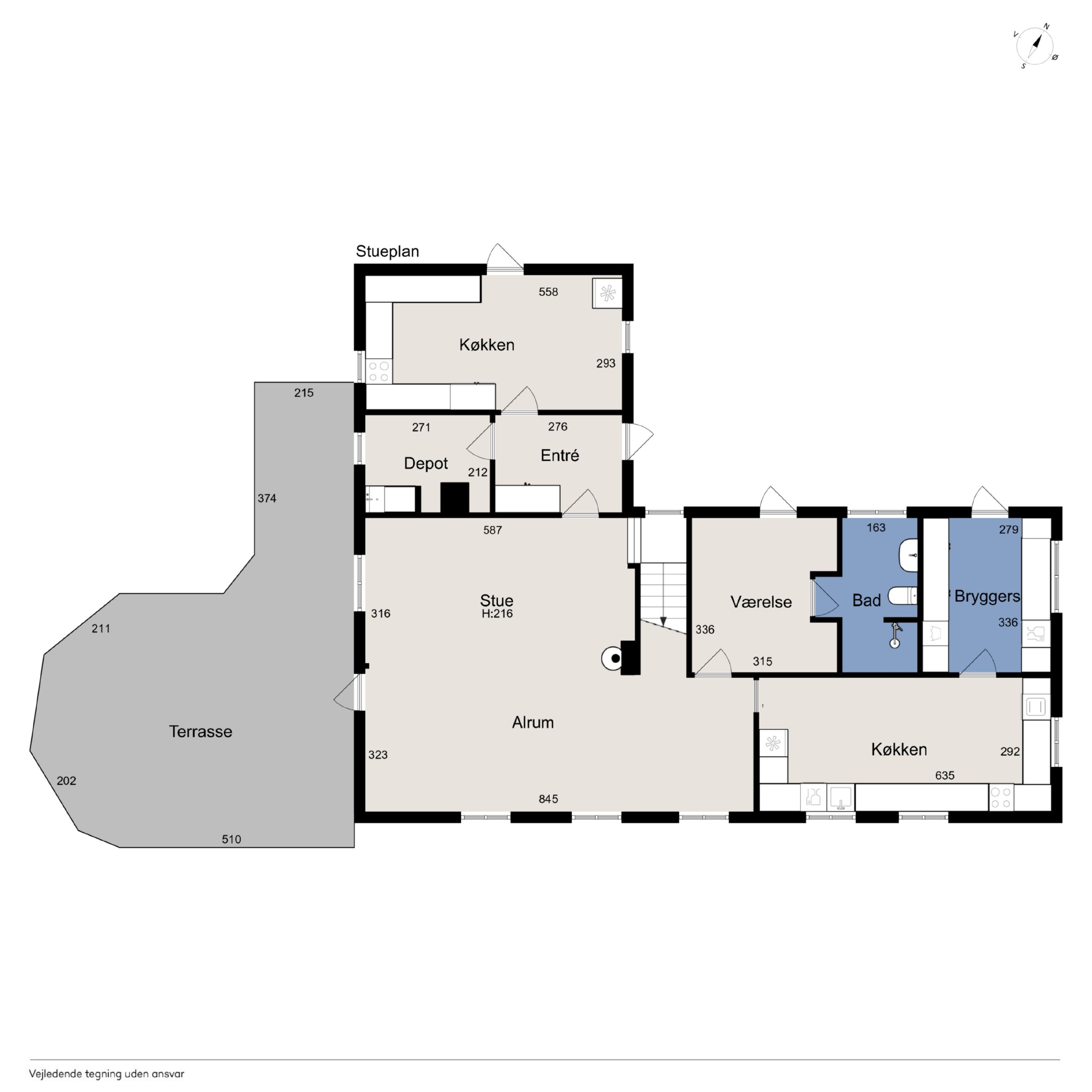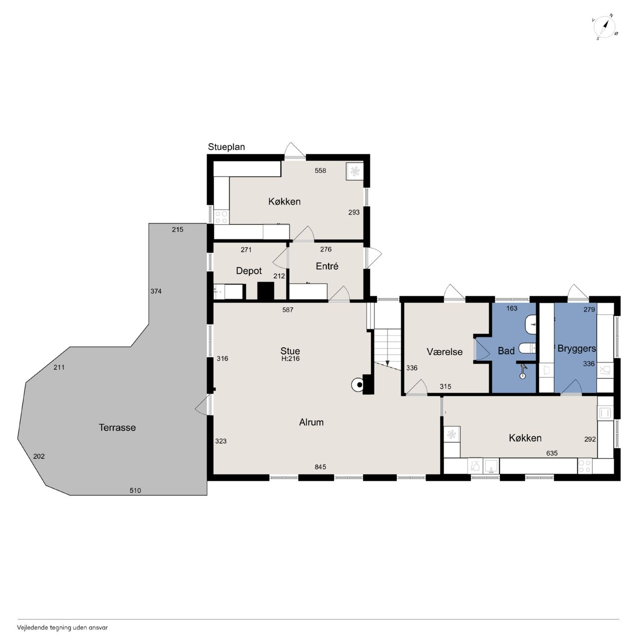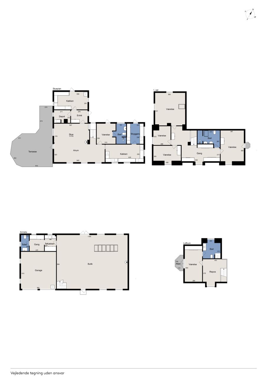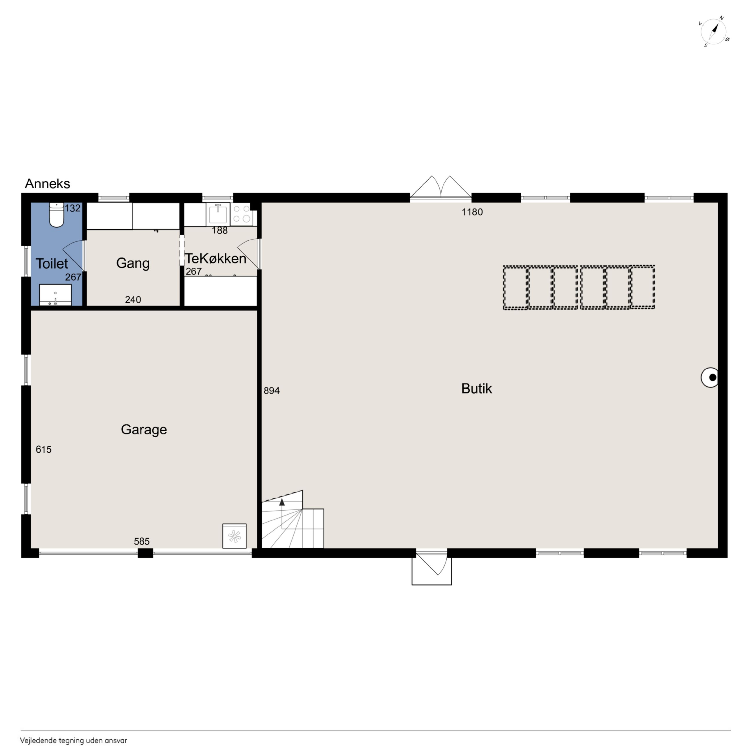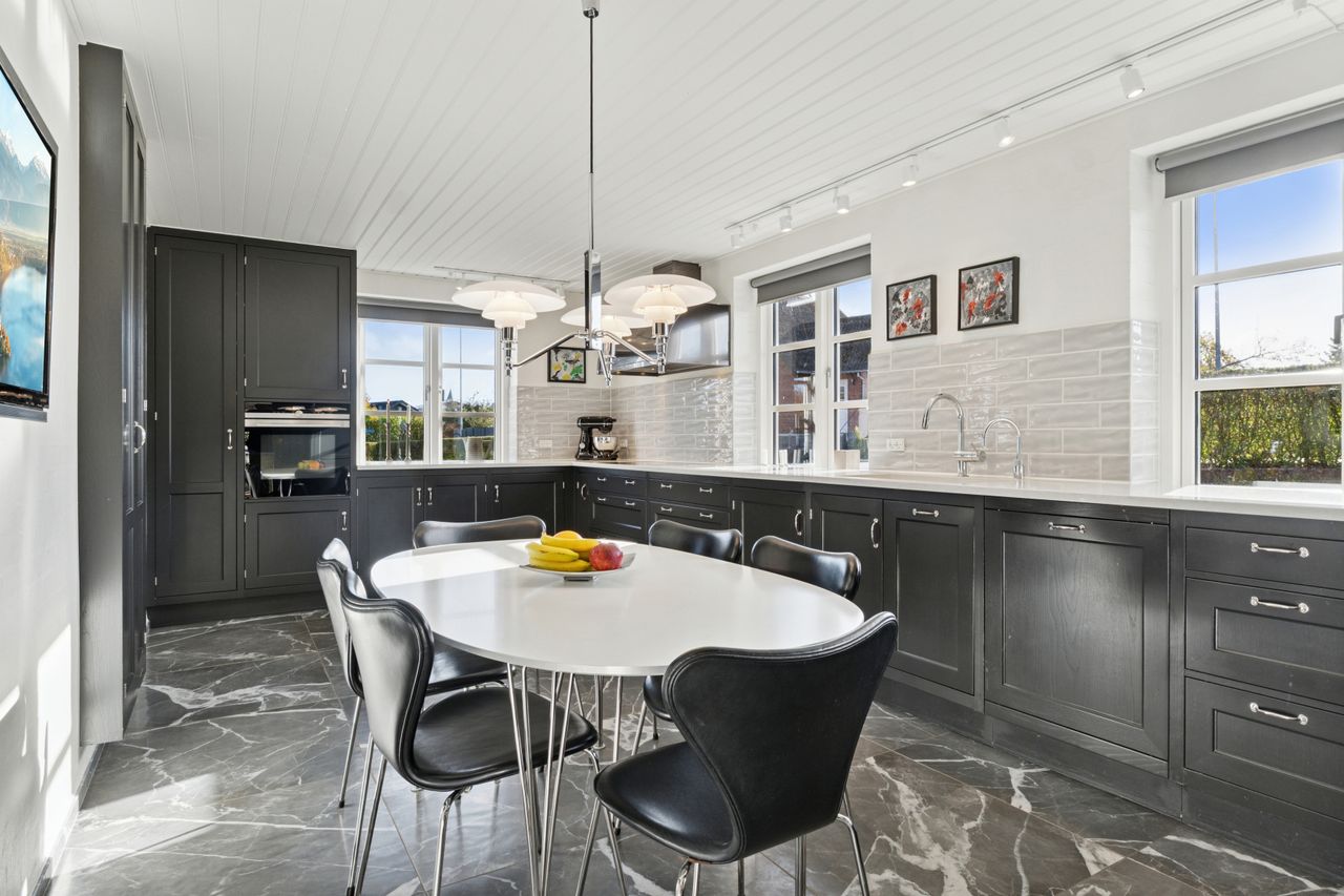 Ejendommens boligdel fremstår indbydende og funktionel med en gennemtænkt planløsning, hvor hver kvadratmeter er udnyttet optimalt. I stueplan mødes du af et stilrent køkken, der smukt komplementerer husets arkitektoniske udtryk – et naturligt samlingspunkt for både hverdag og gæster. Herfra er der adgang til en lys og rummelig stue, hvor store vinduespartier trækker naturen helt ind og skaber en behagelig atmosfære. Et praktisk værelse, et pænt badeværelse samt et funktionelt grovkøkken/bryggers fuldender etagerne og gør hverdagen nem og bekvem. På første sal finder du fire lyse og indbydende værelser samt et badeværelse i samme stilrene materialer. Etagen fremstår både praktisk og harmonisk, med et fantastisk lysindfald, der giver rummene en luftig og behagelig fornemmelse. Her får du en anvendelig førstesal, der passer perfekt til børneafdeling, kontor eller gæsteværelser – alt efter behov.