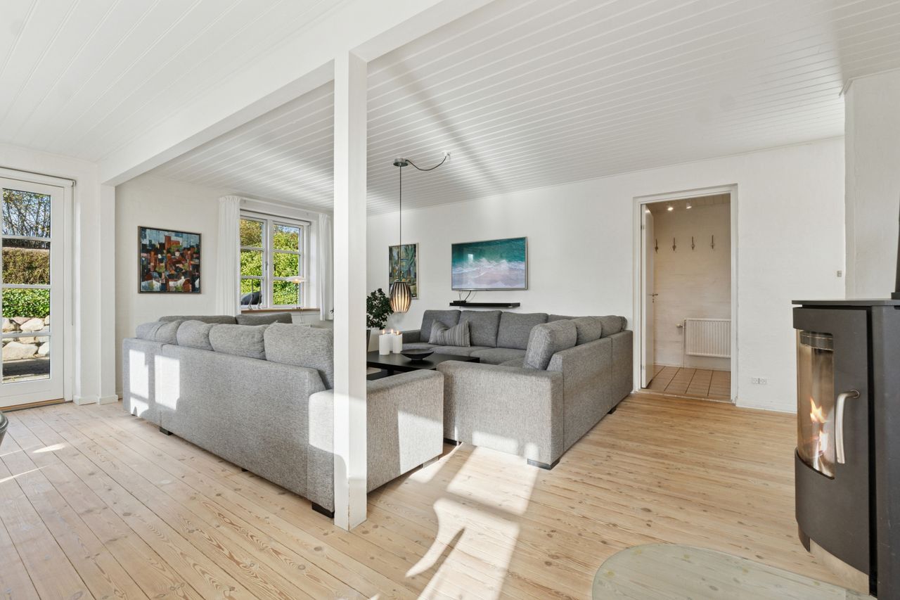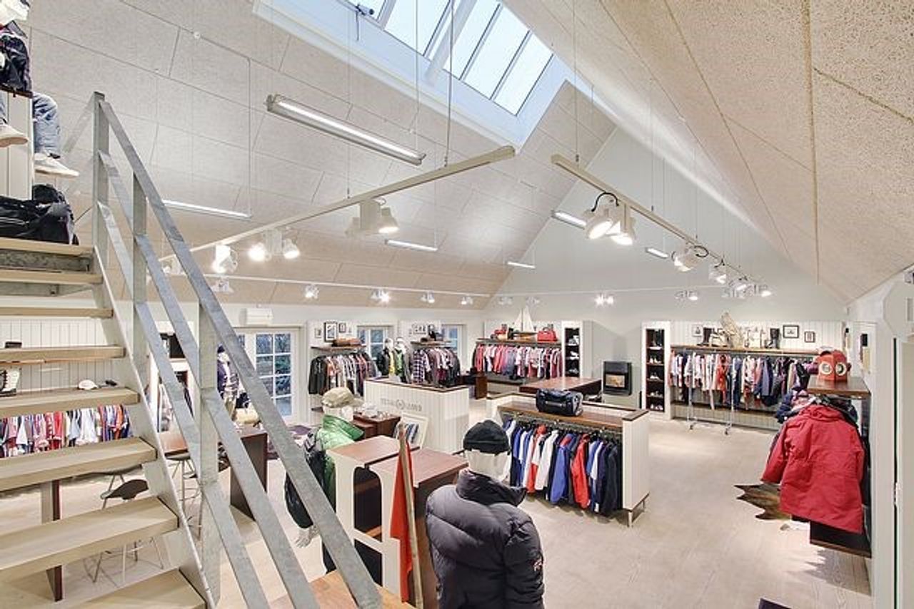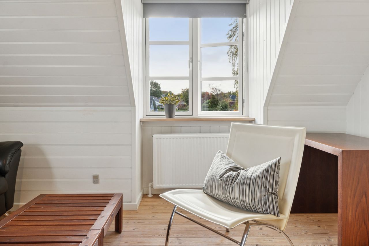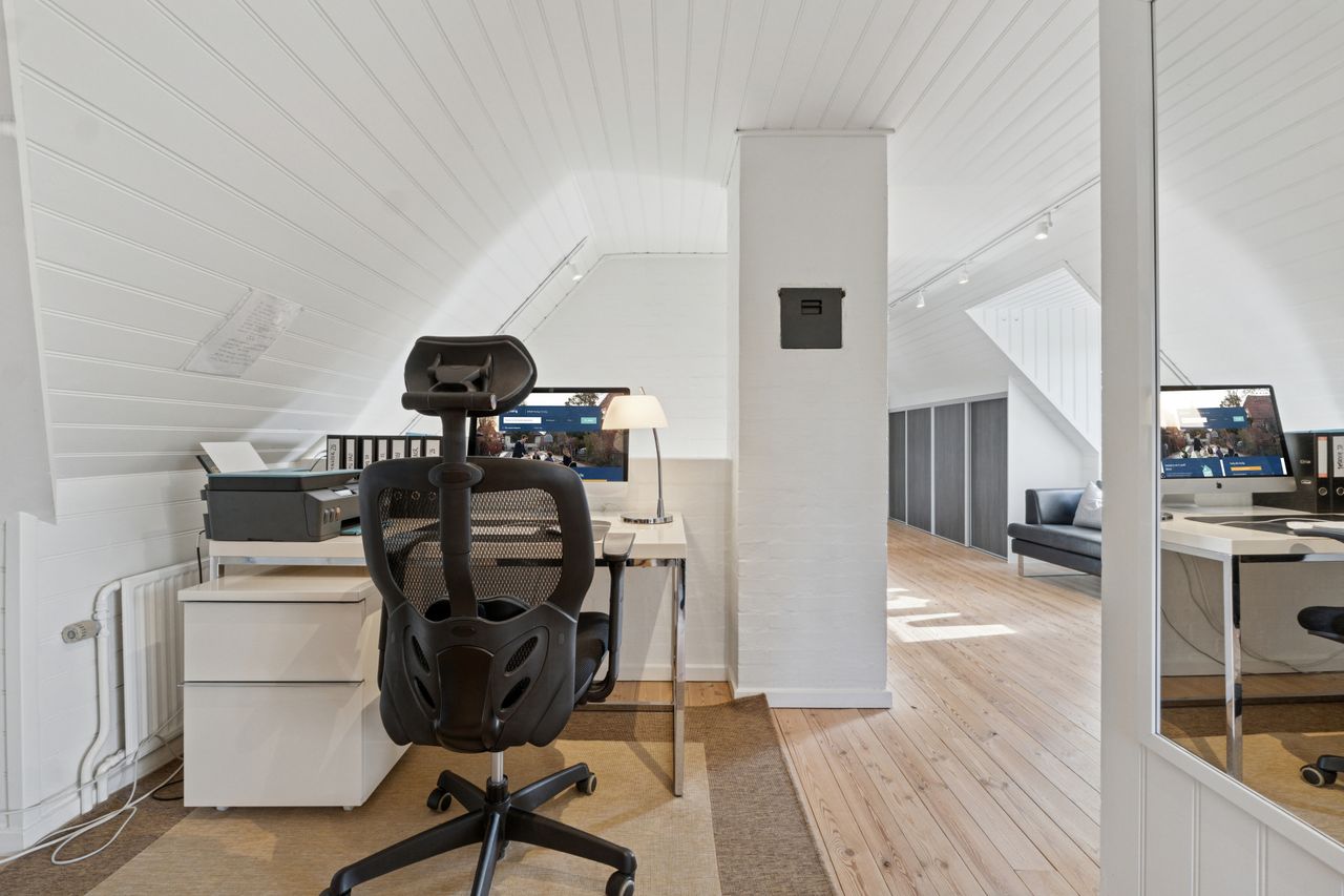 Den sekundære bygning, oprindeligt tænkt som showroom og kontor, er et særligt kapitel for sig. Med sin åbne planløsning, store vinduespartier og lysindfald skaber den et imponerende og inspirerende rum, som både kan anvendes til liberalt erhverv, atelier, galleri, detailhandel eller kontormiljø. Bygningen fremstår som et arkitektonisk værk i sig selv – et fleksibelt og stemningsfuldt rum, hvor Truelsens formsprog virkelig træder frem. De naturlige materialer, de rene linjer og den afstemte proportionering gør showroomet ideelt til både arbejde, udstilling og oplevelse. Her kan du forene erhverv og livsstil på en måde, der sjældent ses. Bemærk flot energimærke A2015 for denne bygning!