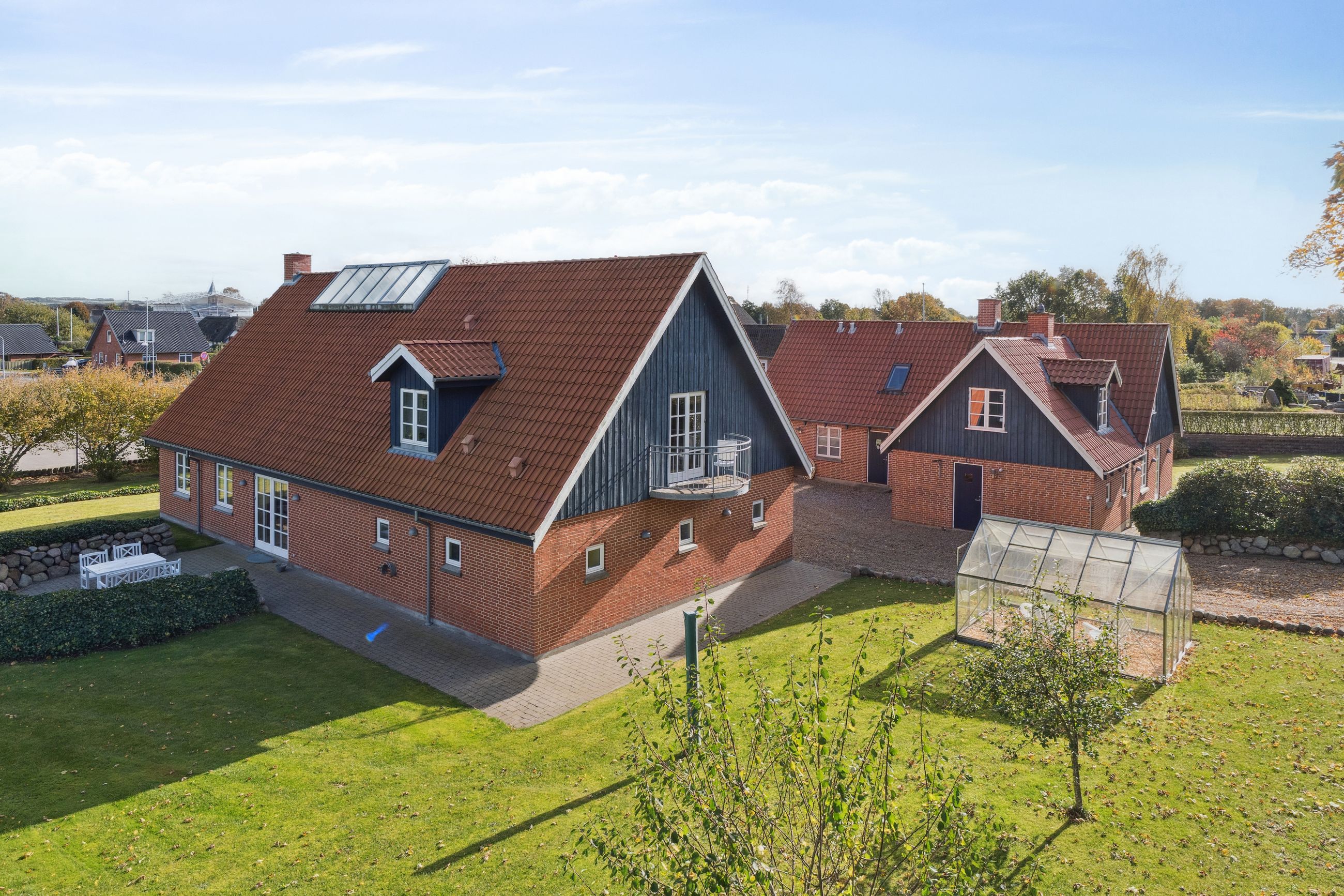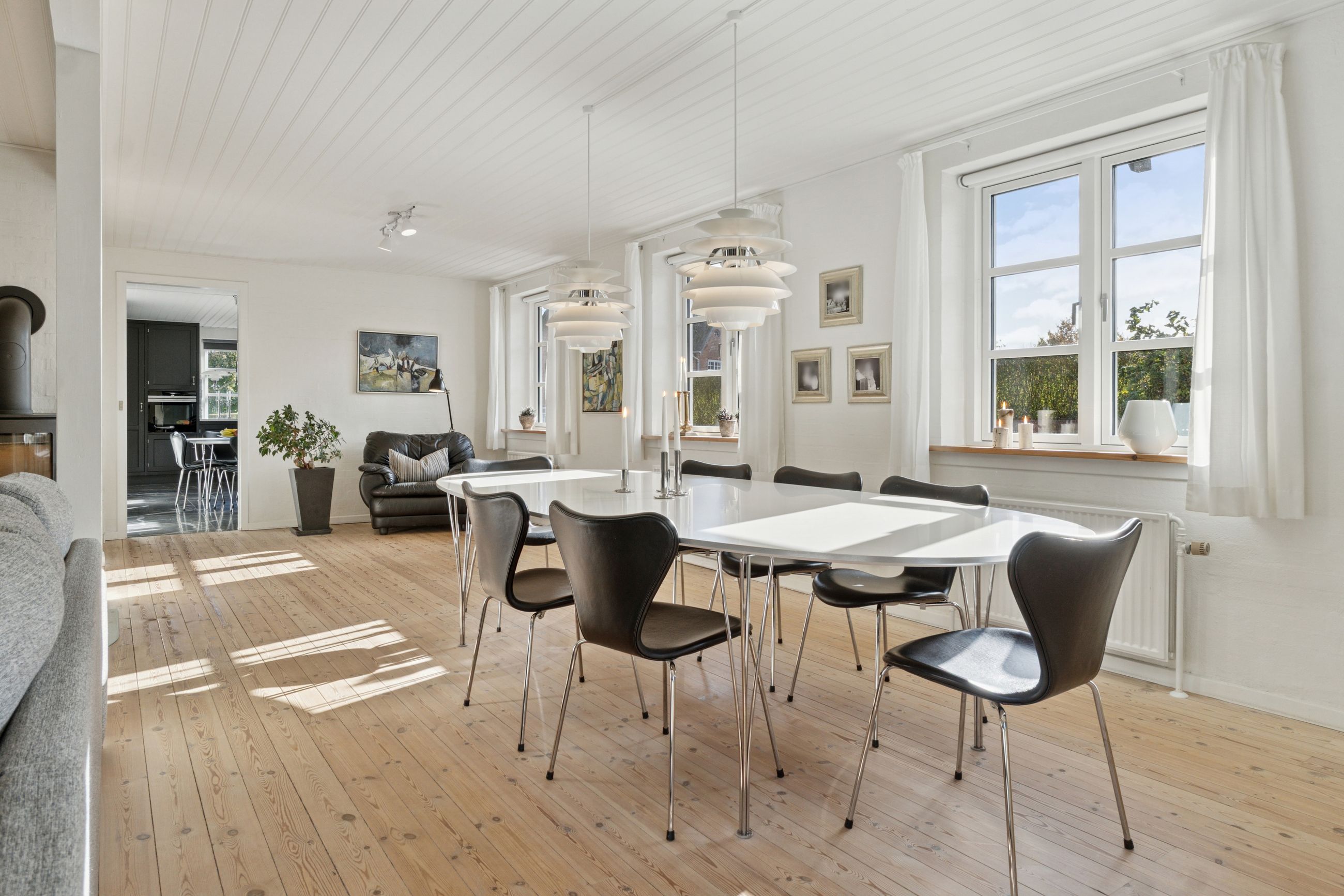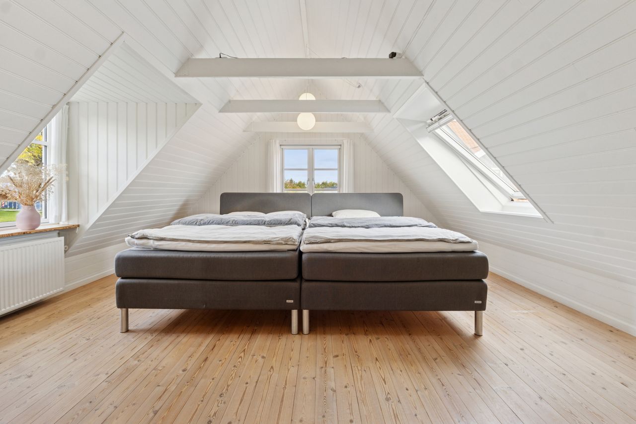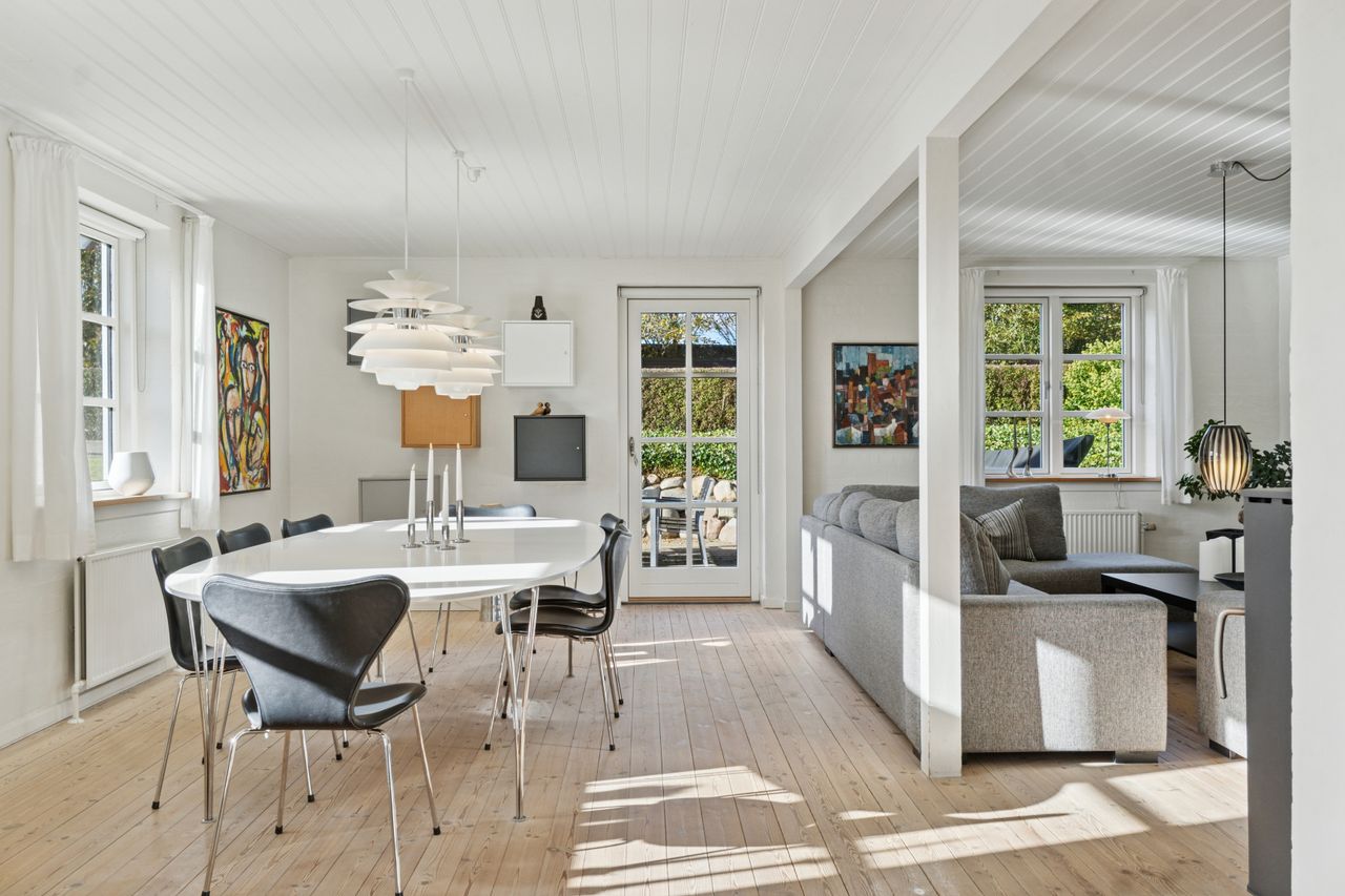 Den sekundære bygning, oprindeligt tænkt som showroom og kontor, er et særligt kapitel for sig. Med sin åbne planløsning, store vinduespartier og lysindfald skaber den et imponerende og inspirerende rum, som både kan anvendes til liberalt erhverv, atelier, galleri, detailhandel eller kontormiljø. Bygningen fremstår som et arkitektonisk værk i sig selv – et fleksibelt og stemningsfuldt rum, hvor Truelsens formsprog virkelig træder frem. De naturlige materialer, de rene linjer og den afstemte proportionering gør showroomet ideelt til både arbejde, udstilling og oplevelse. Her kan du forene erhverv og livsstil på en måde, der sjældent ses. Bemærk flot energimærke A2015 for denne bygning!