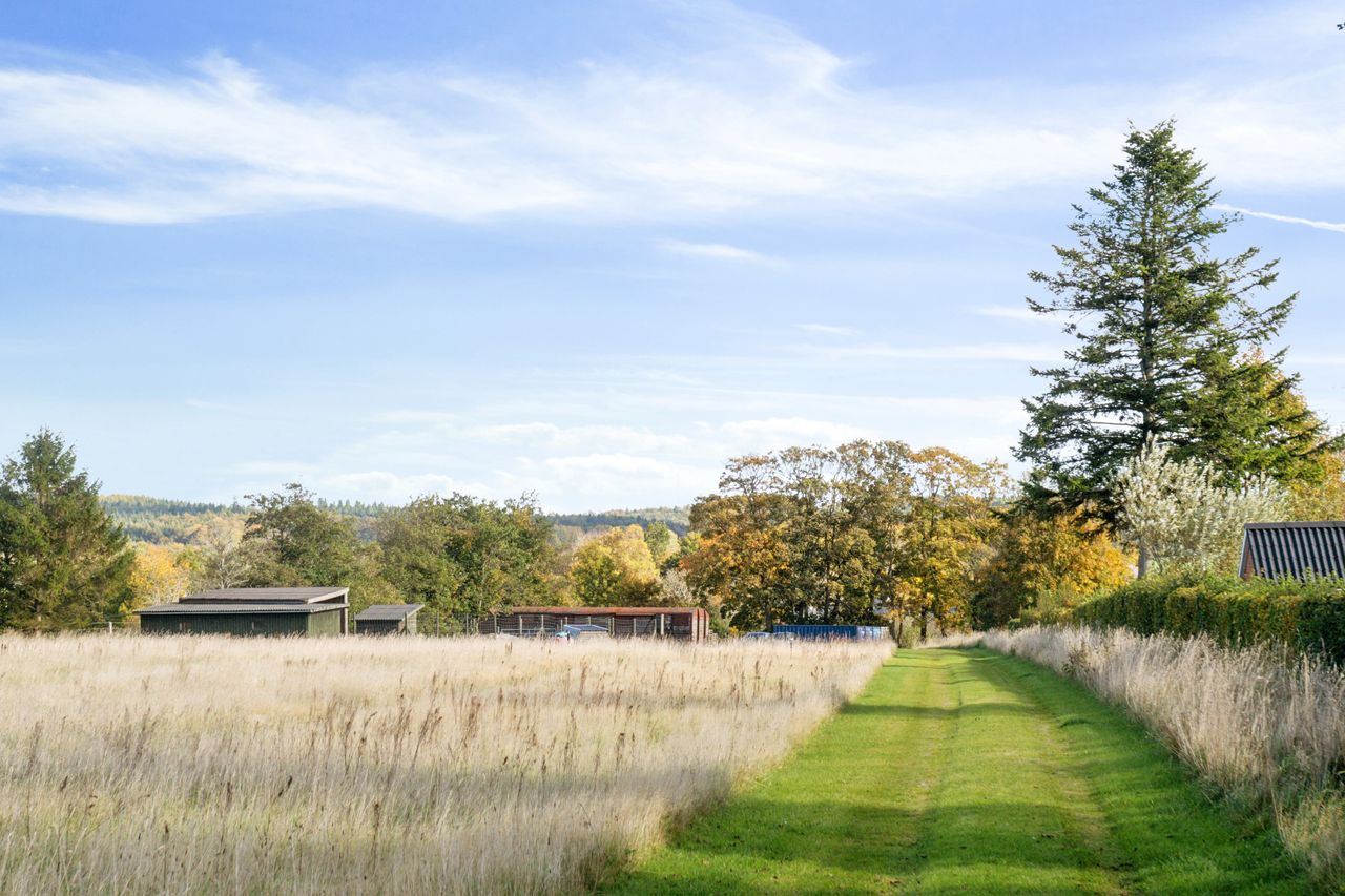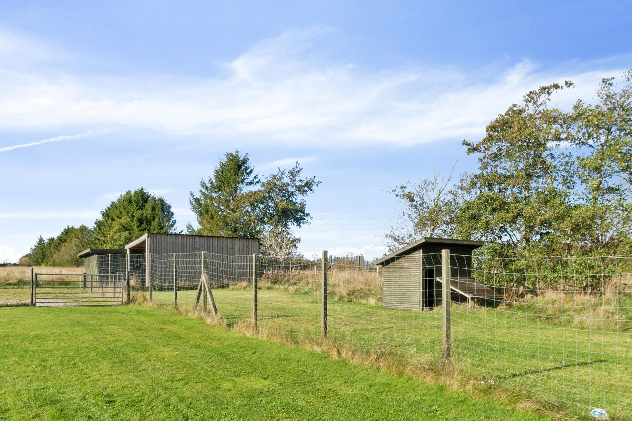 Den store grund er anlagt med fokus på nem vedligeholdelse – et miks af have, eng, frugttræer og naturlige læhegn. Her er mulighed for hestehold, privat hundeskov, ATV-bane eller driving range – kun fantasien sætter grænser. Ejendommen ligger tilbagetrukket med privat vej og tre separate indkørsler, men alligevel centralt i Voel – en enklave omgivet af flotte, nyere kvalitetsboliger, som alle stammer fra denne oprindelige ejendom.