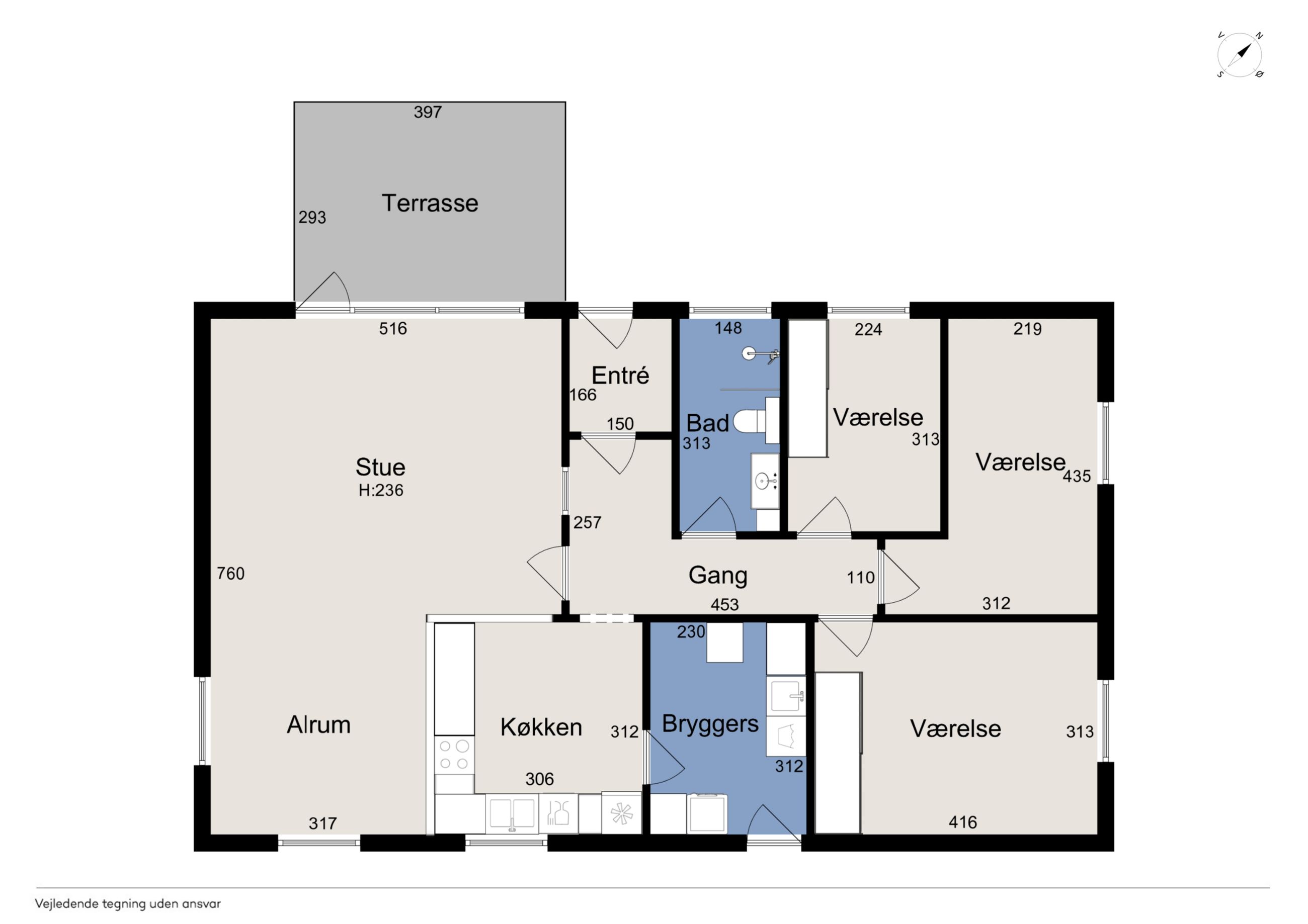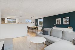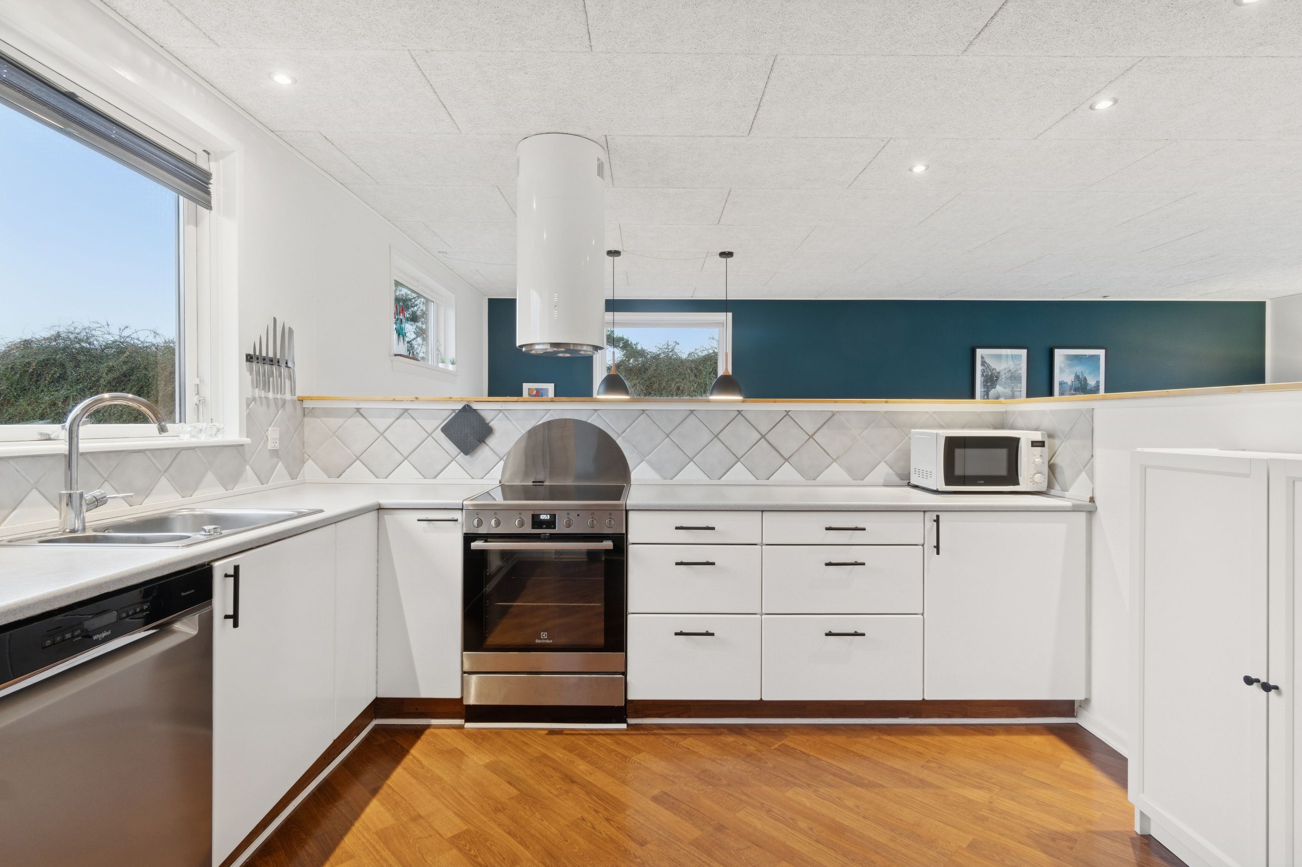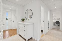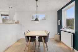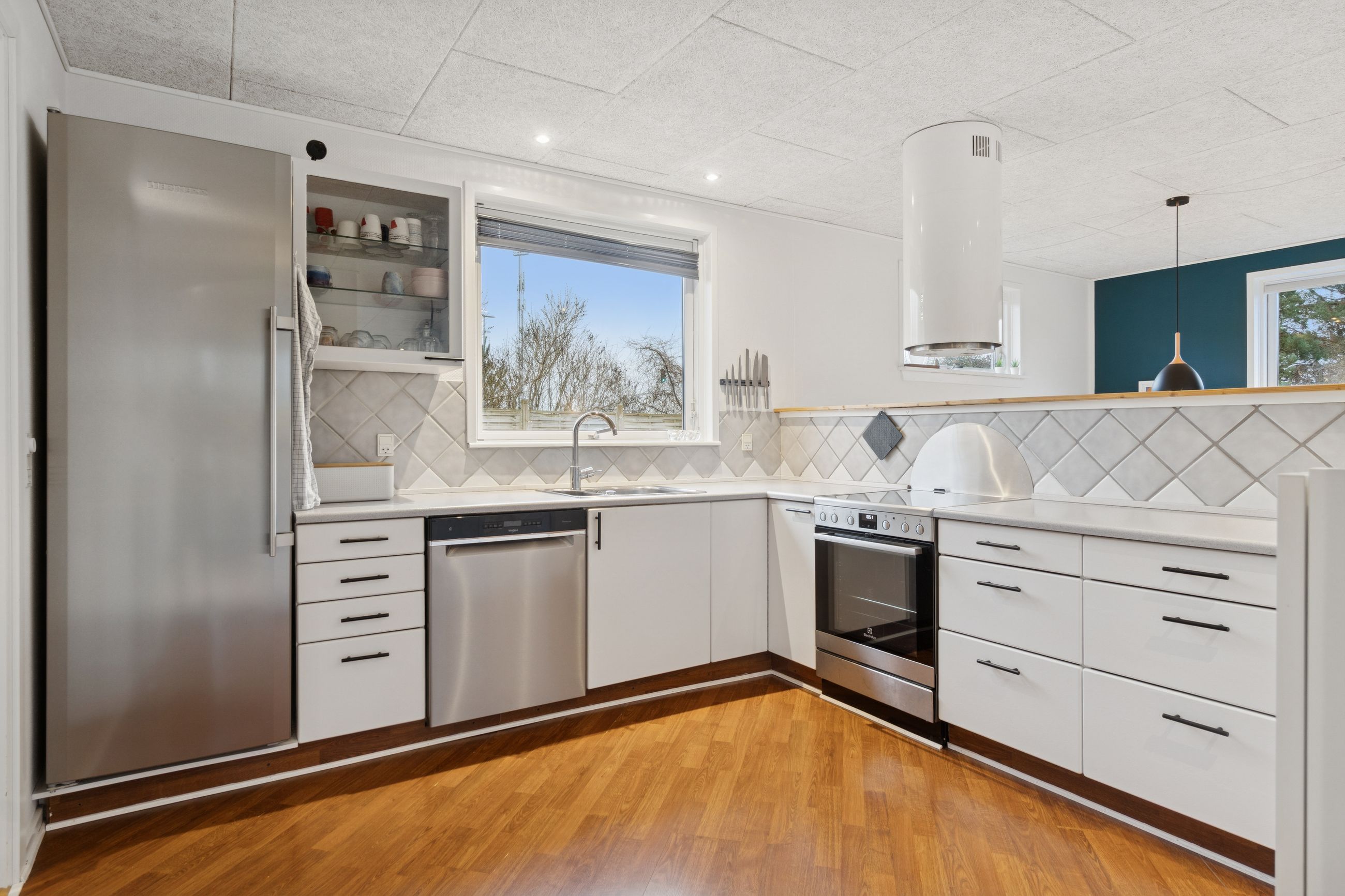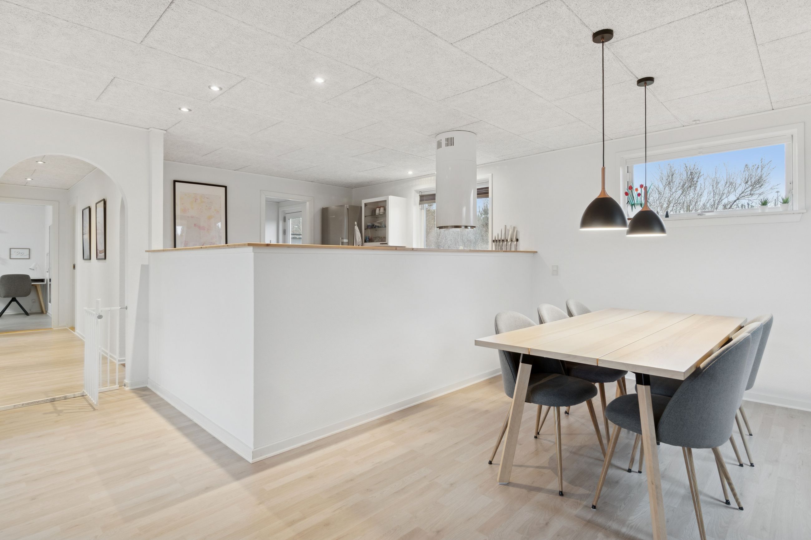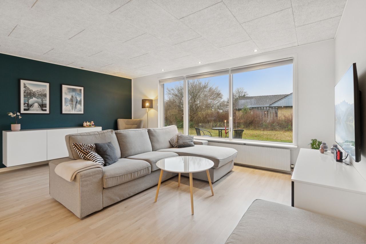 Indenfor møder du en lys og behagelig atmosfære, hvor den sammenhængende planløsning skaber et naturligt flow mellem rummene. Stuen og køkkenet ligger praktisk placeret side om side og giver mulighed for både hyggelige opholdsstunder og social madlavning. De store vinduespartier sørger for et dejligt dagslys, som gør opholdsarealerne varme og imødekommende.