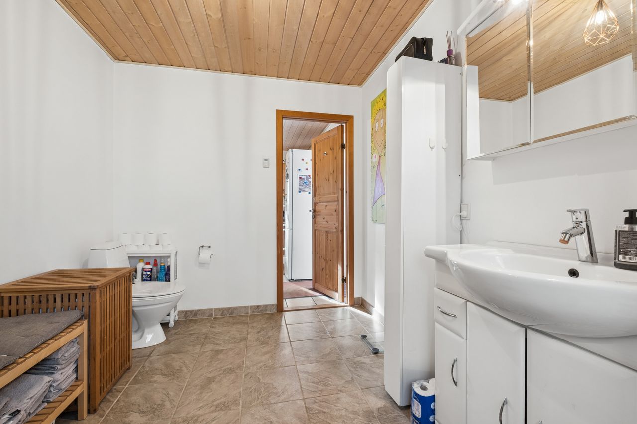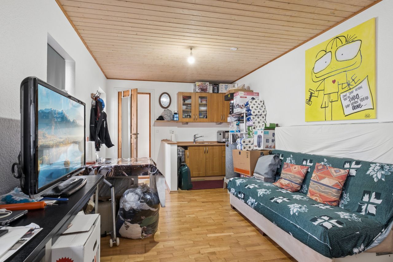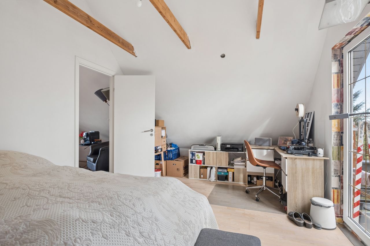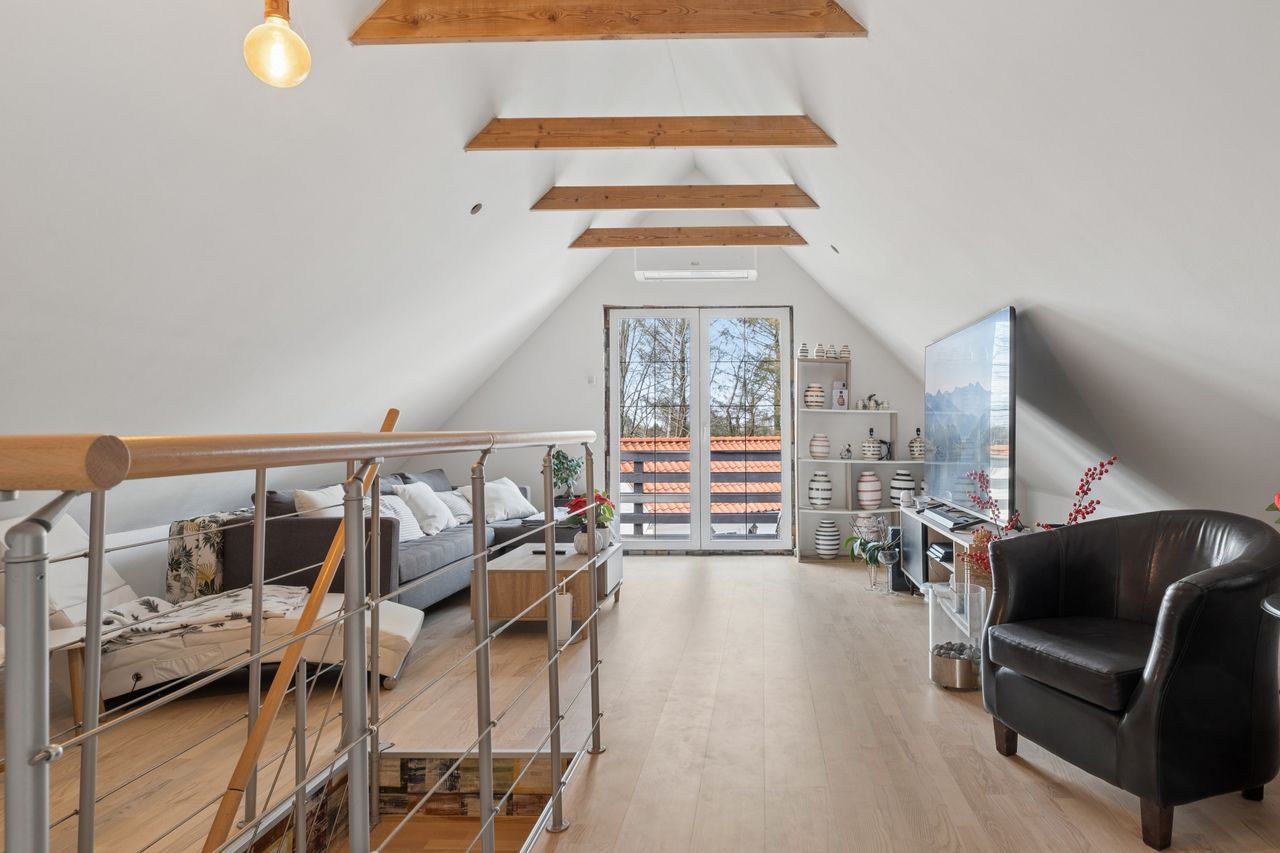 På førstesalen finder I en ekstra stue med et dejligt lysindfald og direkte udgang til en skøn terrasse. Her er der god plads til ophold og hyggelige stunder, og samtidig er der mulighed for at etablere endnu et værelse, hvis behovet opstår. Et soveværelse fuldender etagen og understreger boligens fleksible indretning.