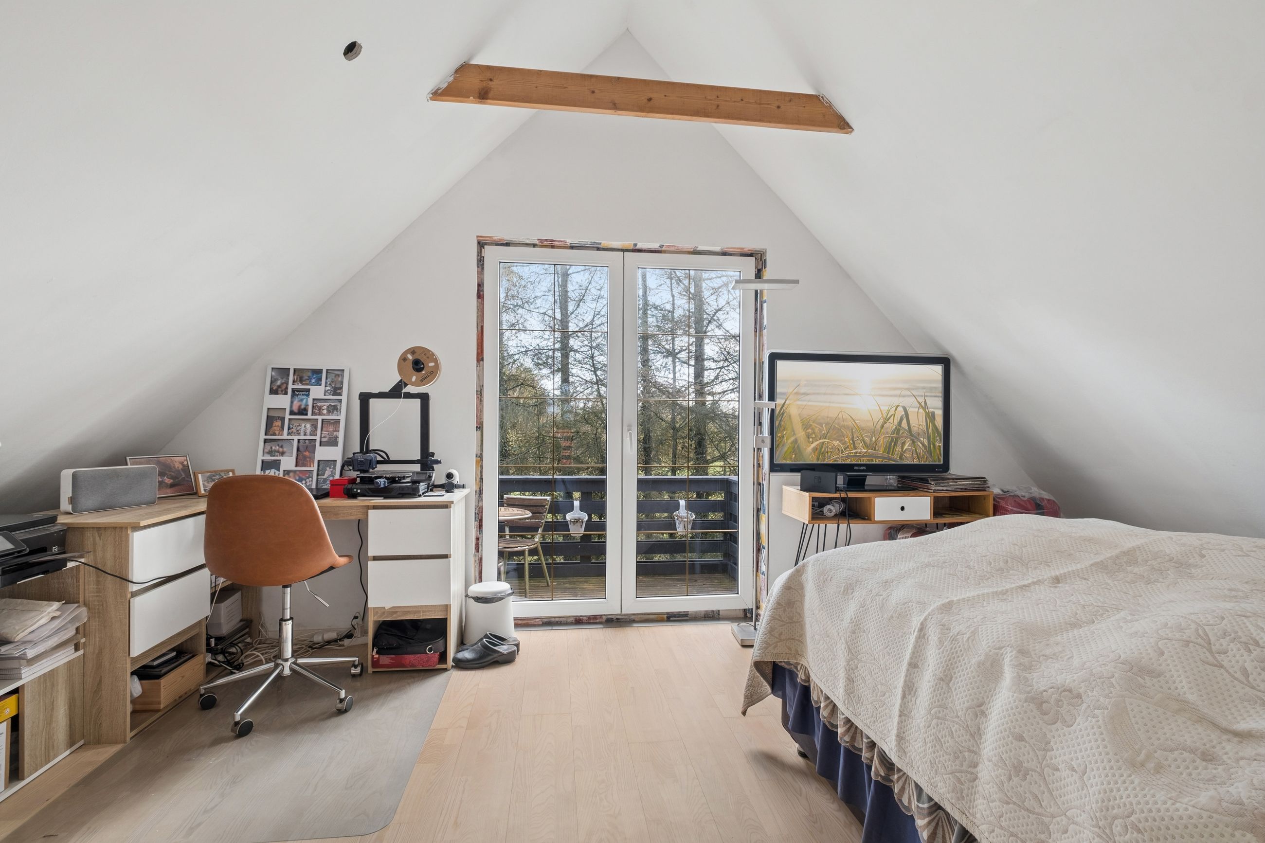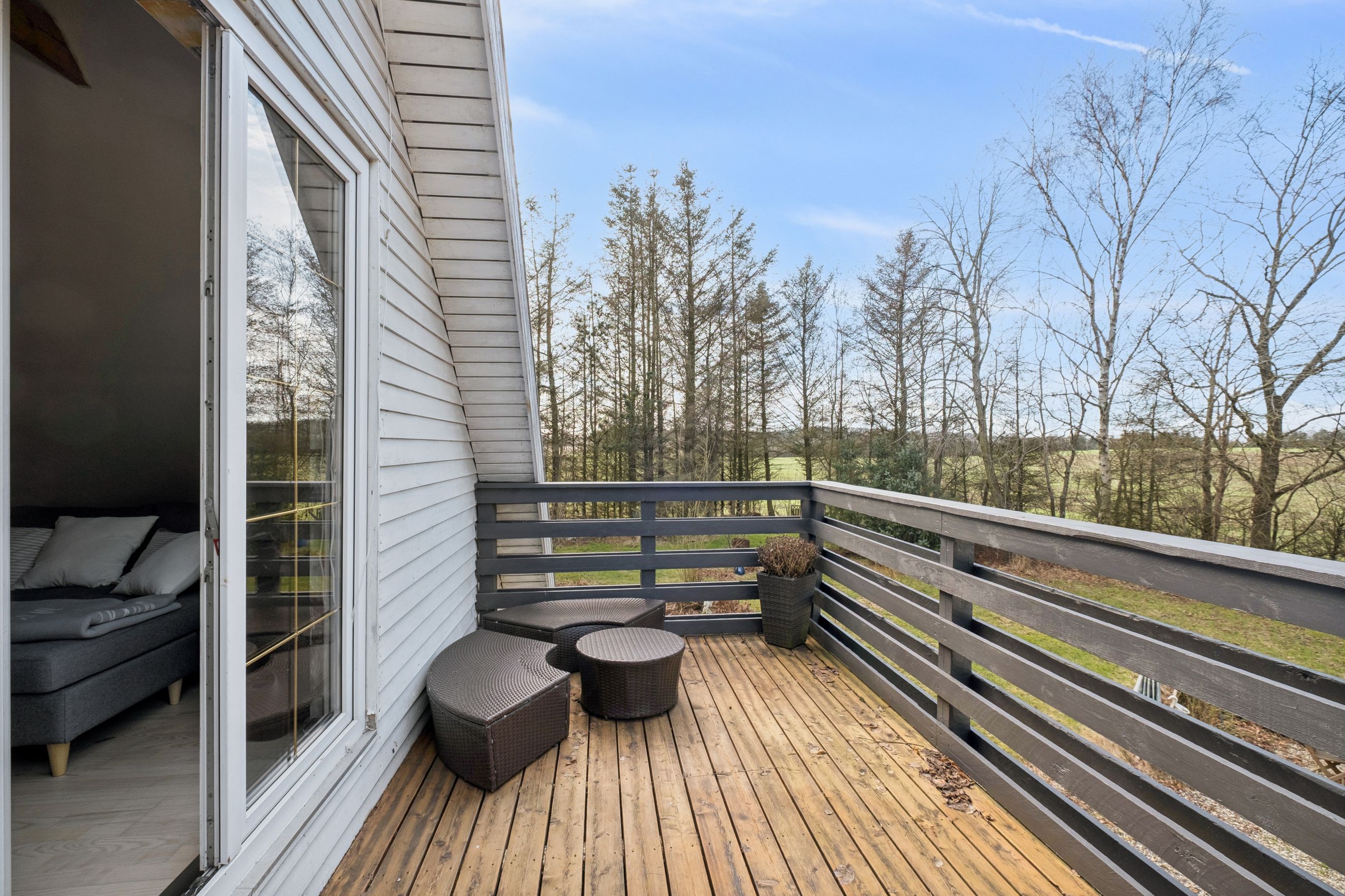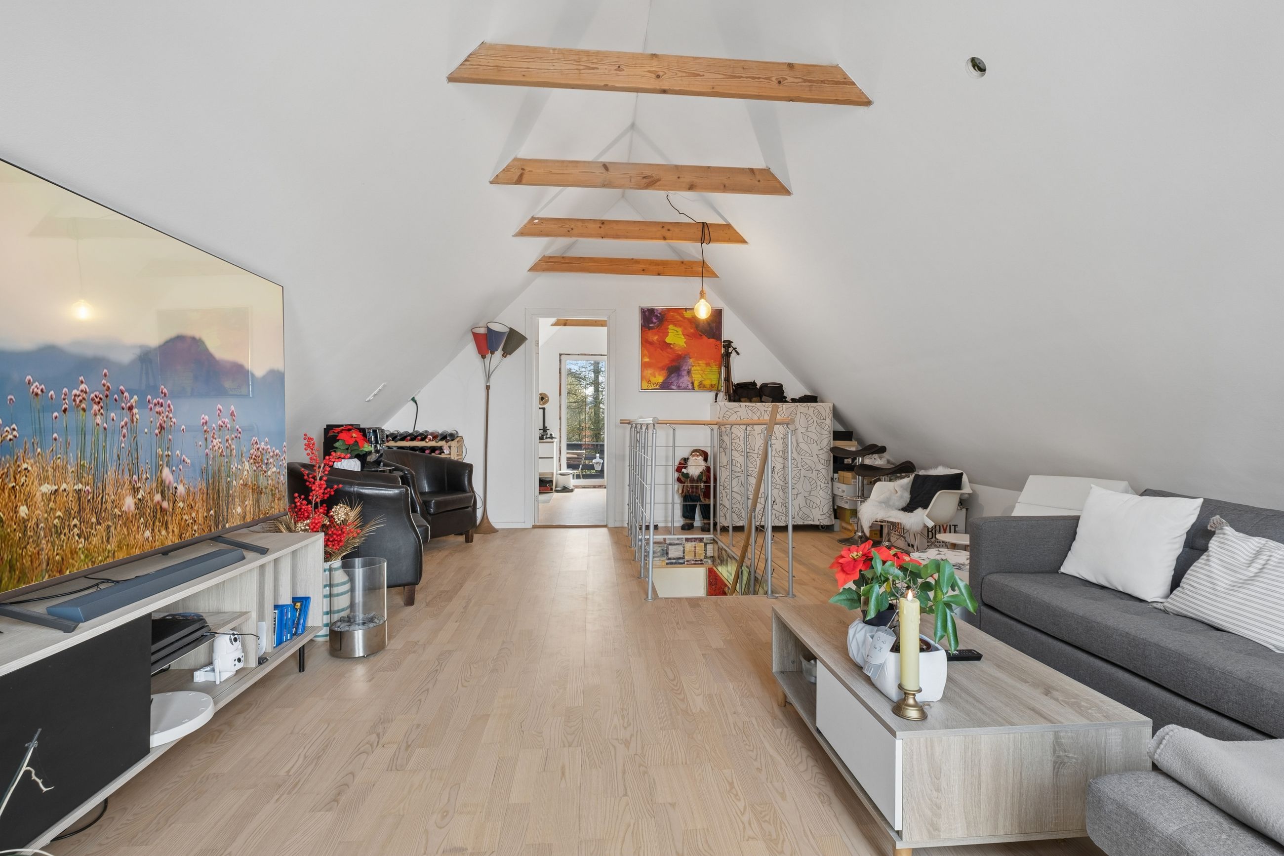 På førstesalen finder I en ekstra stue med et dejligt lysindfald og direkte udgang til en skøn terrasse. Her er der god plads til ophold og hyggelige stunder, og samtidig er der mulighed for at etablere endnu et værelse, hvis behovet opstår. Et soveværelse fuldender etagen og understreger boligens fleksible indretning.