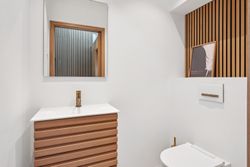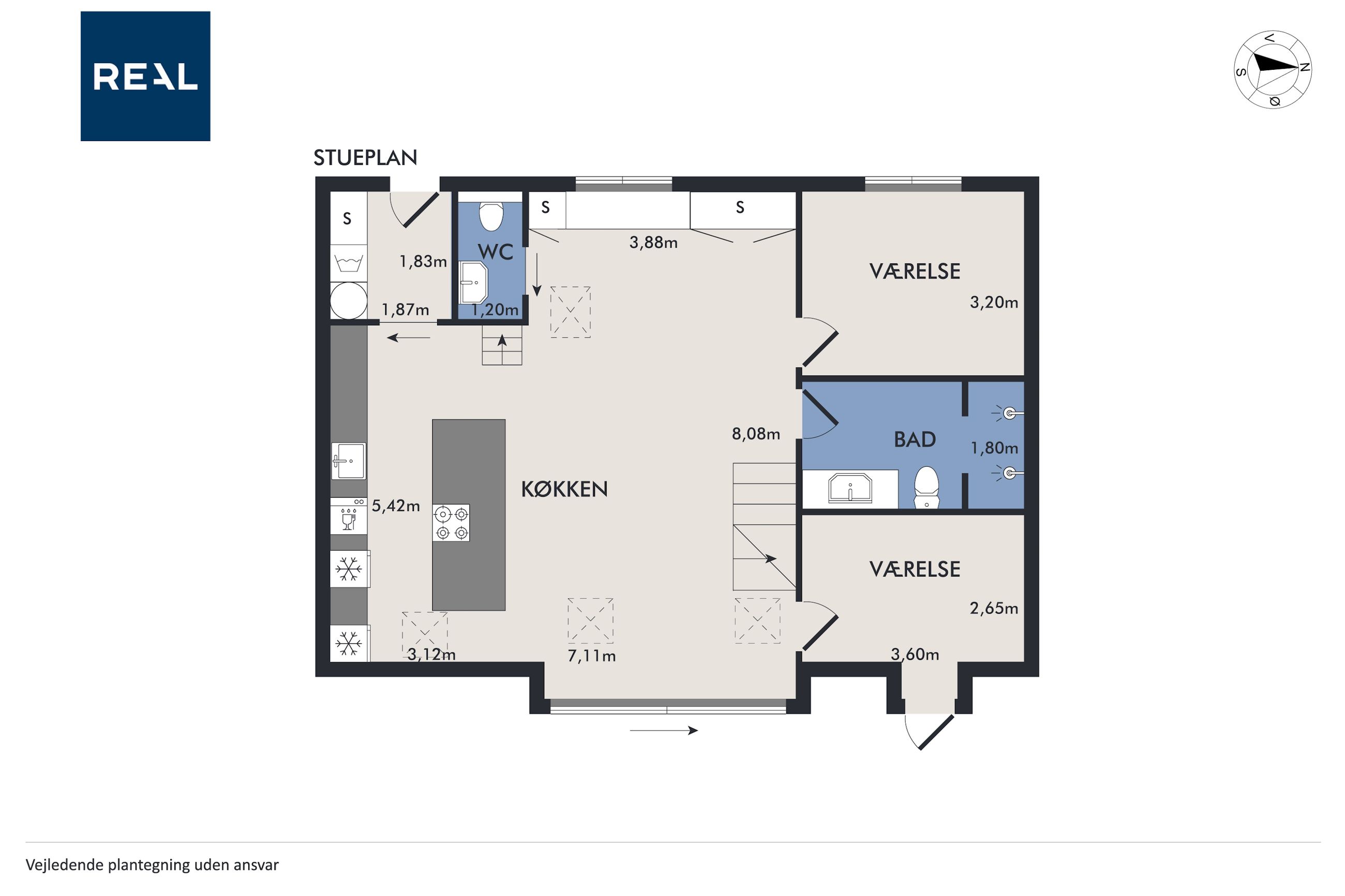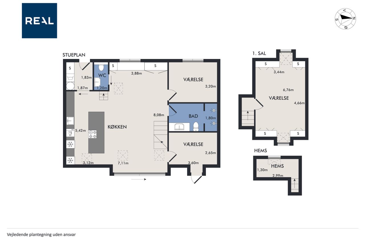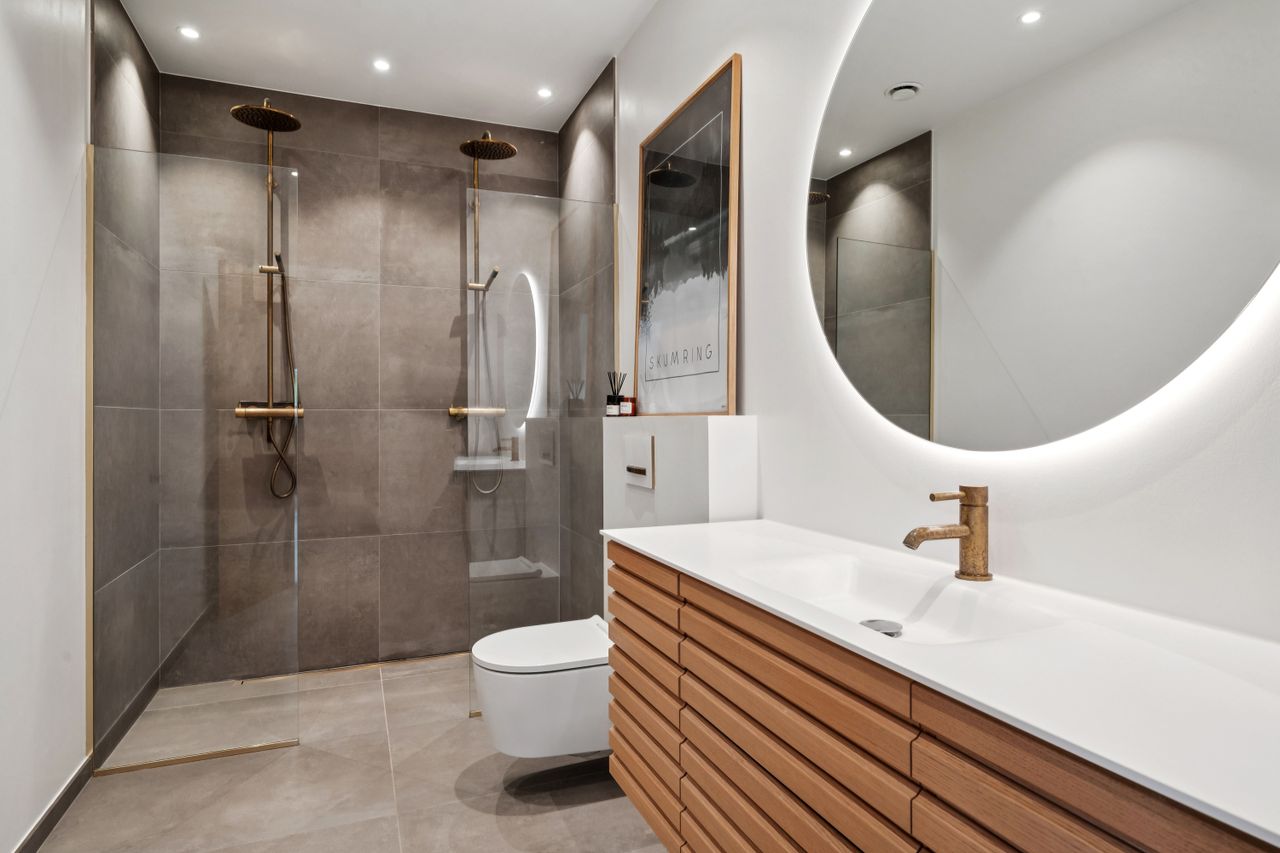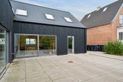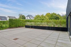 Boligen byder på tre rummelige værelser, hvoraf ét er placeret på førstesalen – ideelt som soveværelse eller privat kontor. Badeværelset er kompromisløst lækkert med dobbelt brus, og som en ekstra bonus får du også et stilfuldt gæstetoilet. Entréen er praktisk indrettet med bryggersfunktion, så hverdagen bliver nem og funktionel.