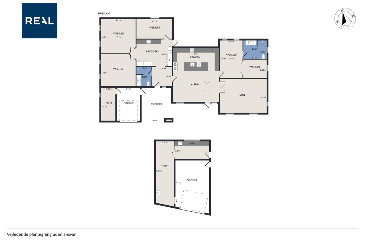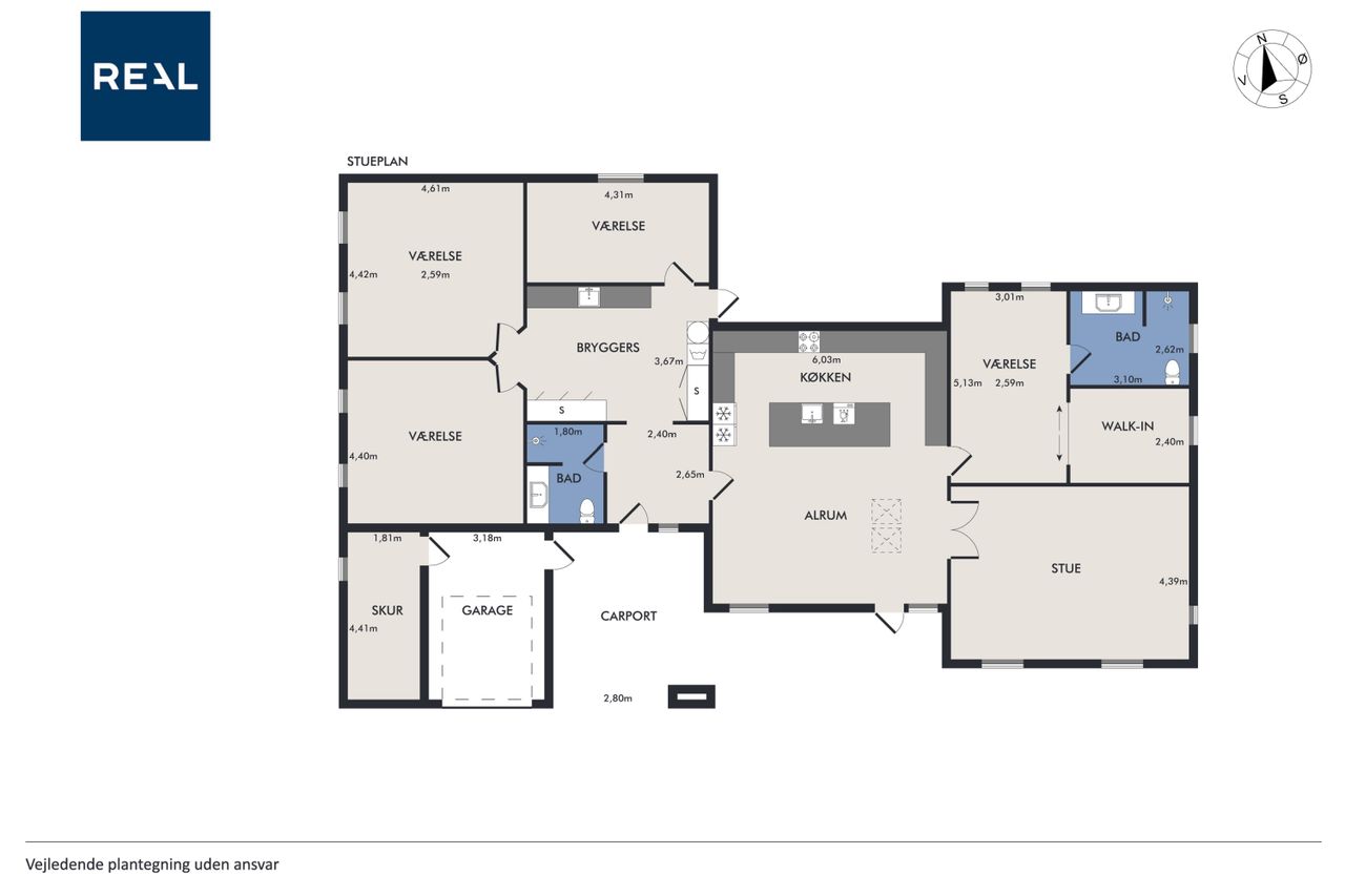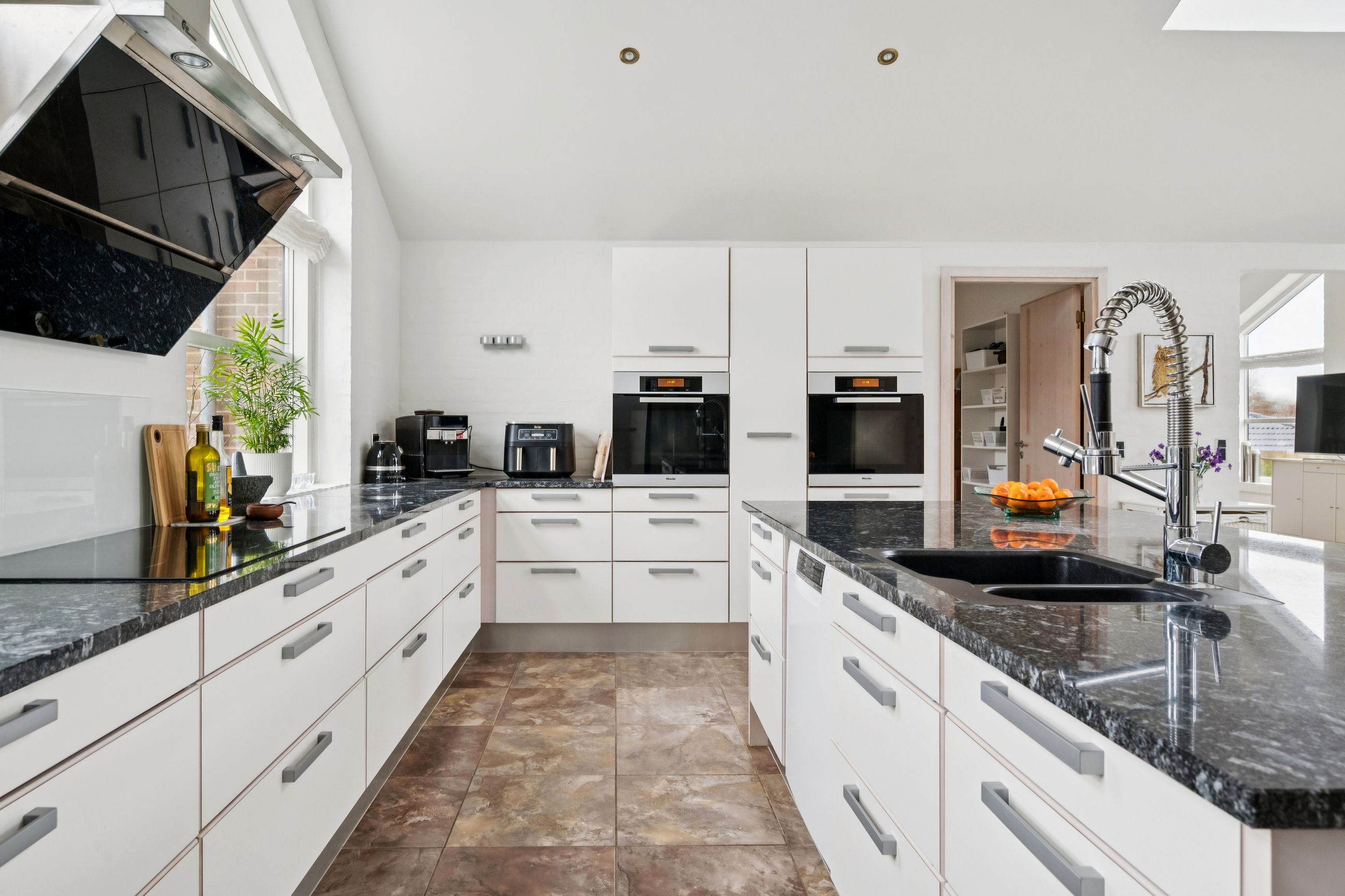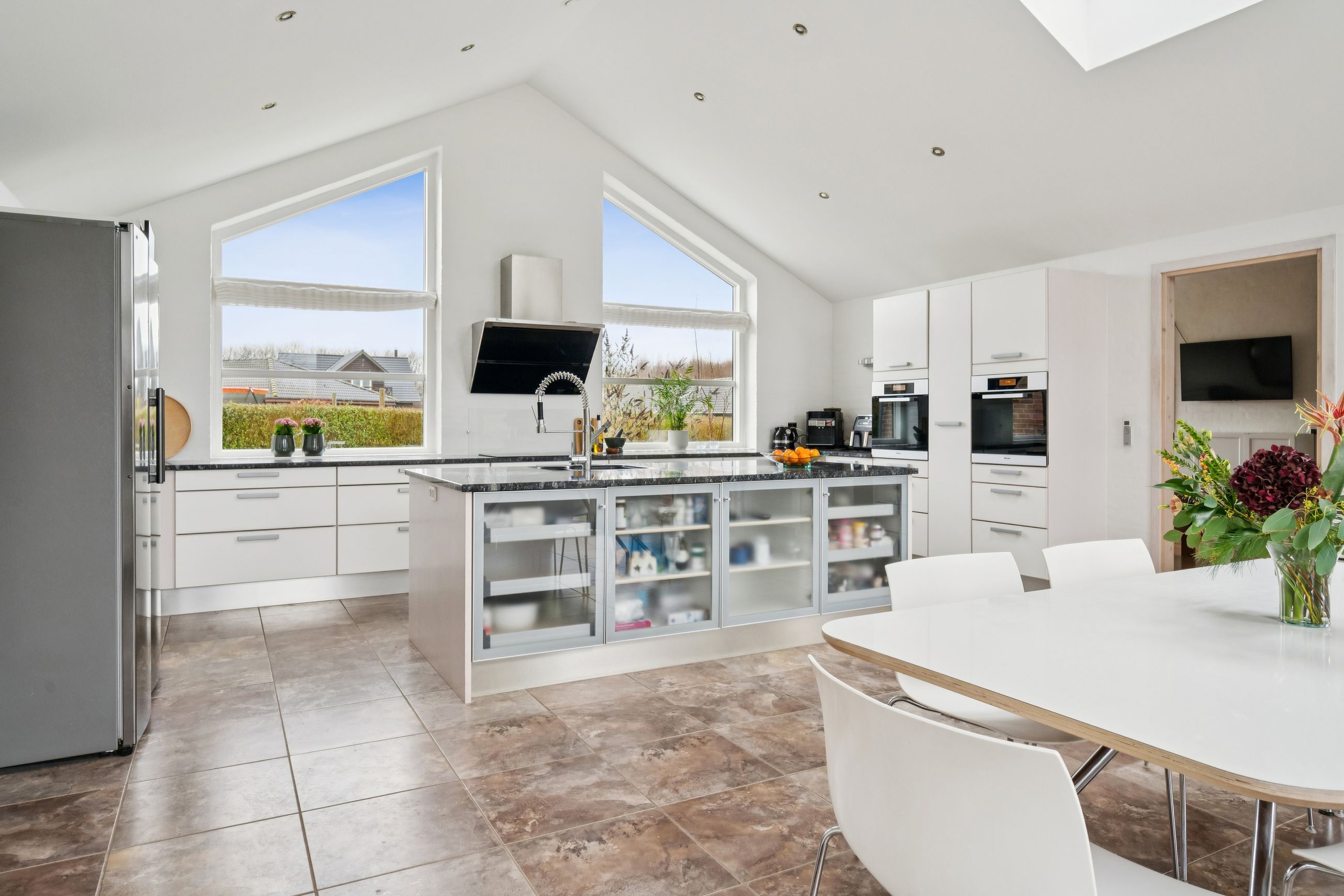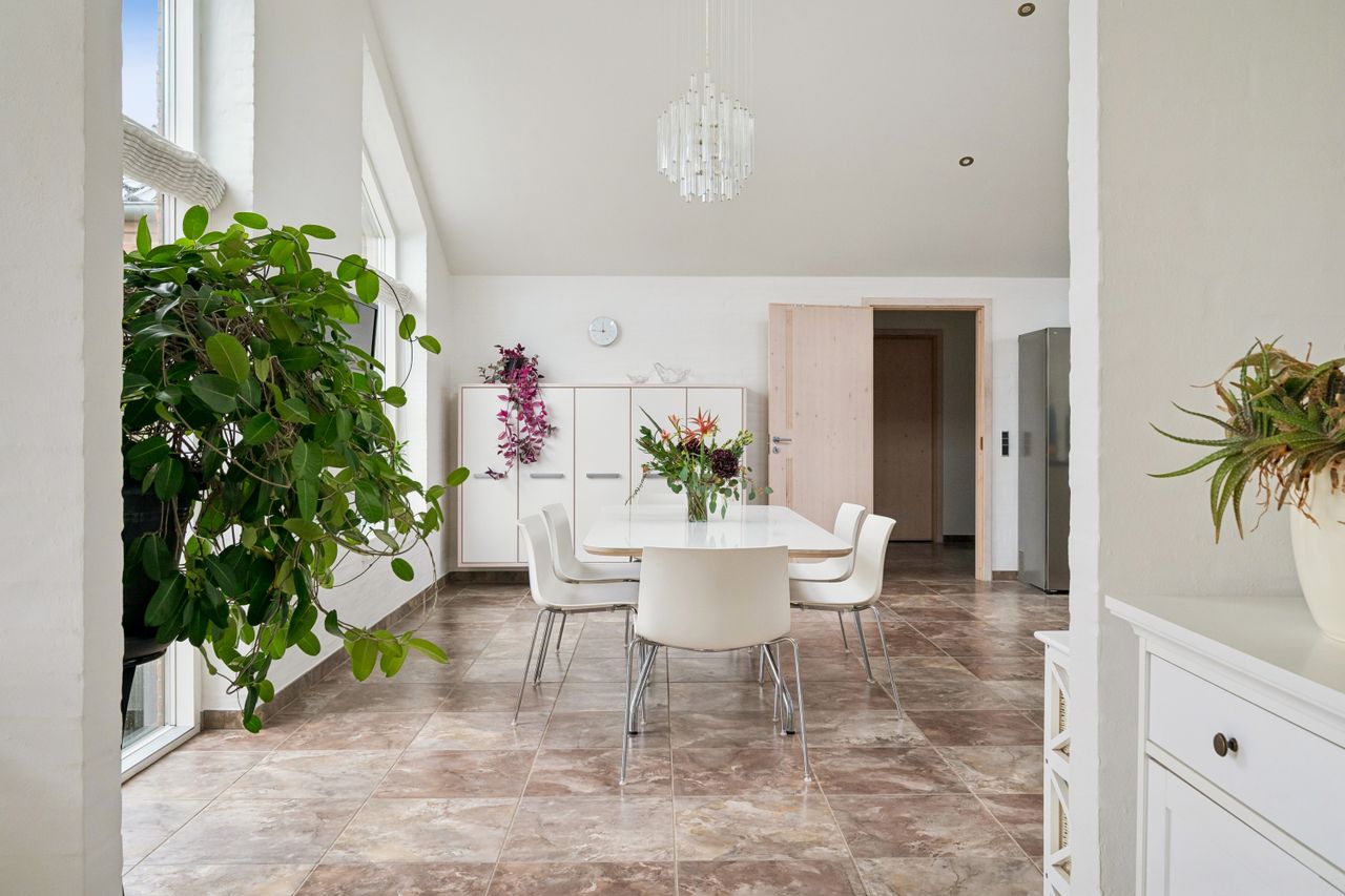 Husets absolutte hjerterum er det store og lyse køkken/alrum, hvor stuen ligger i naturlig forlængelse. De store vinduespartier skaber et fantastisk lysindfald og en skøn sammenhæng mellem inde og ude. Her er der god plads til både hverdagsliv og gæster.