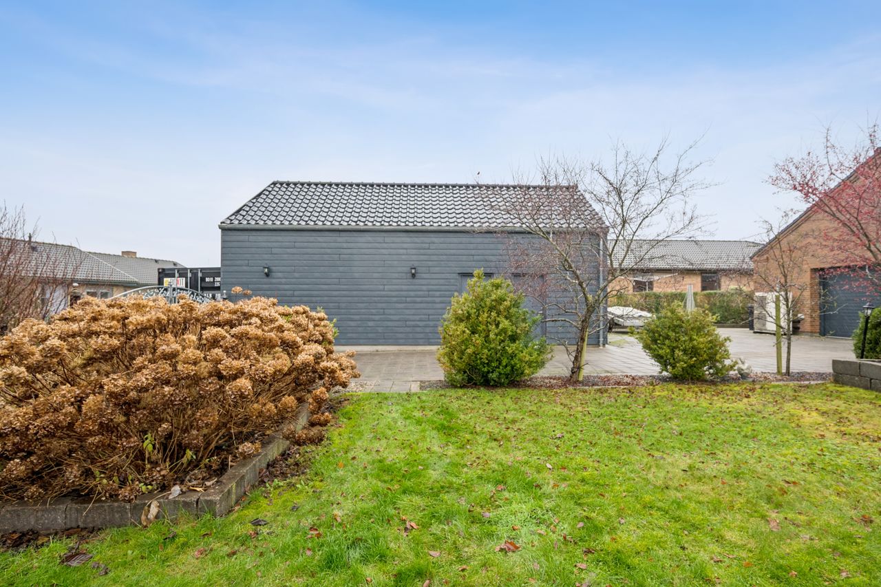 Til ejendommen hører en garage samt en ekstra bygning, som giver helt unikke muligheder for dig med interesse for hobbyprojekter, fitness, kontor, værksted, opbevaring eller flere biler. Der er muligheder hvad end drømmen er. Bygningen er opført med vand og afløb og bruges i dag af sælger til erhverv.