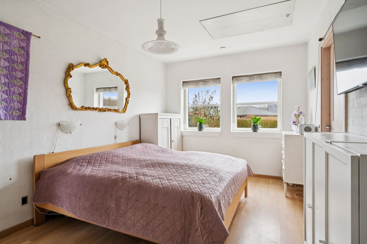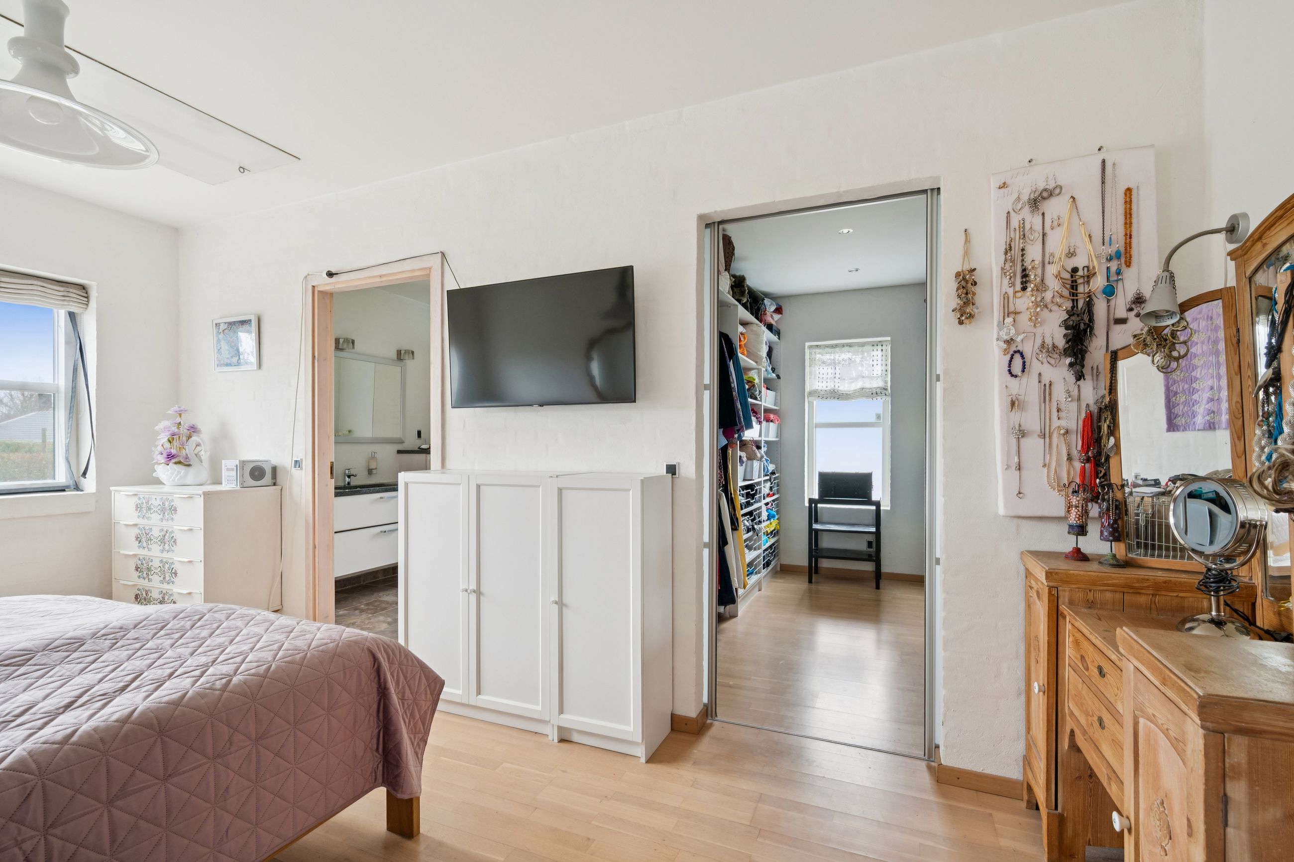 Forældresoveværelset fremstår som en privat afdeling med eget badeværelse samt walk-in-closet – en luksuriøs detalje, der fuldender boligens komfort.