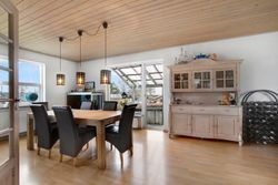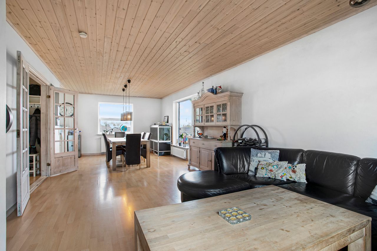 også til det skønne opholdsrum med åben forbindelse til køkkenet. Renoveringen fra 2006 er her tydelig,