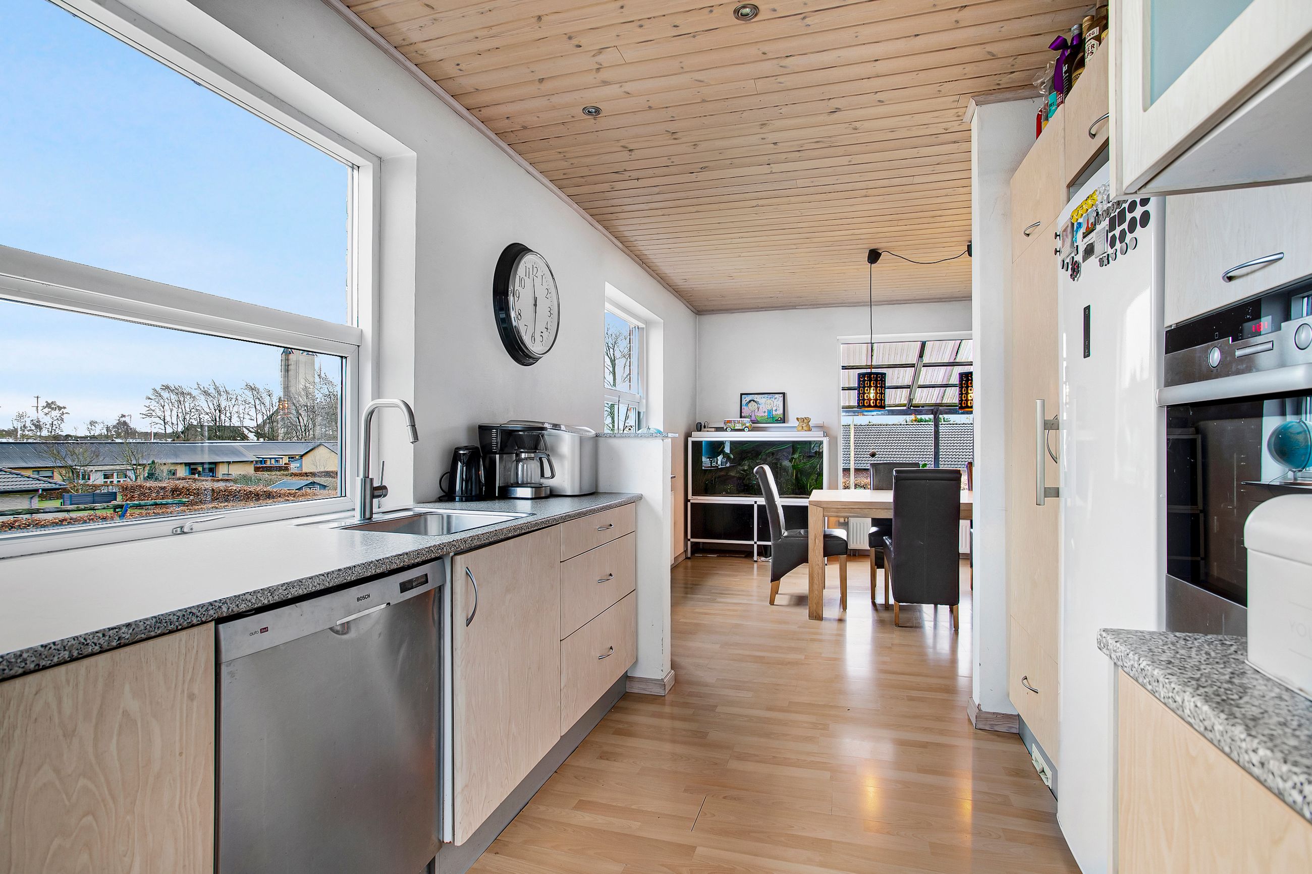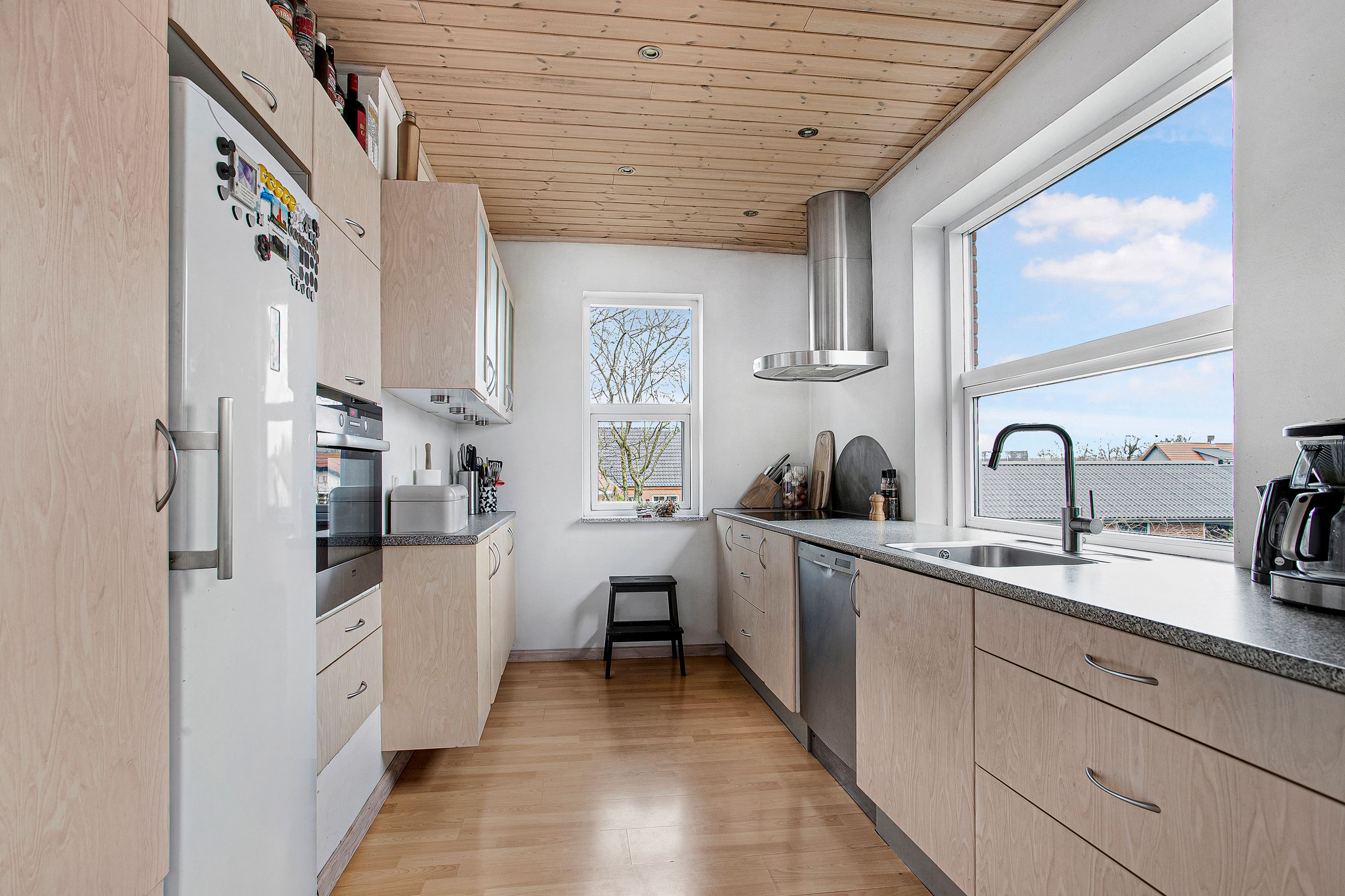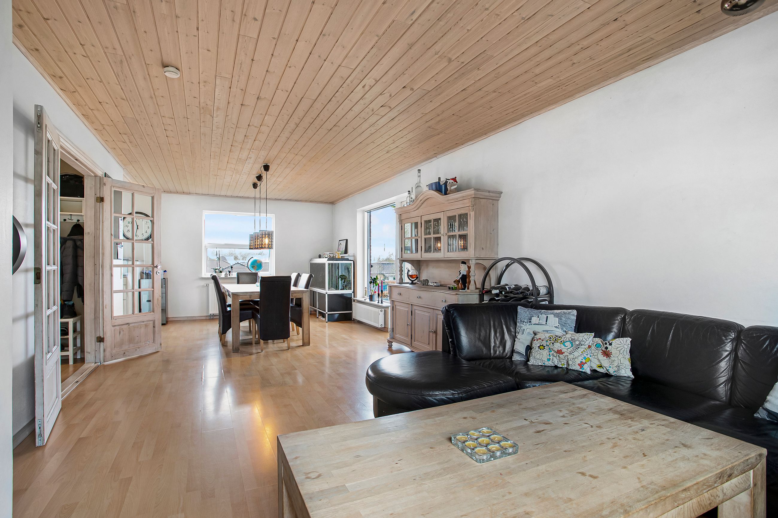da pæne listelofter med lysspots flot matcher både gulv og køkkenlåger. Familien kan trygt samle sig om