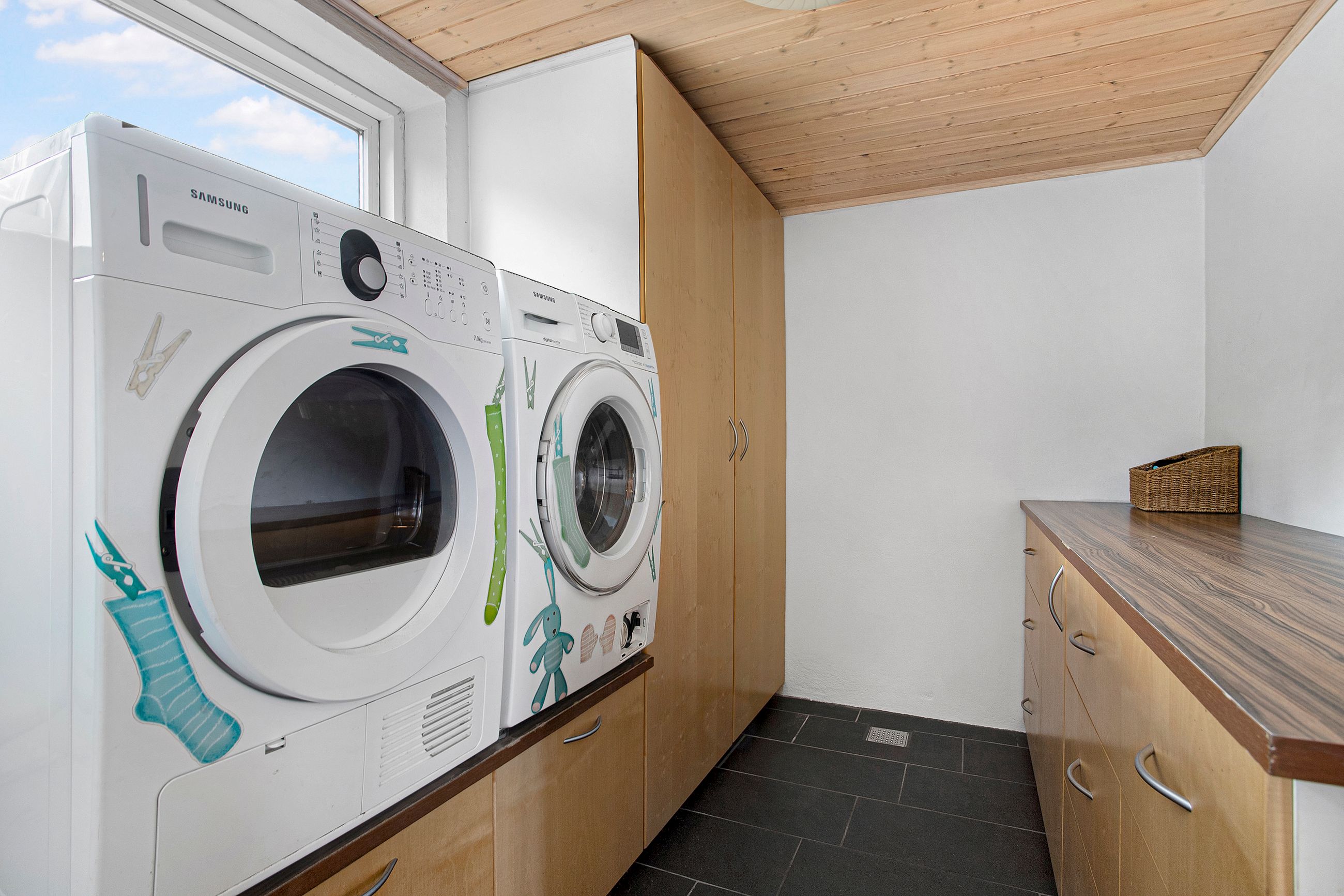praktisk vaskerum med rigelig skabsplads og gode vaskefaciliteter samt et pænt badeværelse, der syner