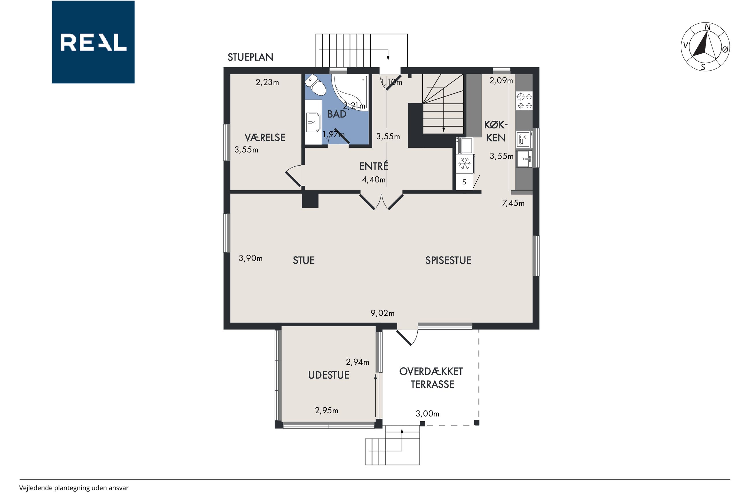 hævet og overdækket terrasse med udgang fra stuen, der også kan lede ind til den hygsomme udestue,