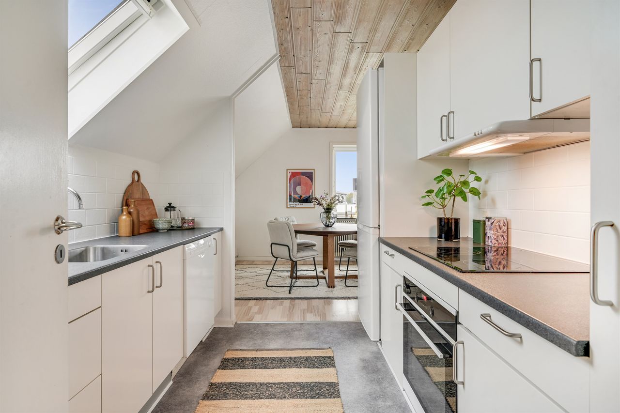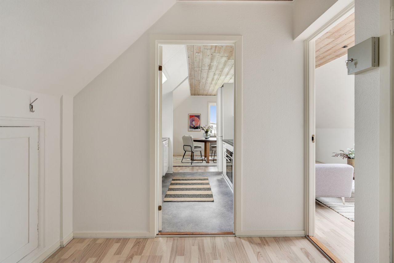 Når du træder ind i lejligheden, mødes du af en skøn opgang, der er både velholdt og charmerende. Lejligheden er indrettet med et moderne køkken og en rummelig stue, som skaber det perfekte samlingspunkt for afslapning og hyggelige aftener.