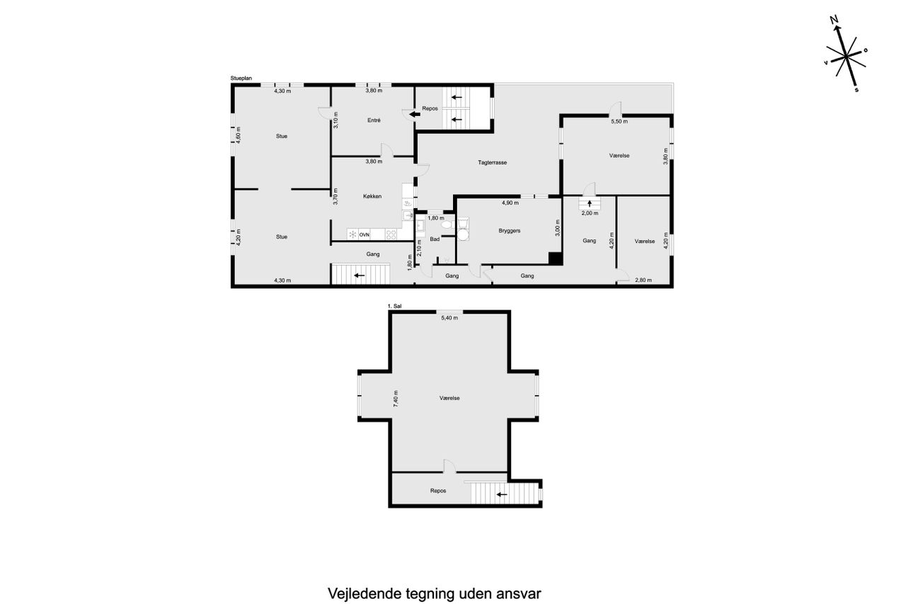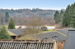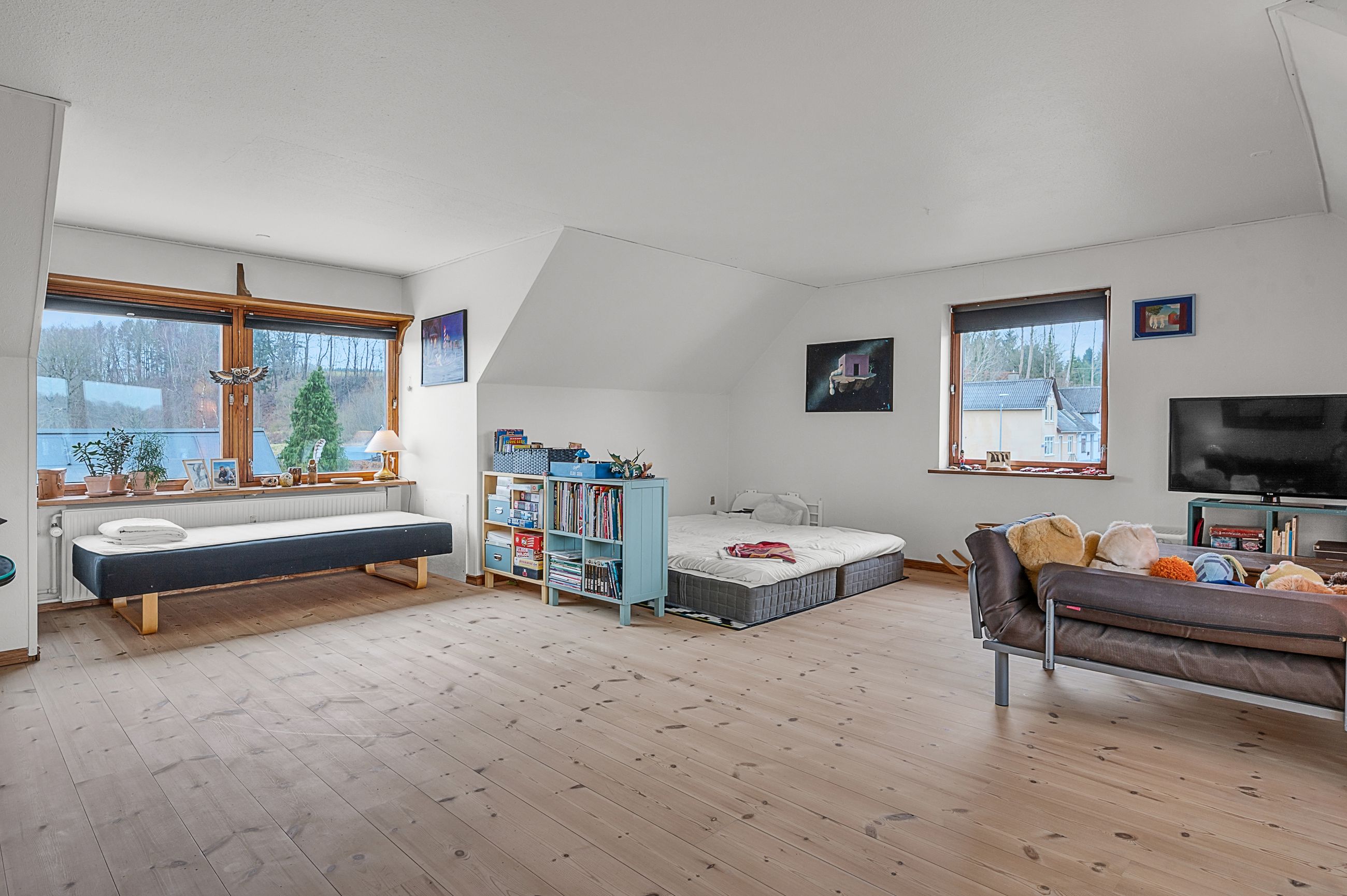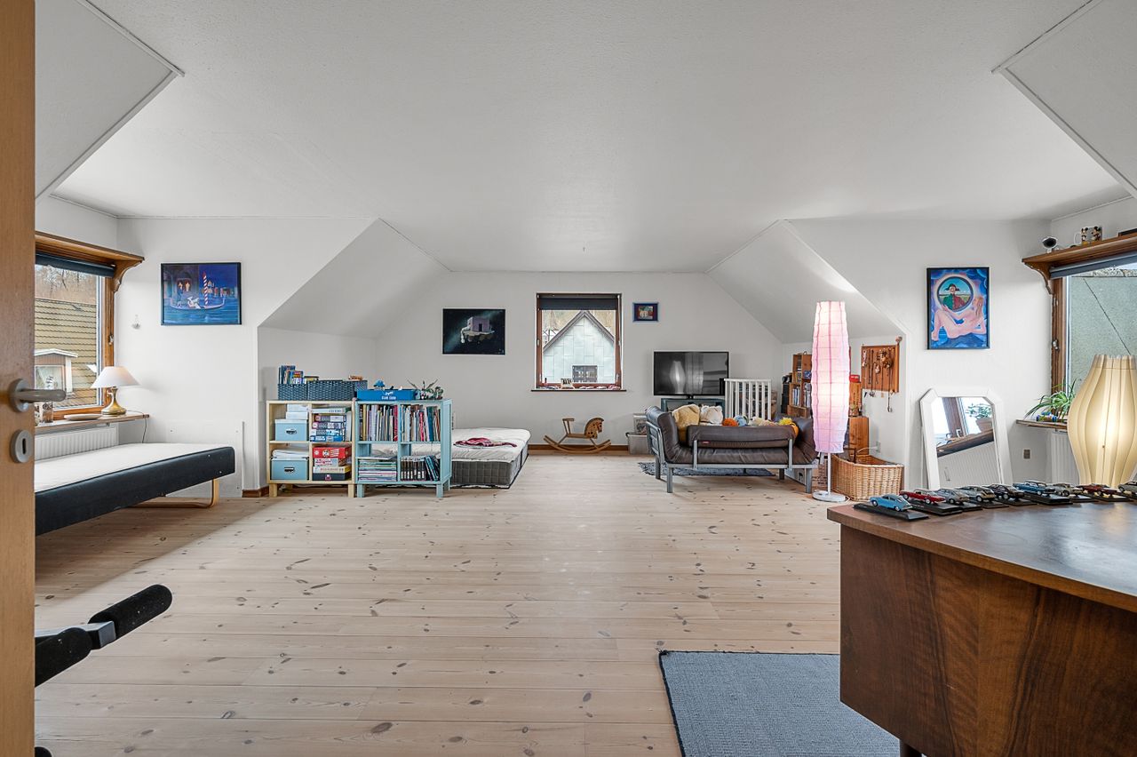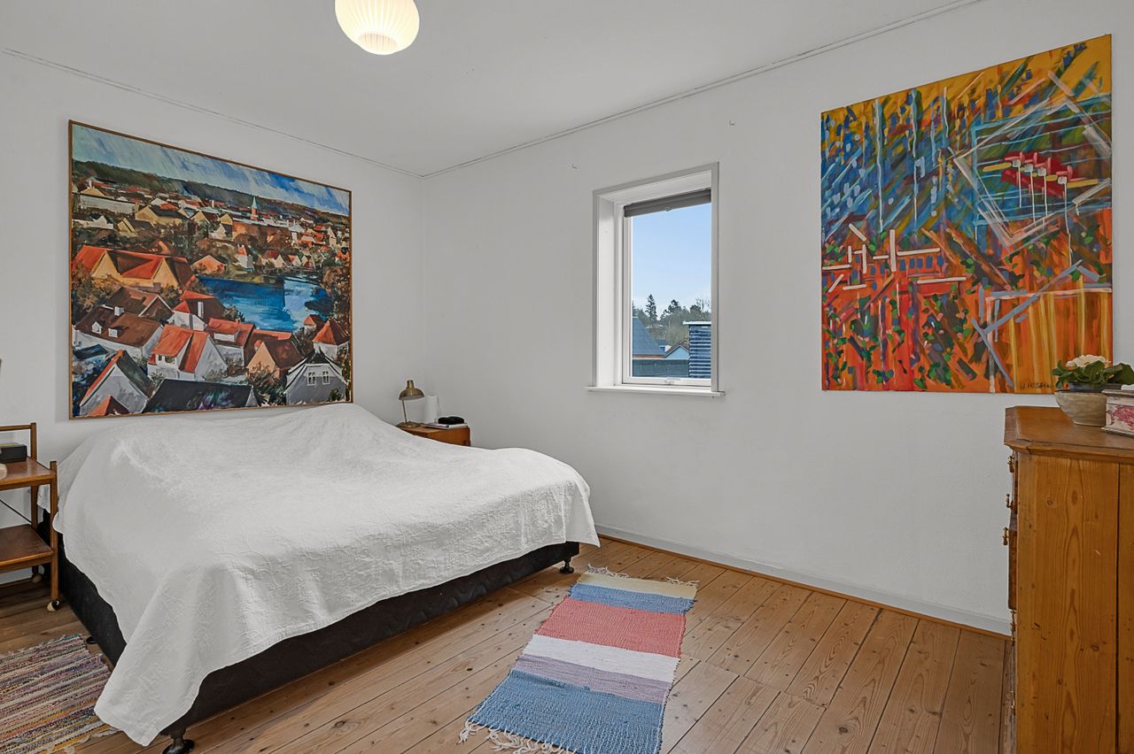 På andensalen finder du boligens store master bedroom – et ideelt soveværelse med en betagende udsigt over byen og søen. Her kan du virkelig finde ro og nyde omgivelserne.