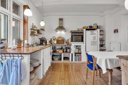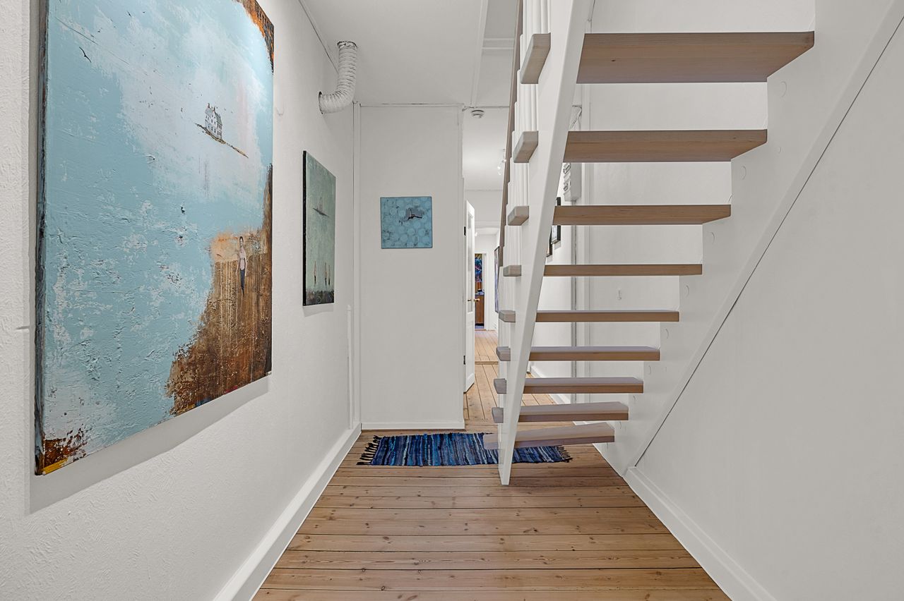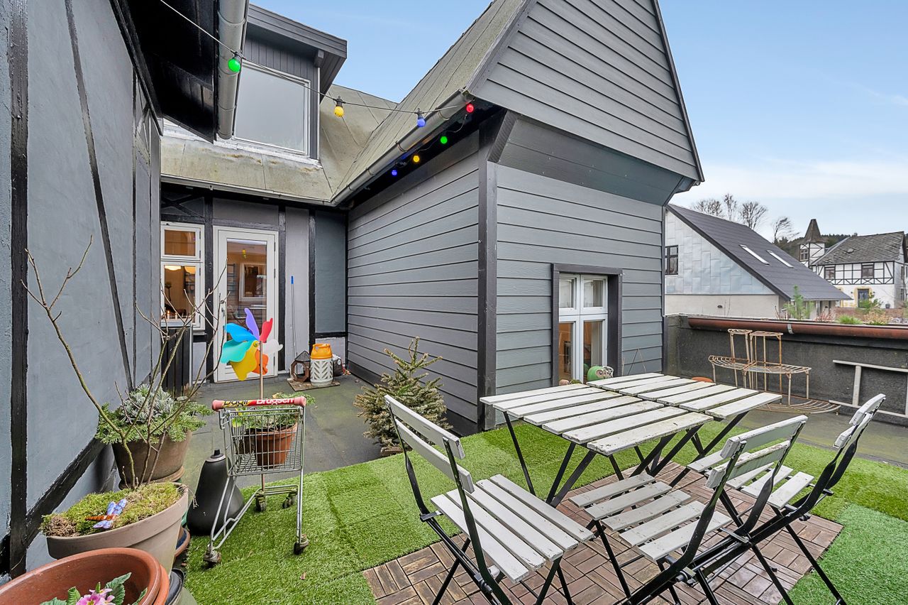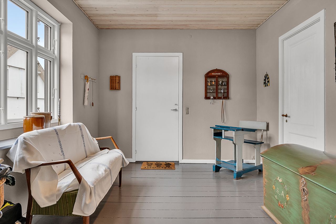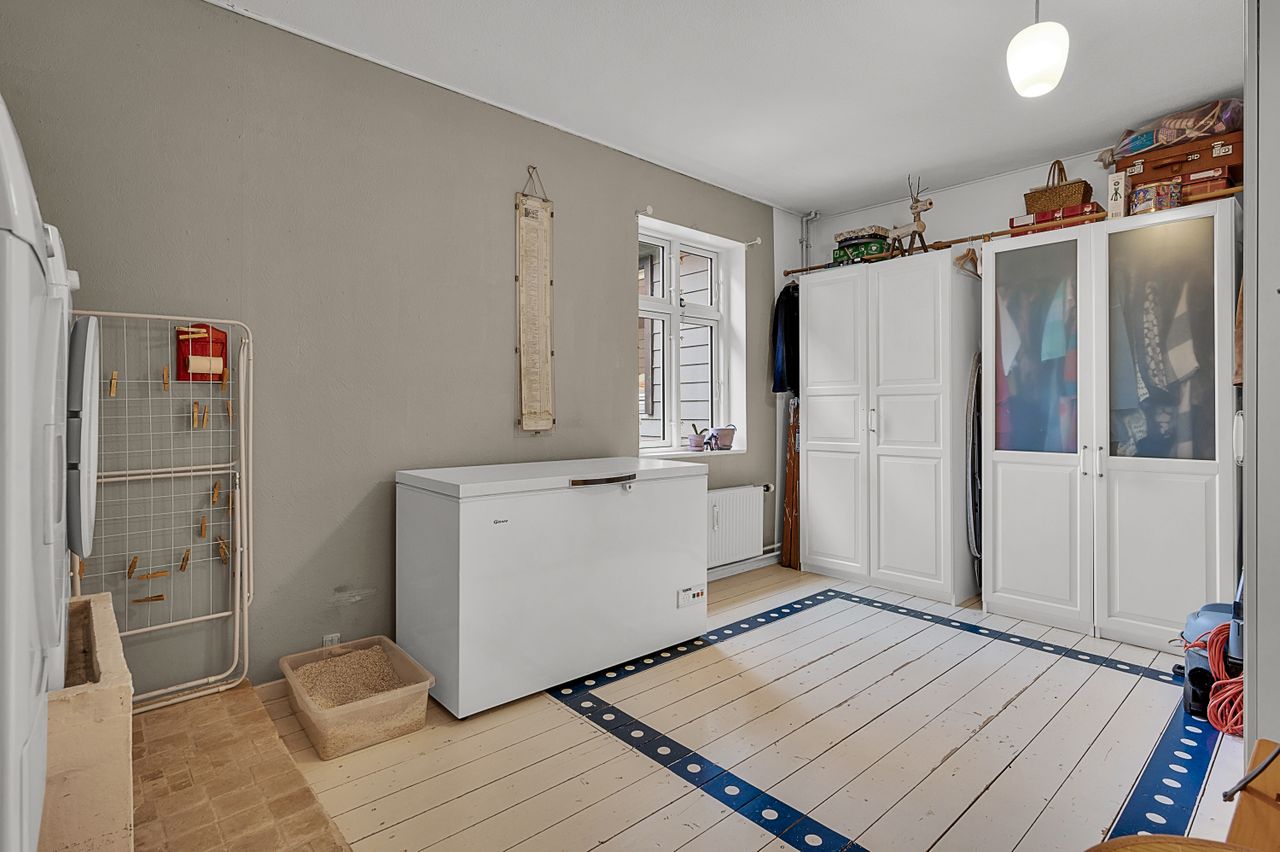 Du bliver budt velkommen af en rummelig entré med god plads til overtøj og fodtøj. Herfra træder du ind i det hyggelige køkken, hvor du har en dejlig udsigt til den skønne tagterrasse – et perfekt sted at nyde en kop kaffe og solen.
