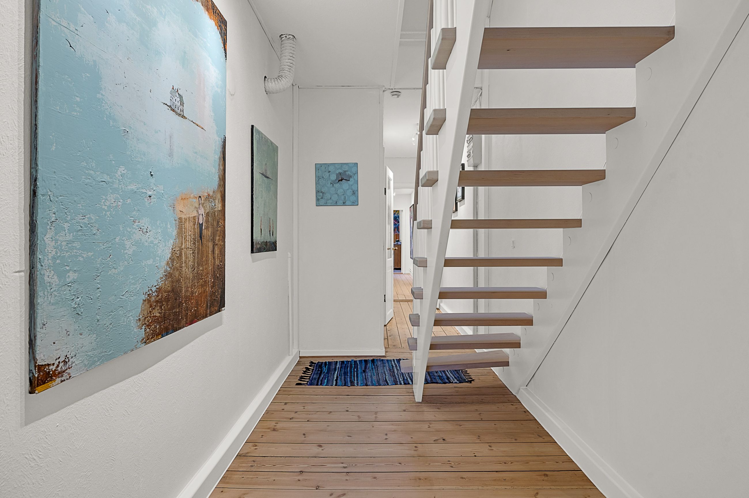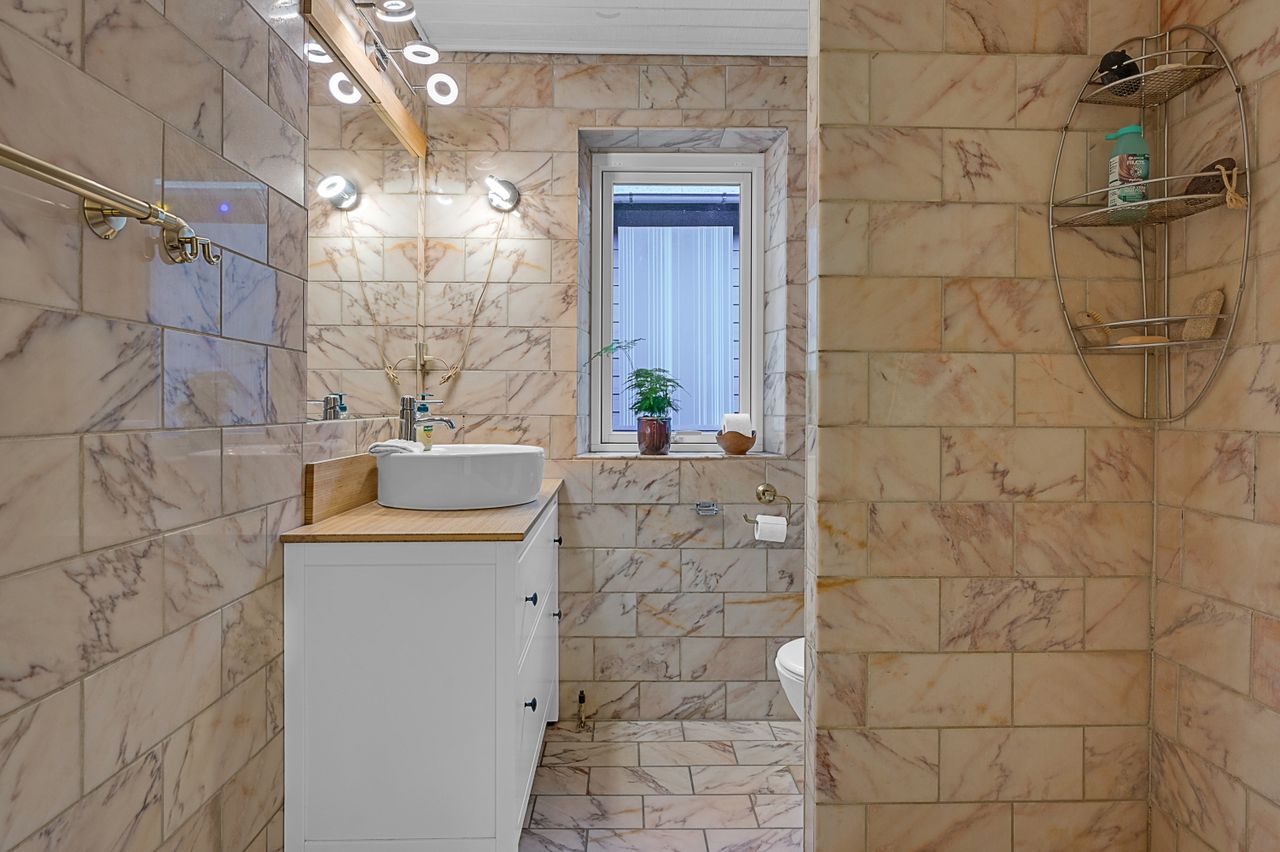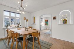 Fra spisestuen fører en fordelingsgang dig videre til boligens to gode børneværelser, et rummeligt badeværelse samt et praktisk bryggers.