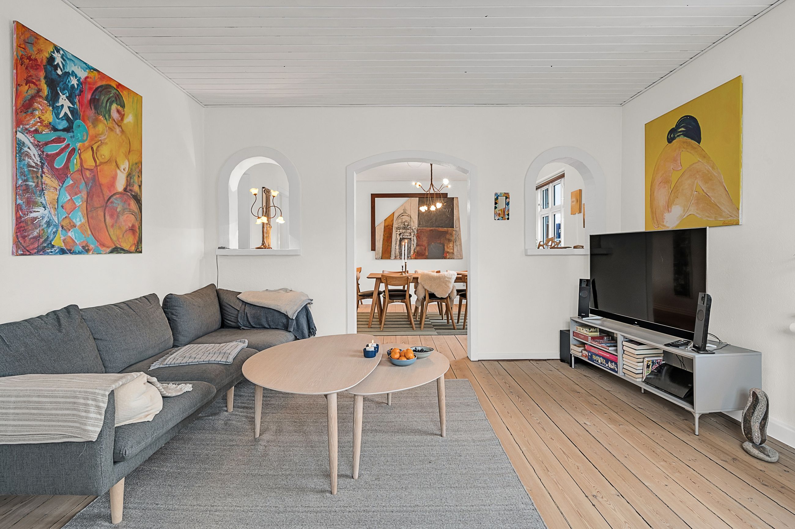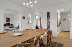 Køkkenet åbner op til den store spisestue, der ligger i forlængelse af TV-stuen. Her er der plads til hele familien – også til julens hyggelige sammenkomster og store familiefrokoster.