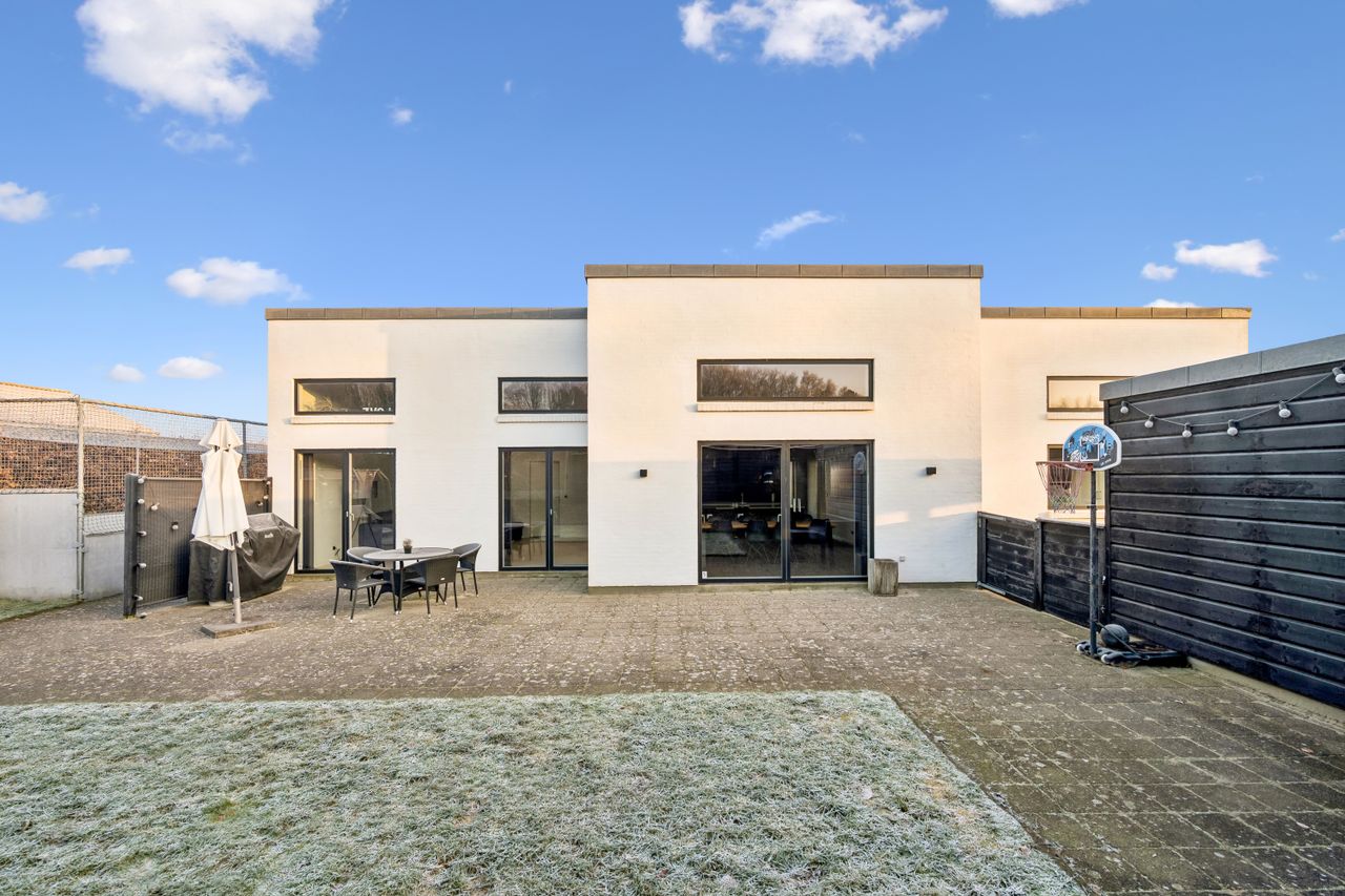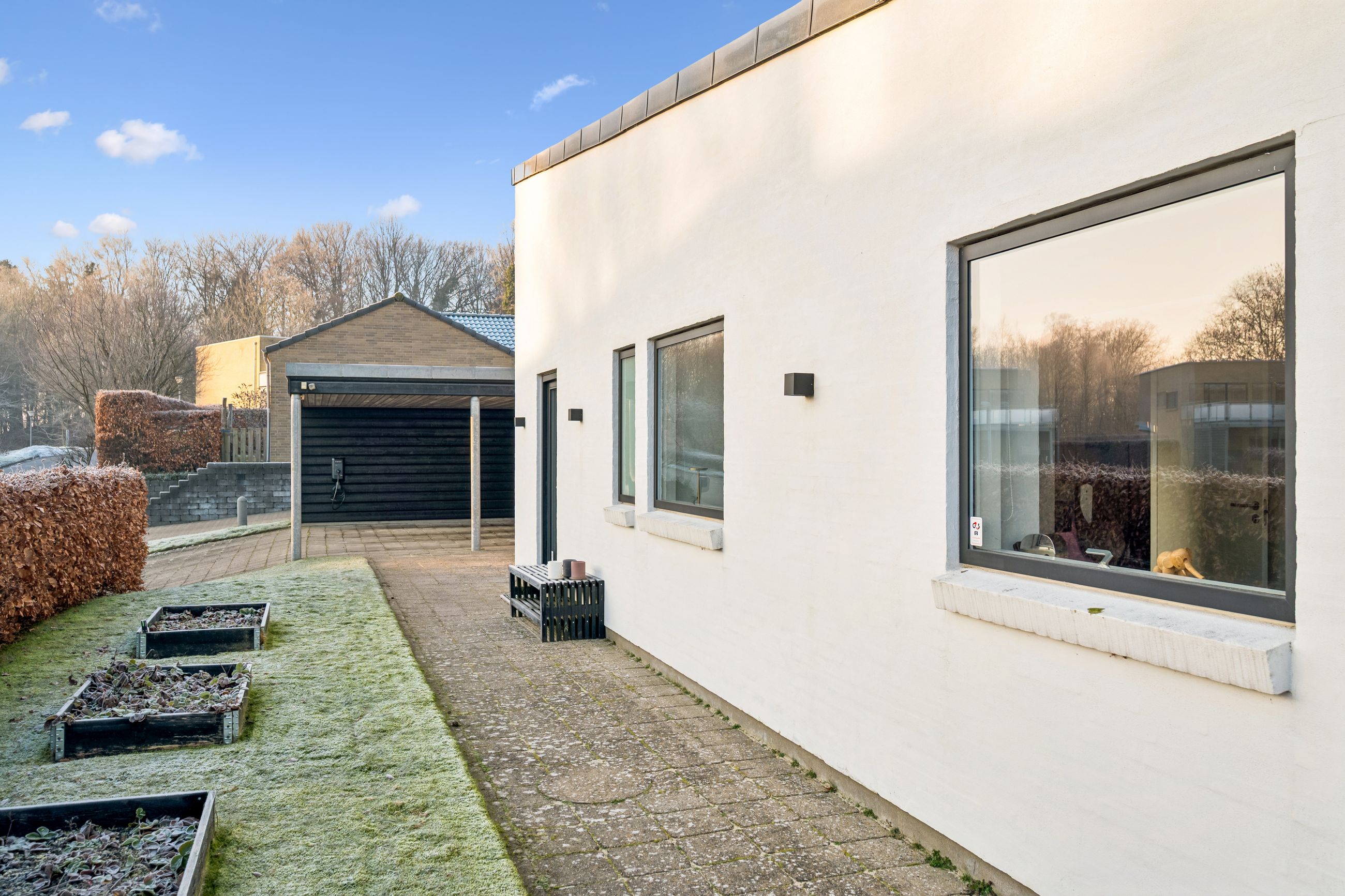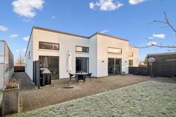 Boligens hjerte er det store og indbydende køkken-alrum, som ligger i åben forbindelse til stuen – dog adskilt af en elegant væg med indbygget pejs, der skaber en hyggelig og stemningsfuld atmosfære. Fra alrummet er der direkte udgang til den solrige terrasse, som indbyder til mange gode stunder under åben himmel.