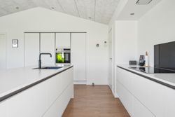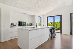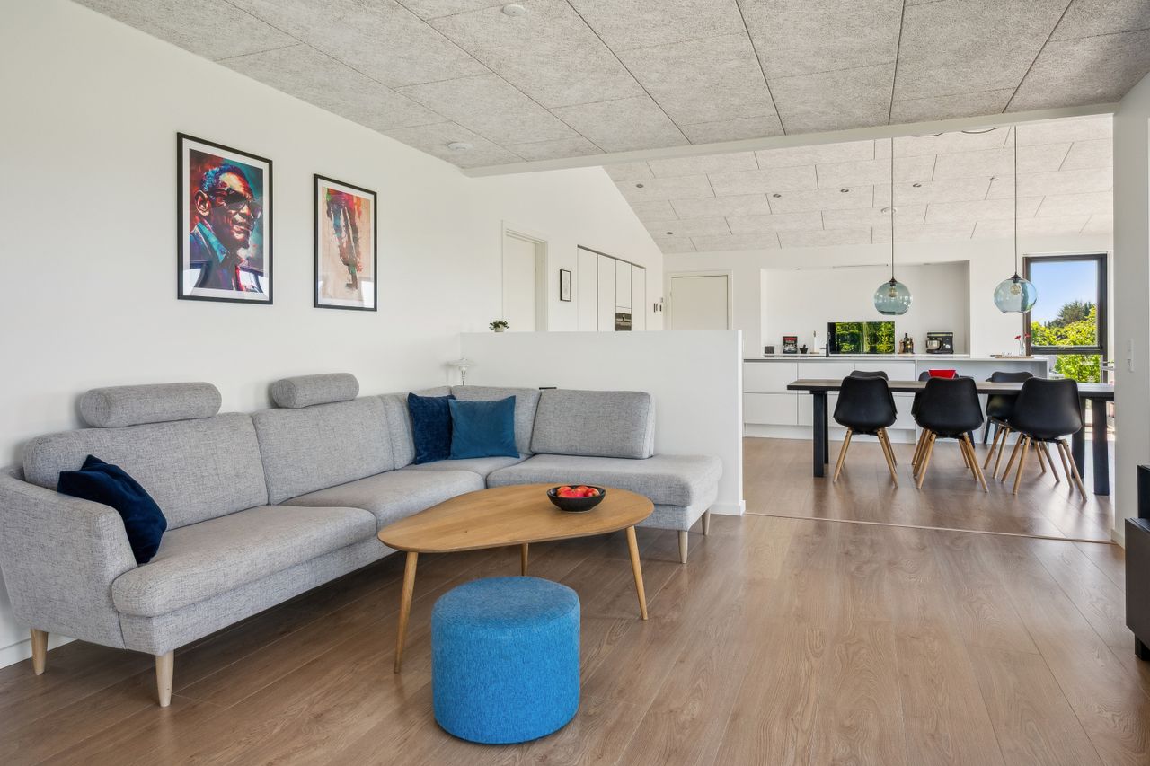 Boligens indretning er kendetegnet ved store, lyse rum og en naturlig opdeling, der sikrer både fællesskab og privatliv. Det imponerende køkken-alrum fungerer som boligens samlingspunkt og har et markant lysindfald fra de store vinduespartier. Det stilrene HTH-køkken med køkkenniche understøtter boligens eksklusive udtryk.