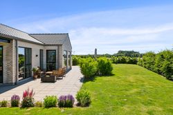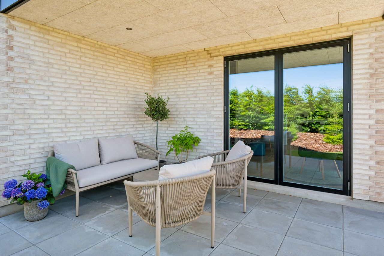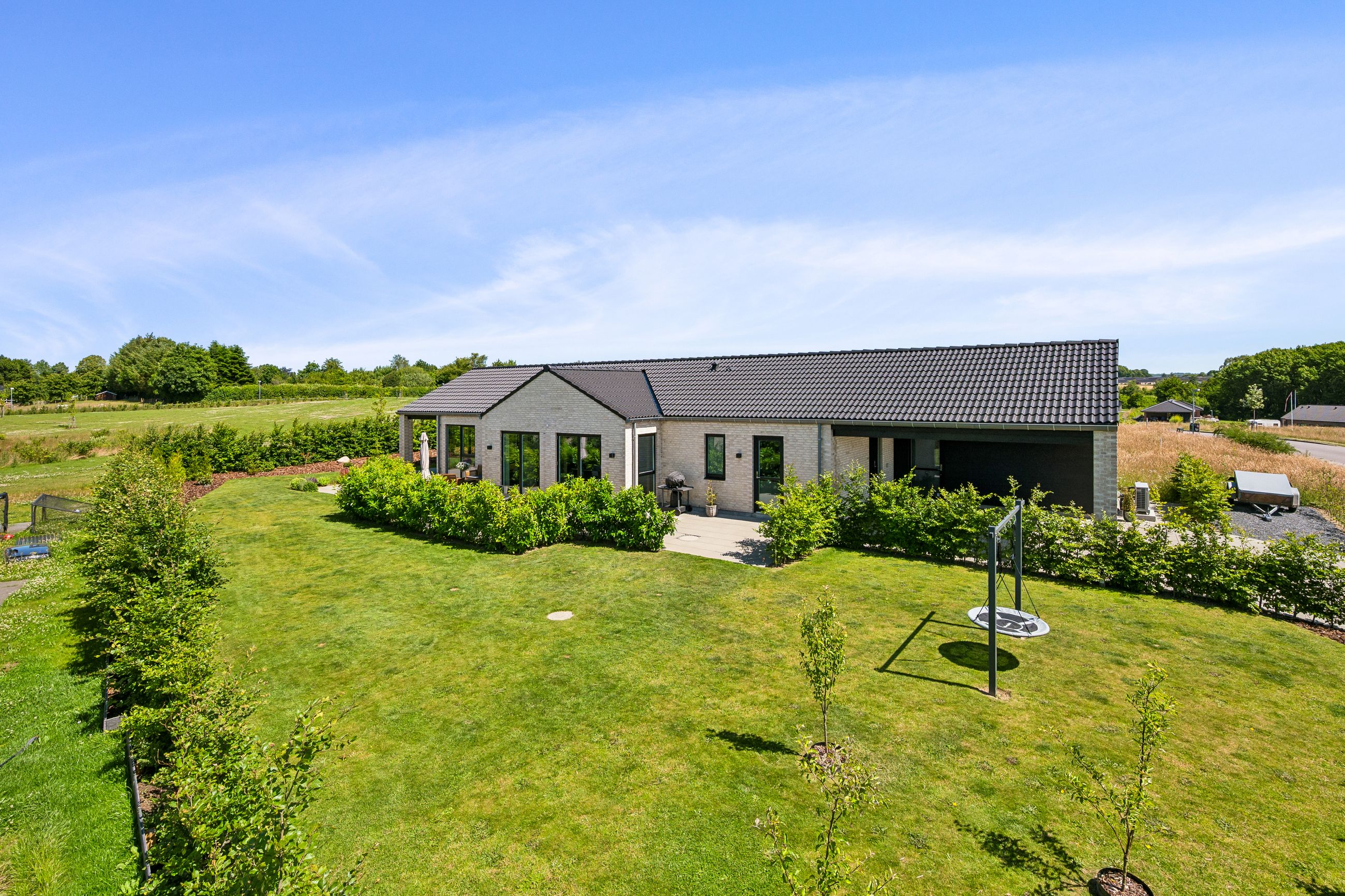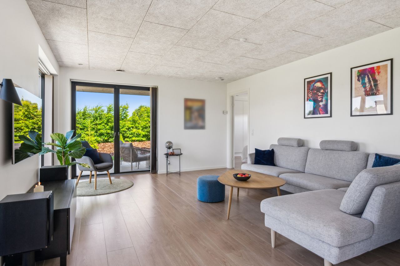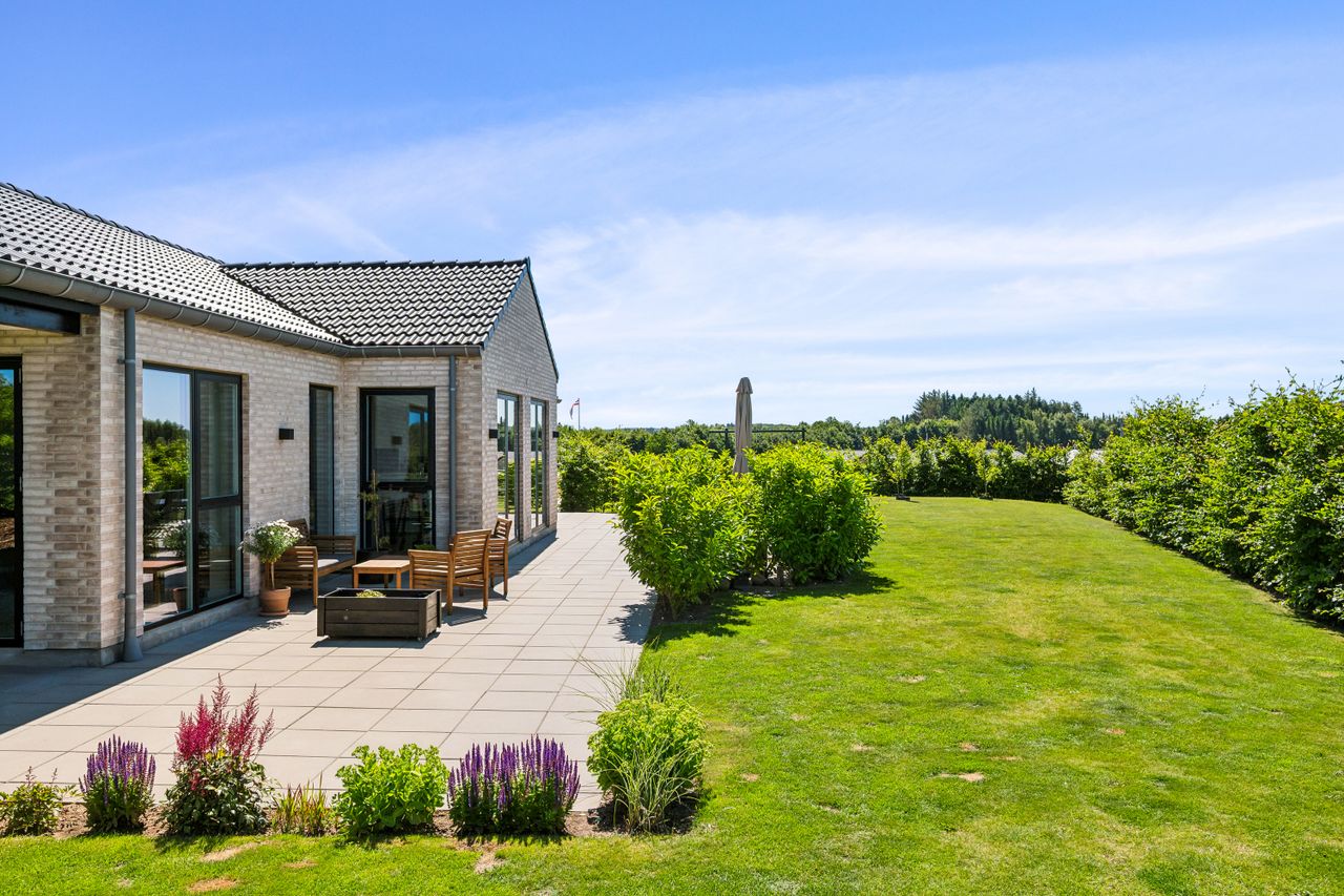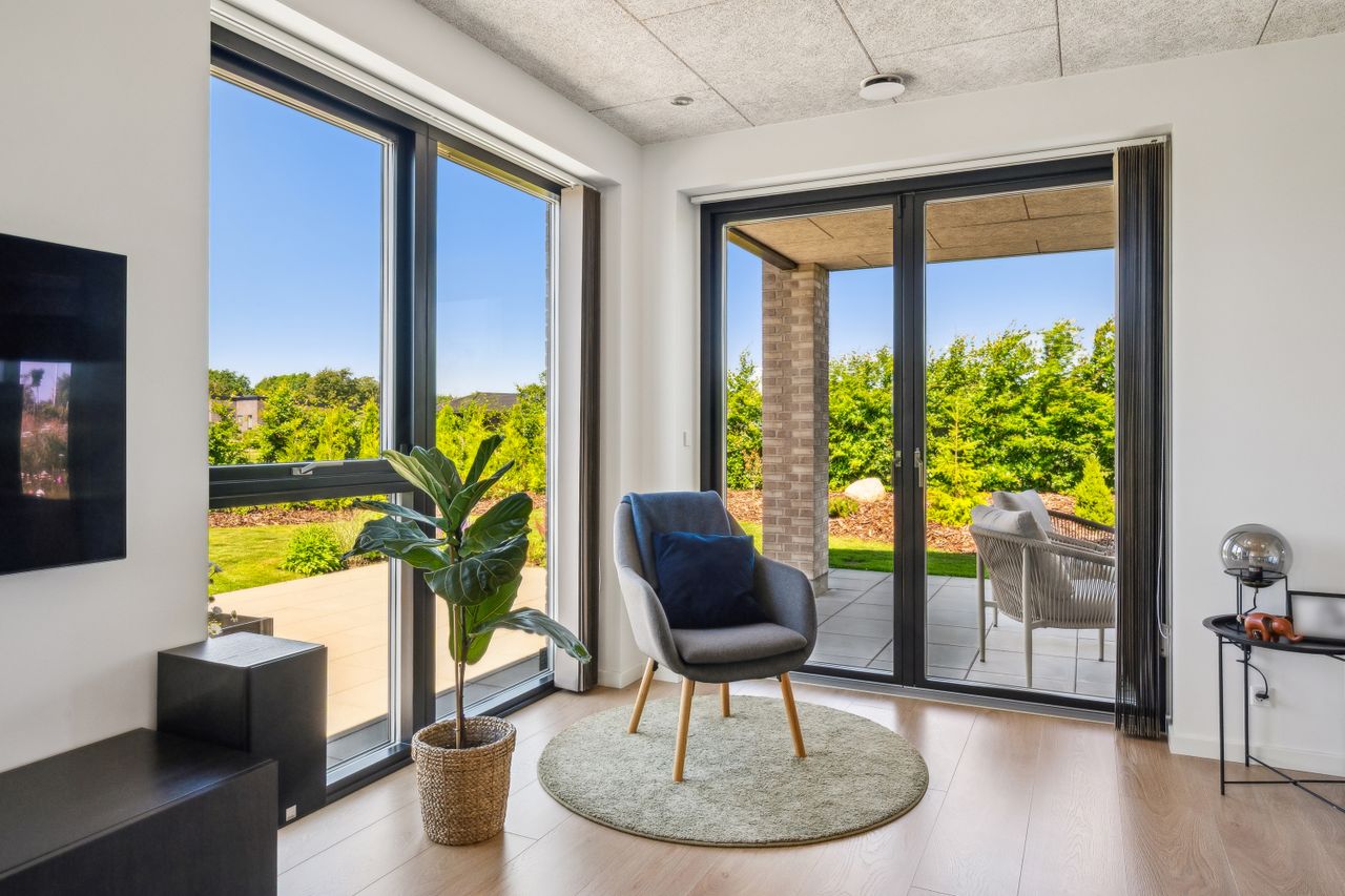 Stuen har direkte adgang til en overdækket terrasse og en flot anlagt have, der grænser op til grønne arealer og skaber en rolig og privat ramme omkring boligen.