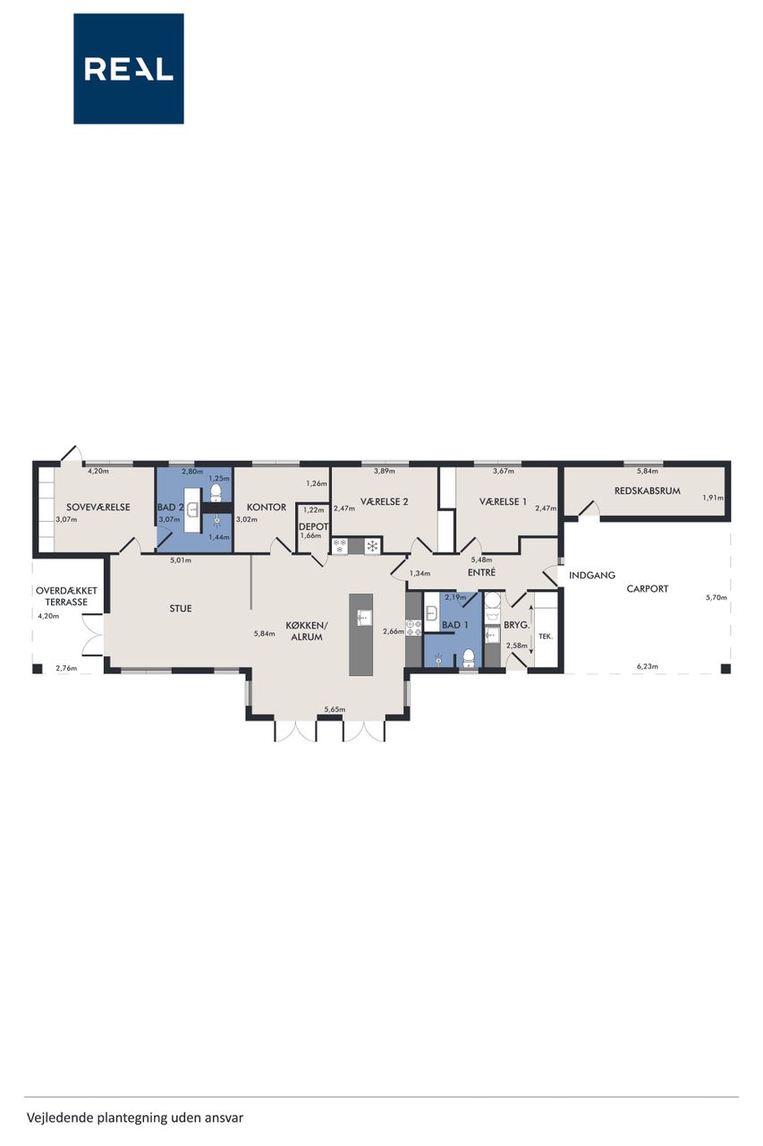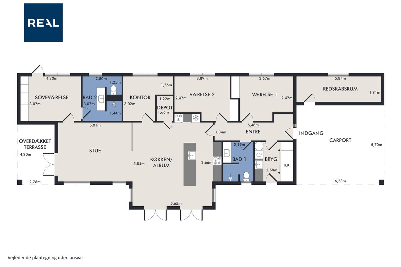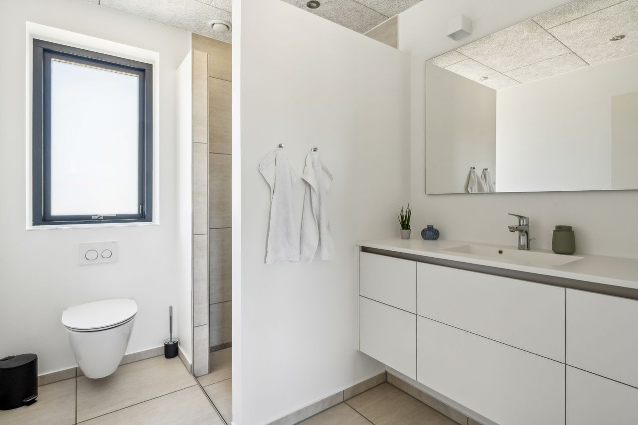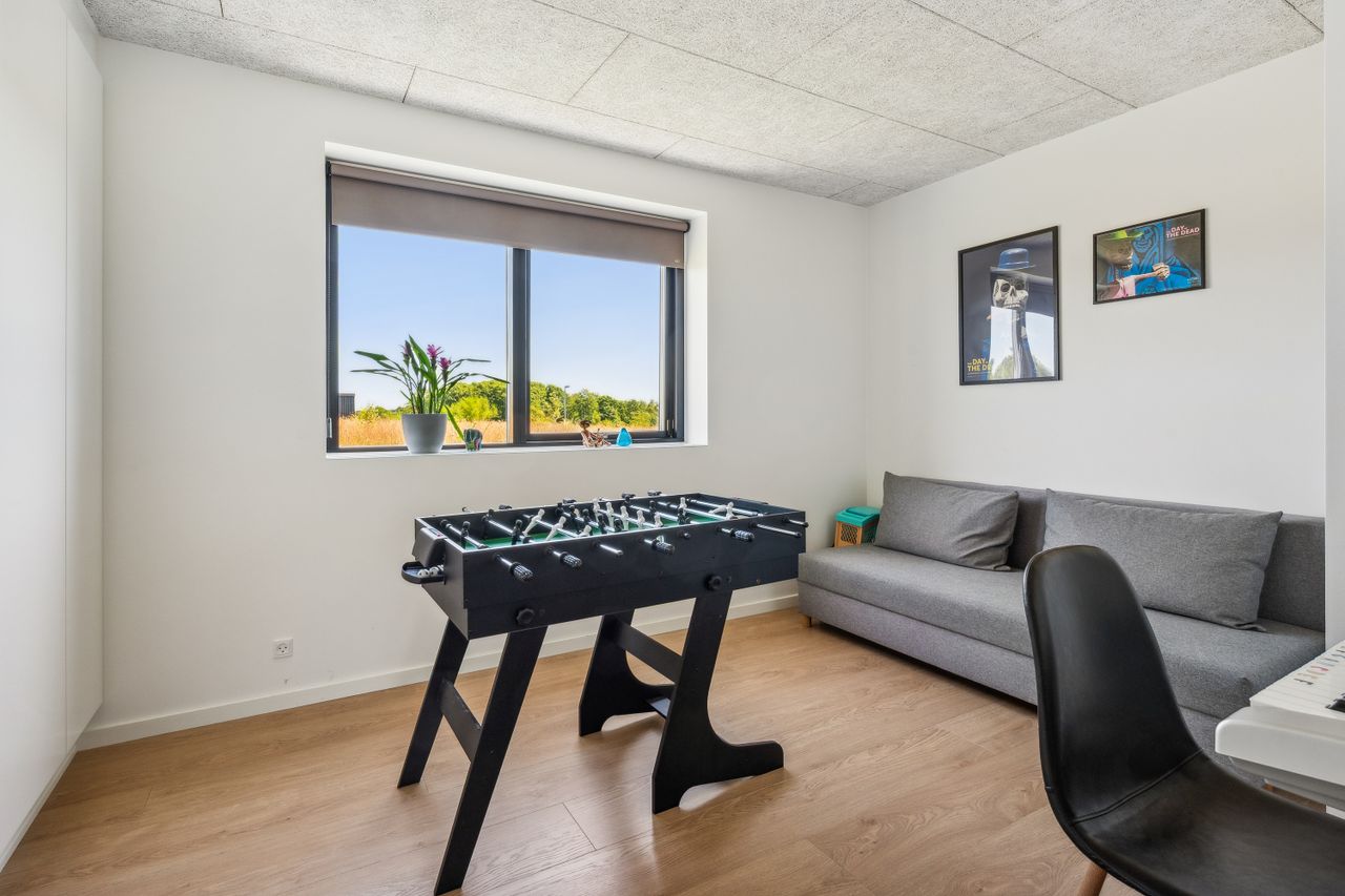Den private forældreafdeling byder på soveværelse og elegant badeværelse, mens børneafdelingen er indrettet med store værelser og eget badeværelse. Det rummelige kontor giver mulighed for fleksibel indretning alt efter familiens behov.