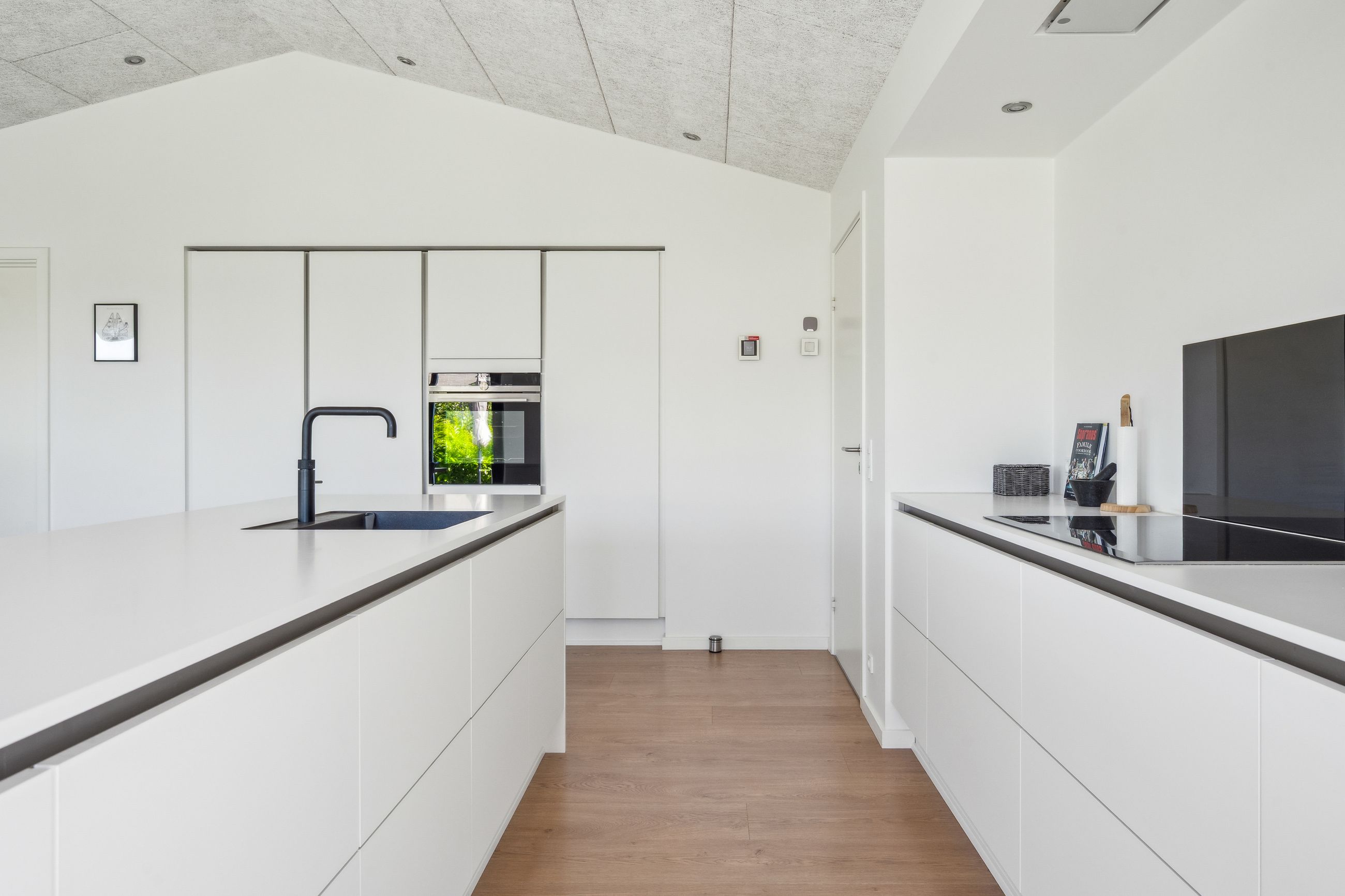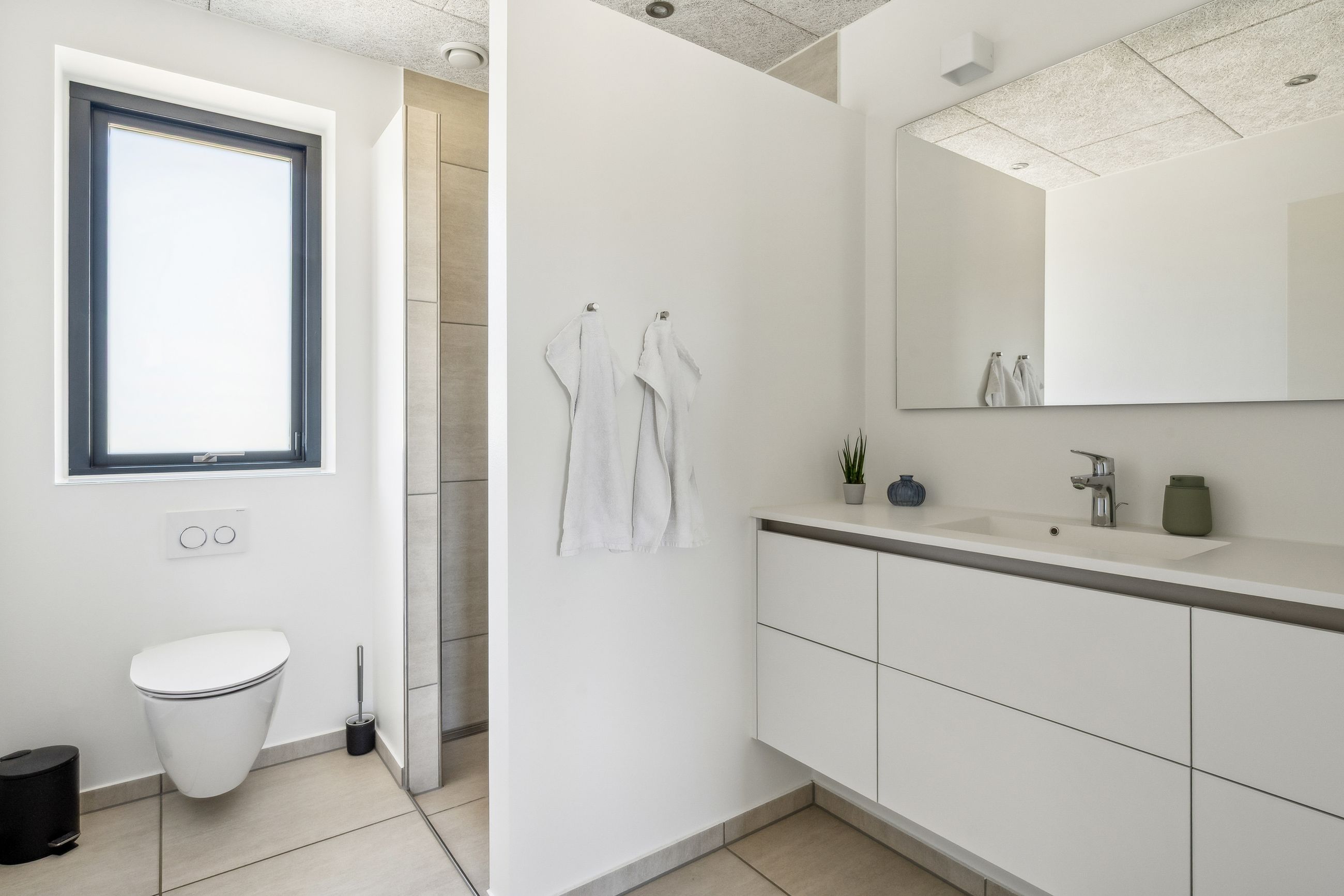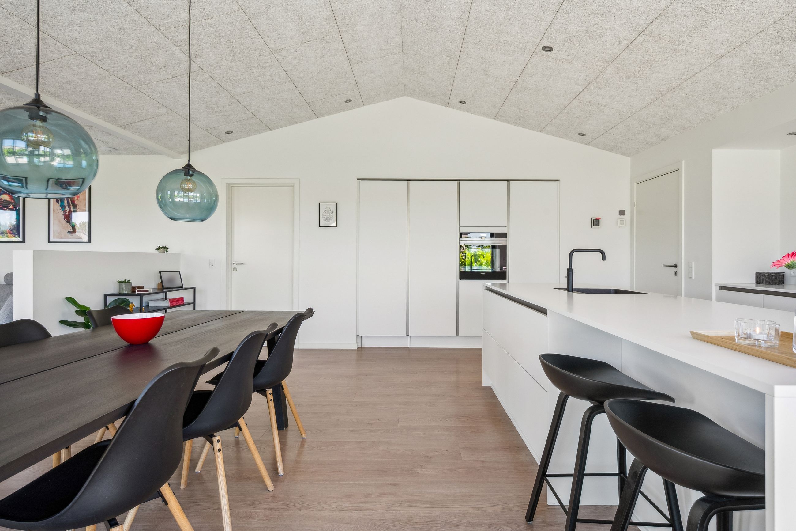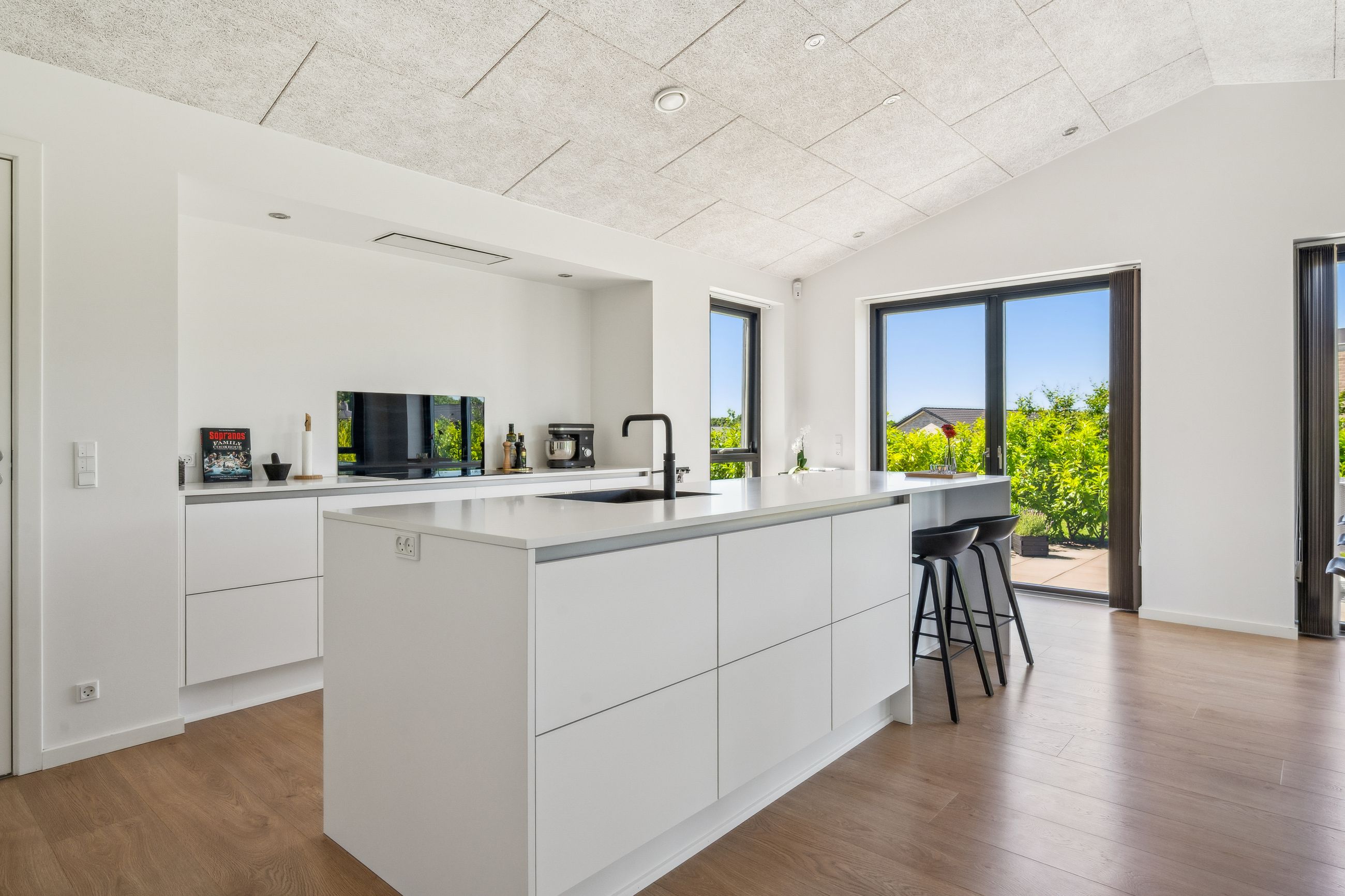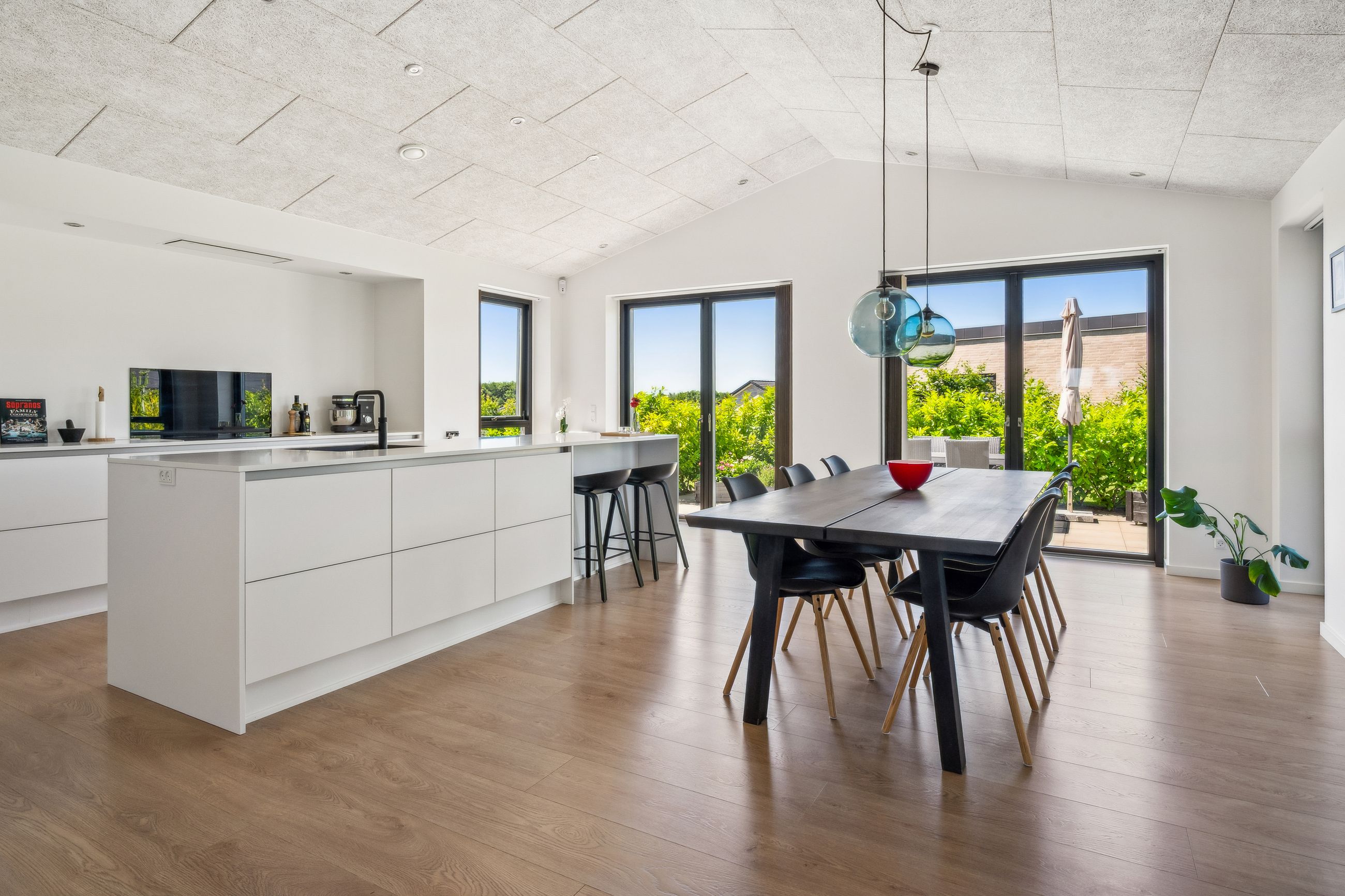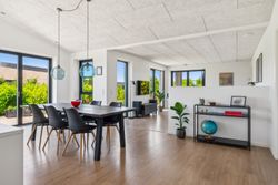 Materialevalg og detaljer er nøje udvalgt og tæller blandt andet solglas, sorte indvendige rammer samt mange integrerede spots, der bidrager til et eksklusivt og behageligt lys.