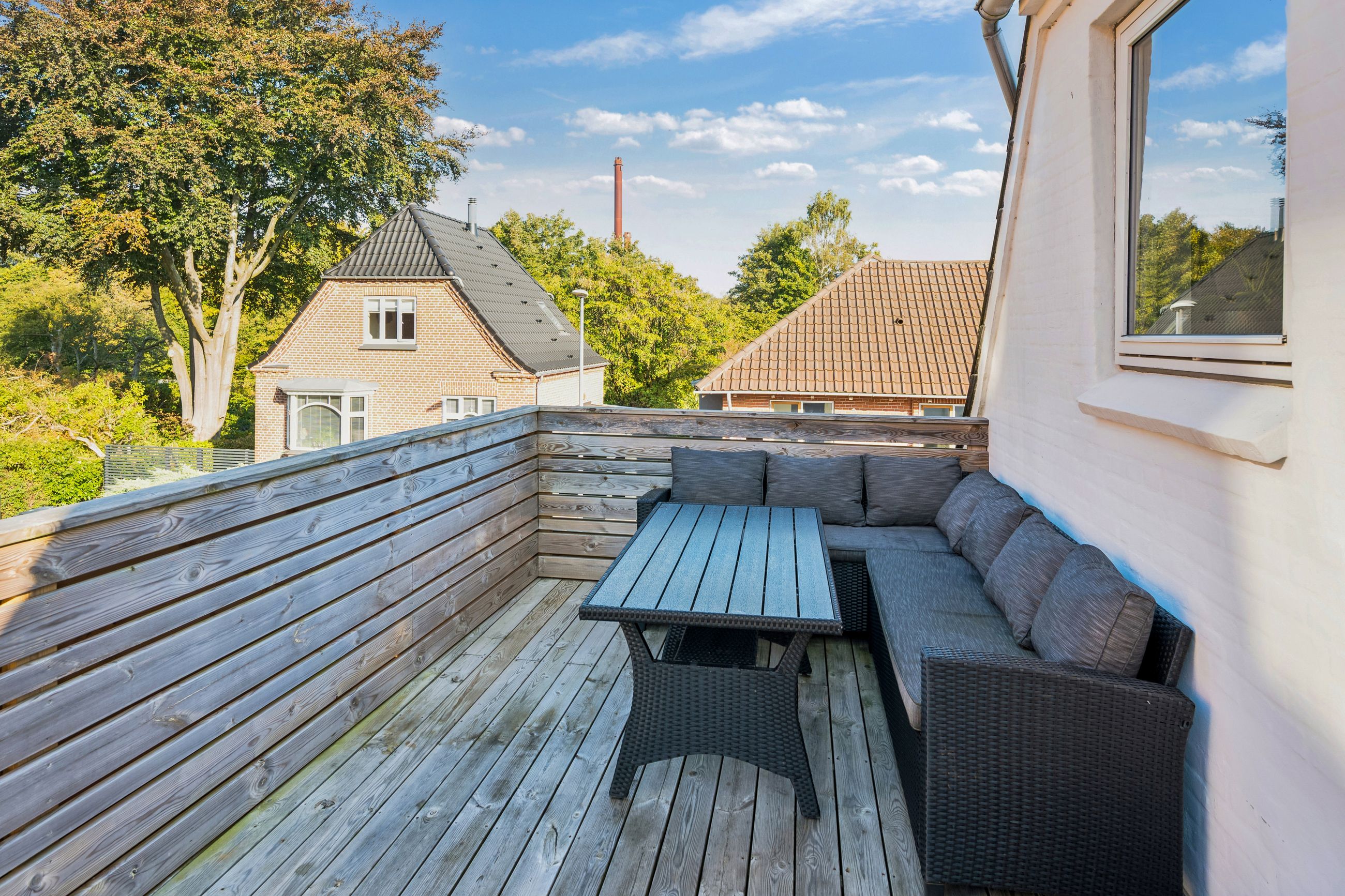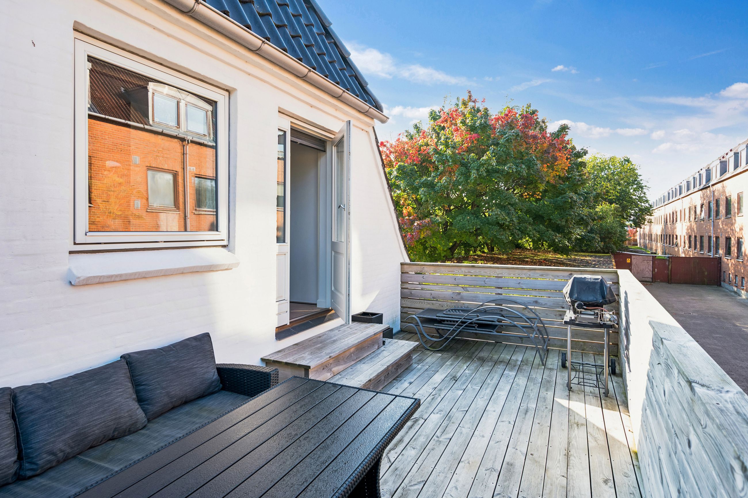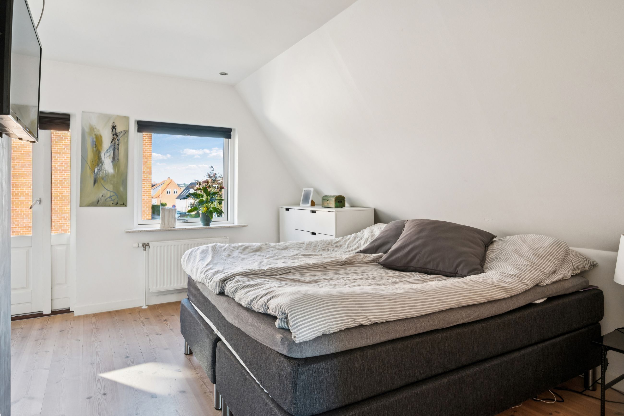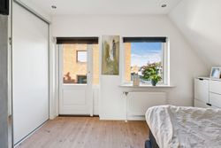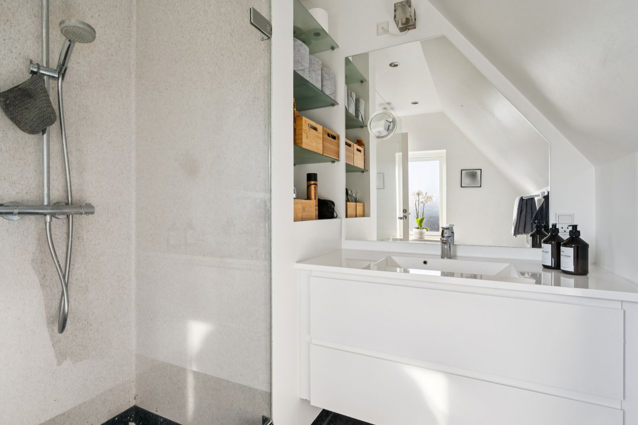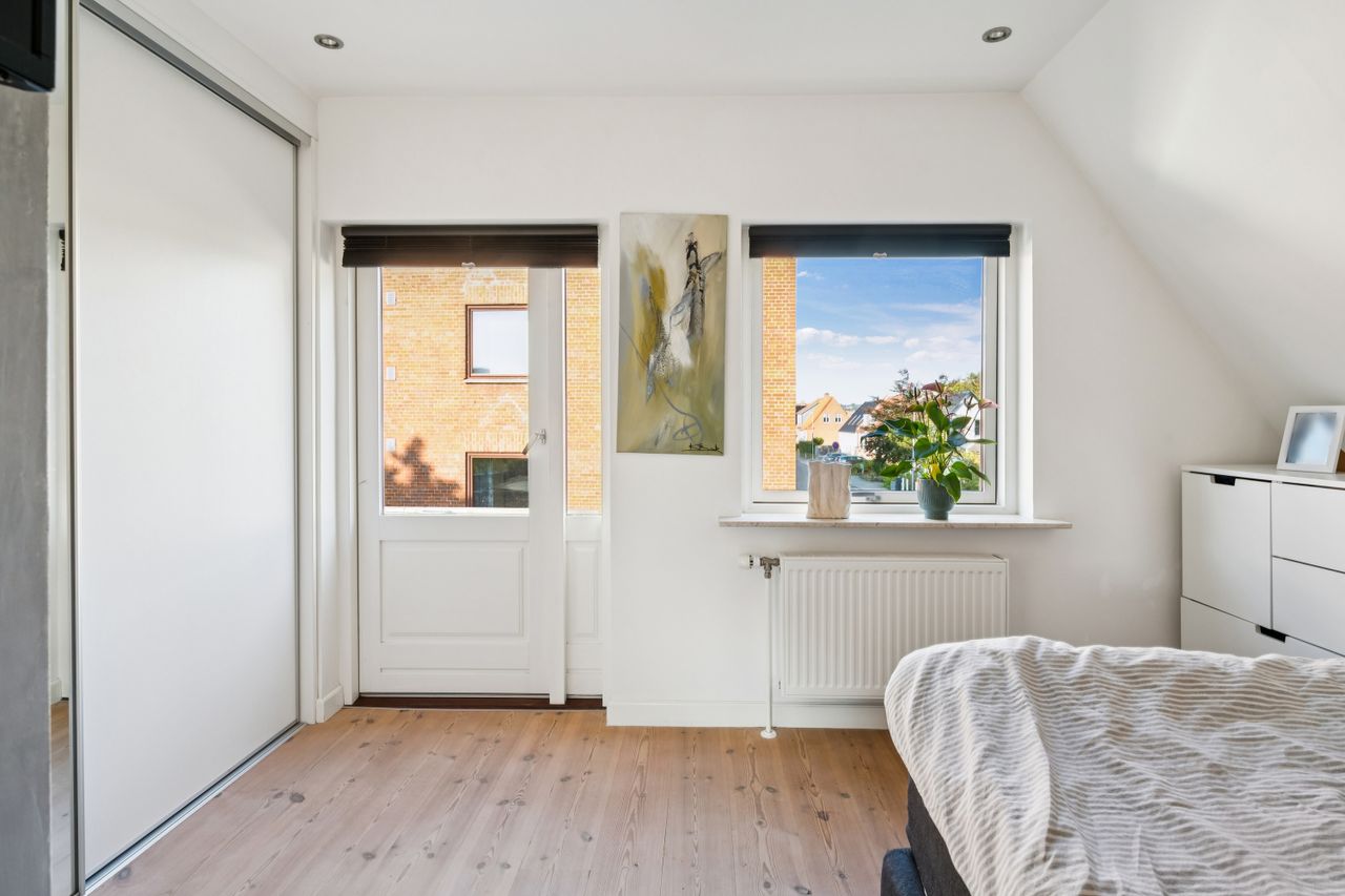 1. sal: Soveværelse med god plads og udgang til den hyggelige tagterrasse, yderligere et godt værelse og et flot badeværelse med brus.
