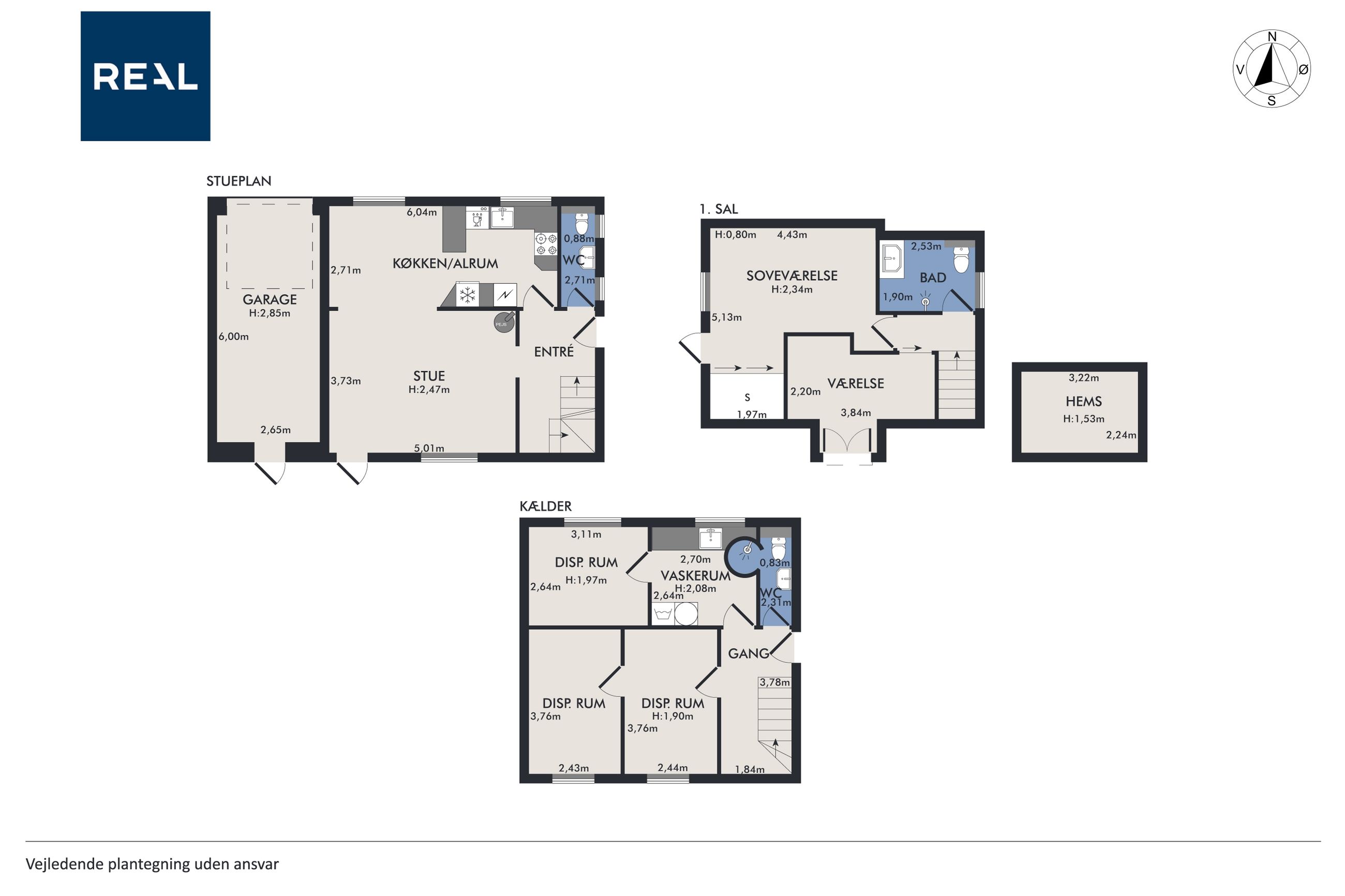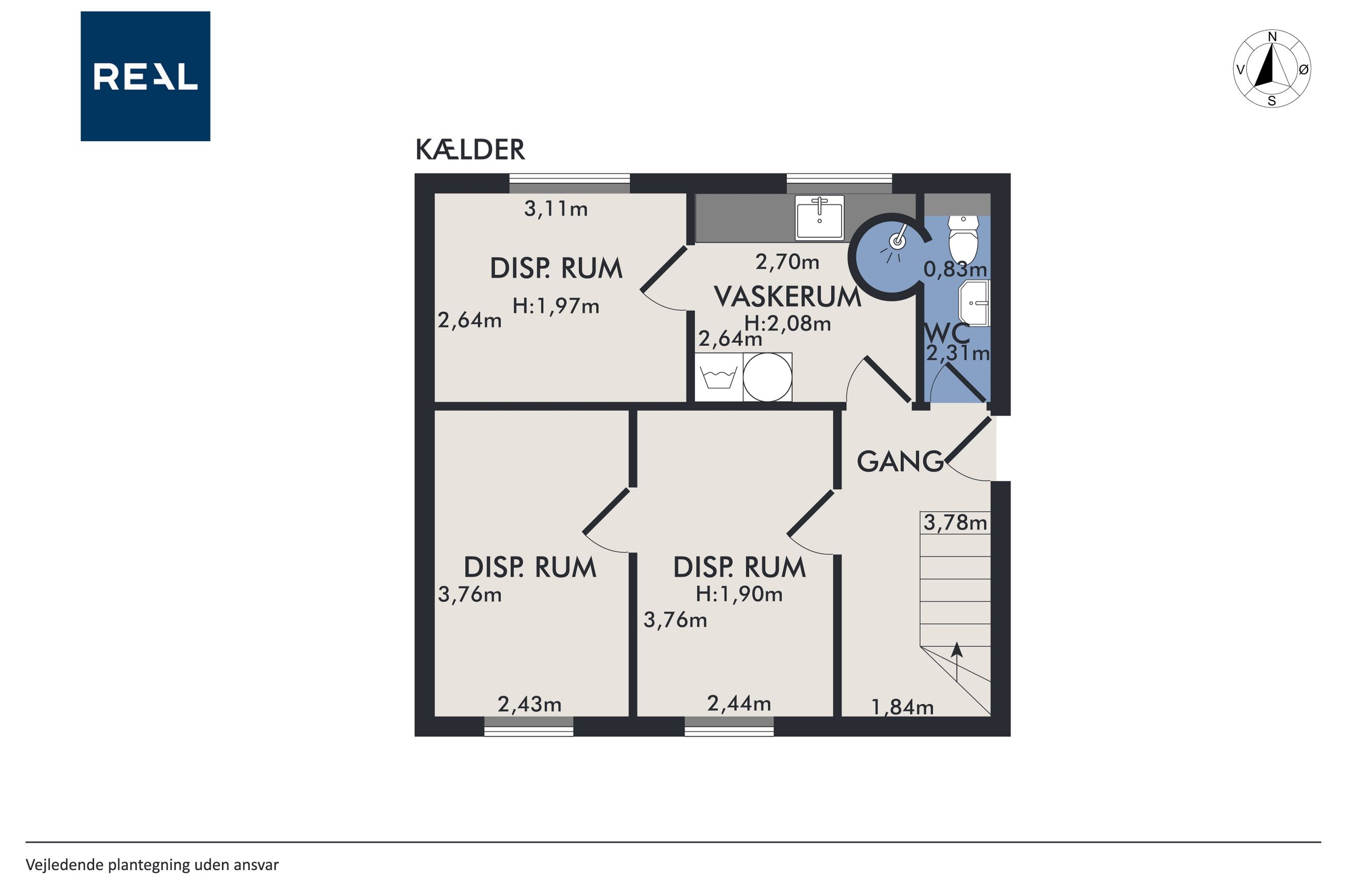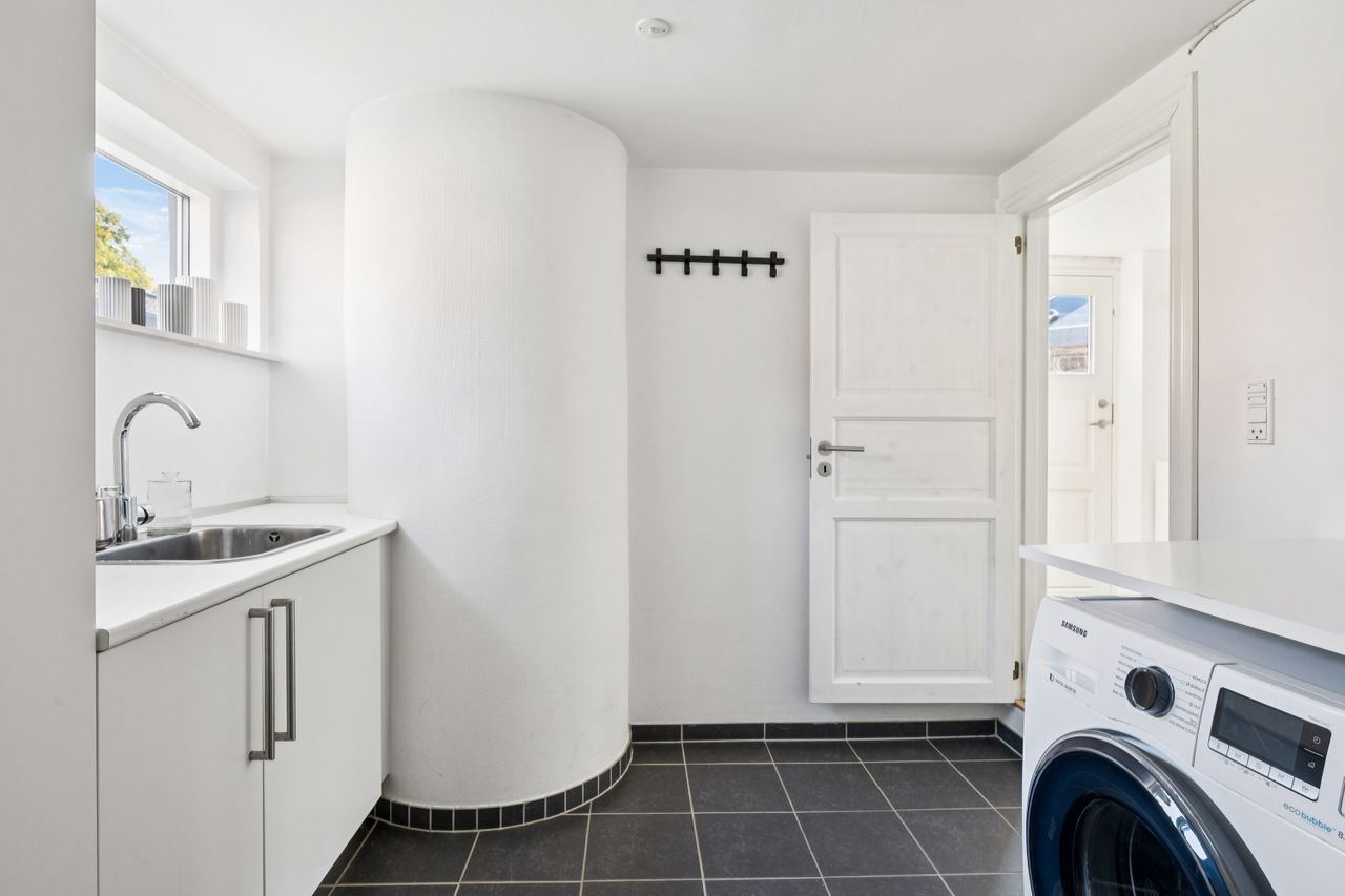 Kælder: Tre disponible rum med alsidige muligheder – fx hobbyrum, kontor eller opbevaring, vaskerum med vaskefaciliteter, gang og endnu et lækket badeværelse.