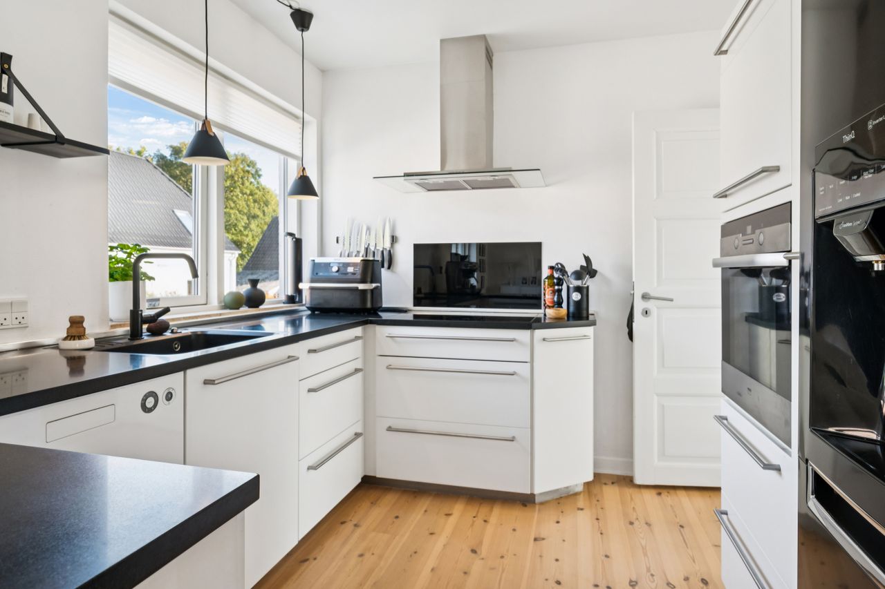 Med respekt for husets klassiske arkitektur er boligen gennemrenoveret til perfektion, så alt fremstår topmoderne uden at miste den unikke byggestil, som kun en villa fra 1930 kan tilbyde. Her finder du et stort, lyst køkken-alrum i åben forbindelse med den rummelige stue – det perfekte samlingspunkt for både hverdag og fest.