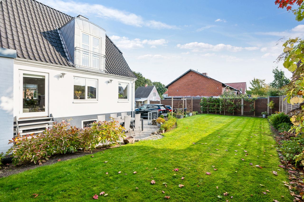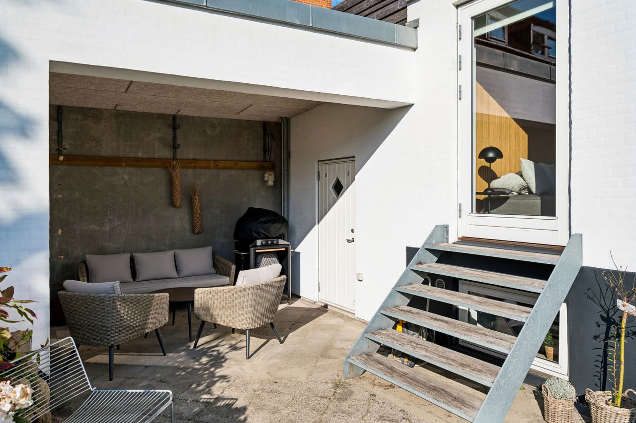 Haven er en lille oase – vendt optimalt mod solen og med hyggelige kroge at nyde både solrige dage og lune sommeraftener under den overdækkede terrasse, hvor skygge og læ giver komfort året rundt.