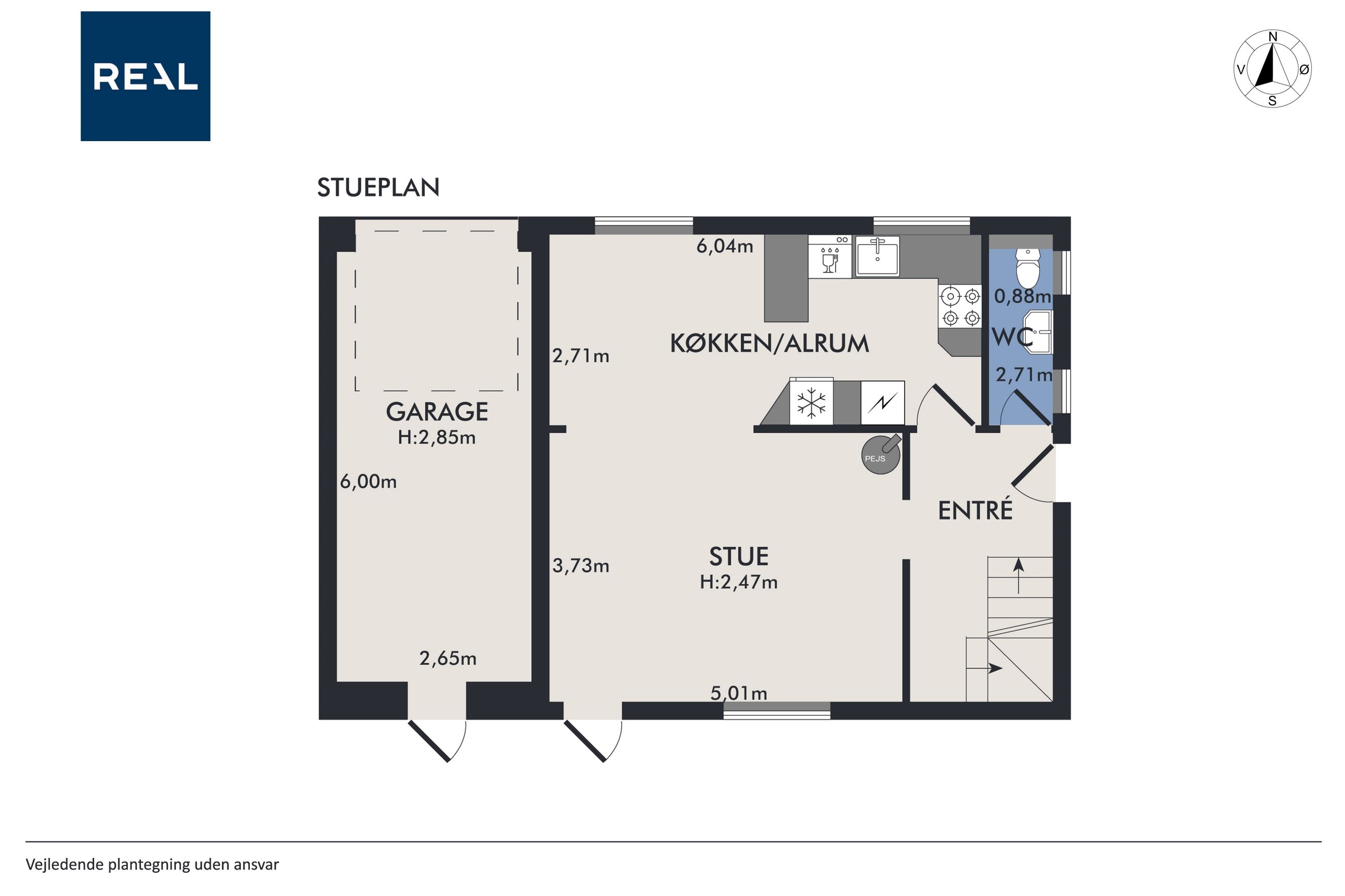 Stueplan: Entré, gæstetoilet, lækkert lyst køkken-alrum i åben forbindelse med den store lyse stue med udgang til terrassen. Og så selvfølgelig garagen.