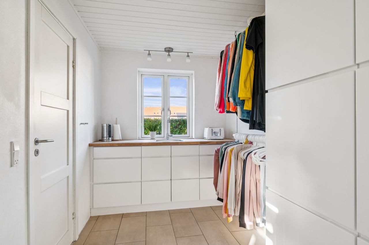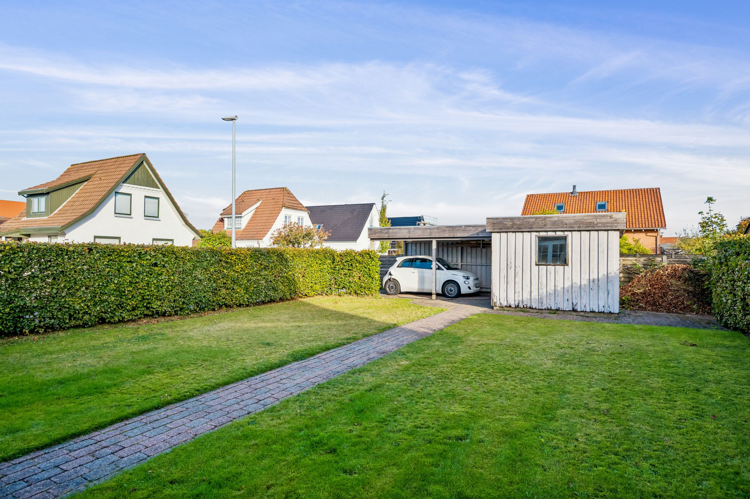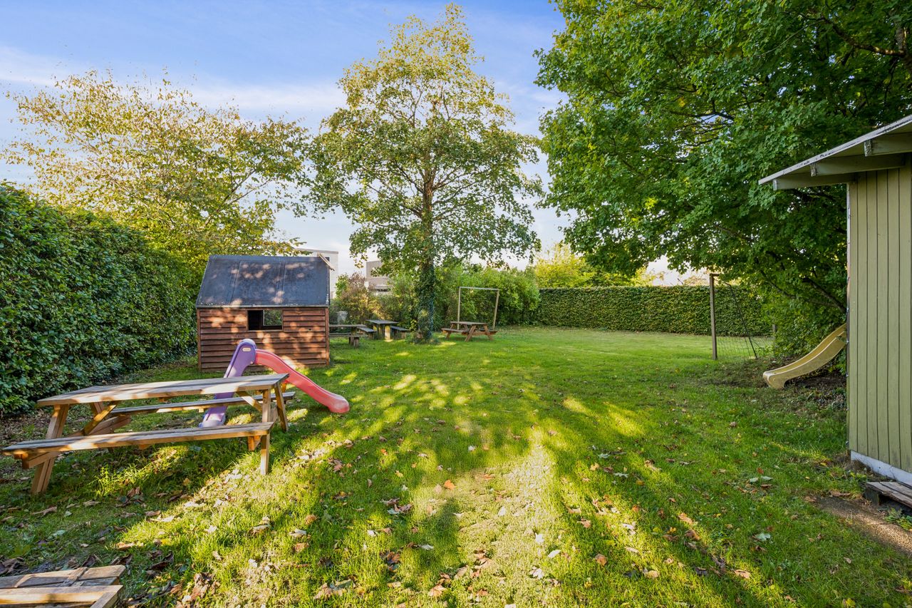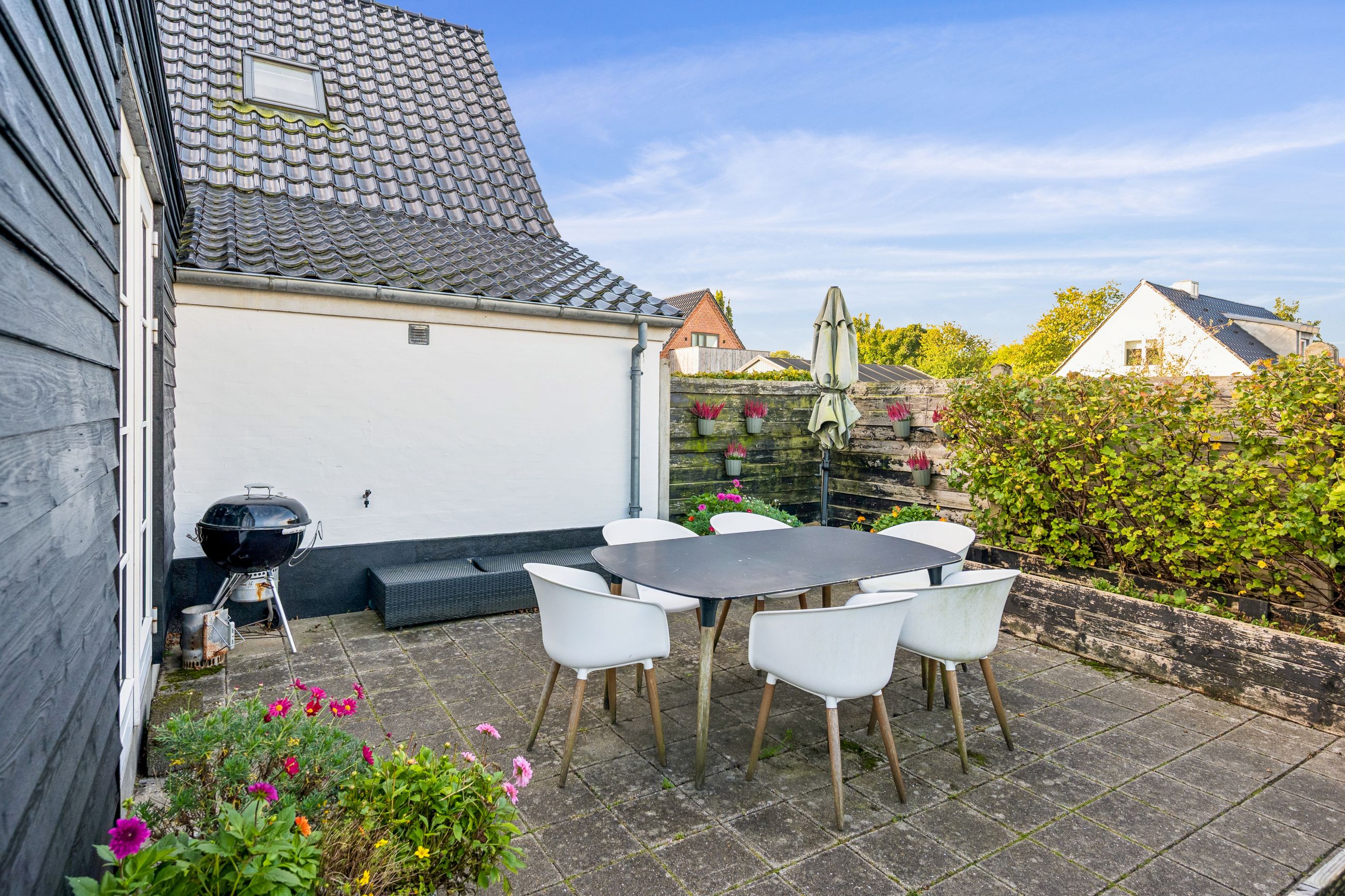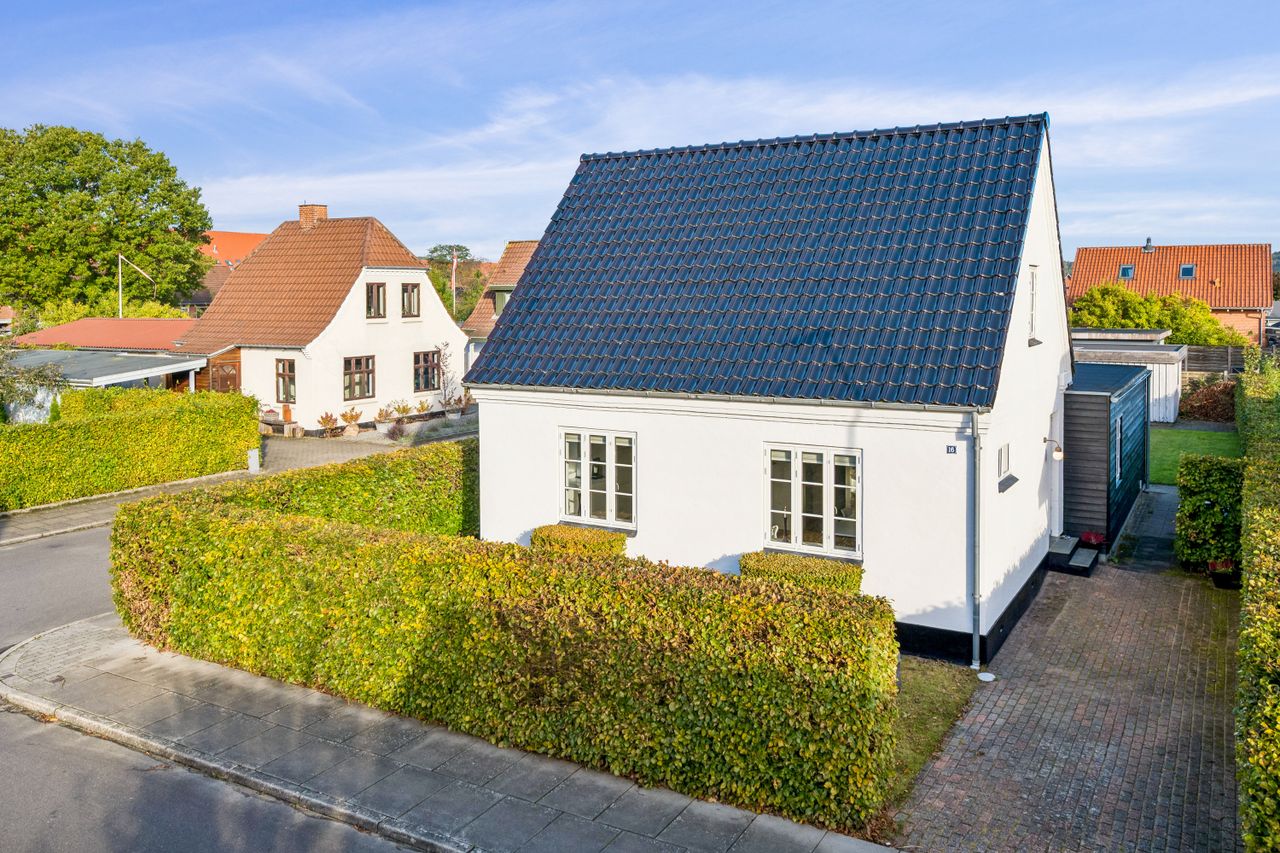 Resultatet er et hjem, der både er praktisk, lyst og fuld af atmosfære. Uderummet er mindst lige så indbydende. Terrassen vender perfekt mod sydvest. Den store grund afgrænset af bøgehæk giver masser af luft til naboerne og en sjælden følelse af privatliv midt i byen. Det eksisterende udhus har krafttilslutning og rummer et oplagt potentiale som værksted eller hobbyrum. Carport og udhus fik nyt tag i 2020.