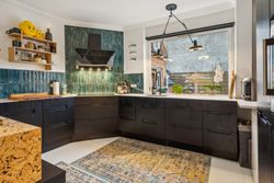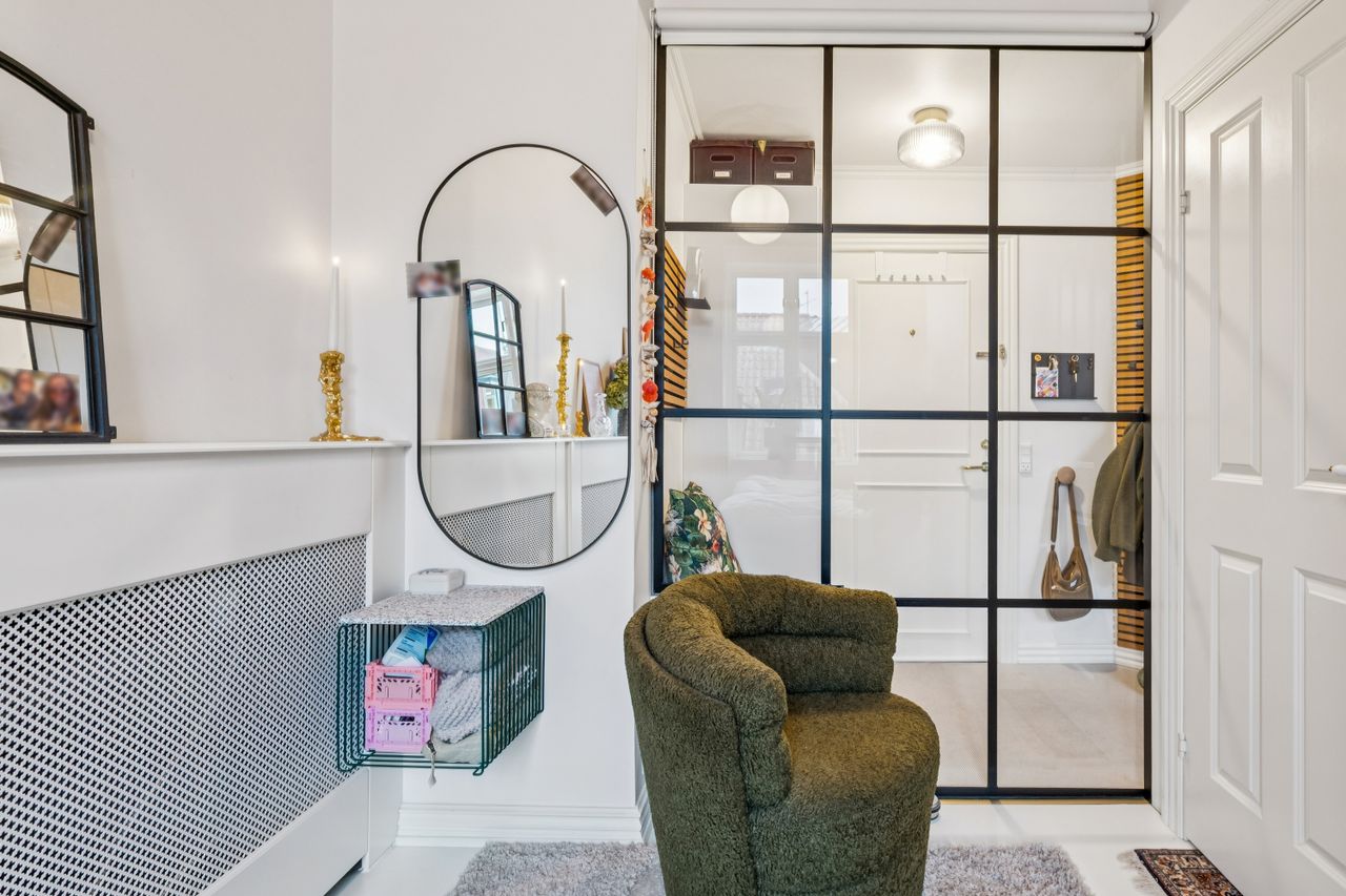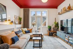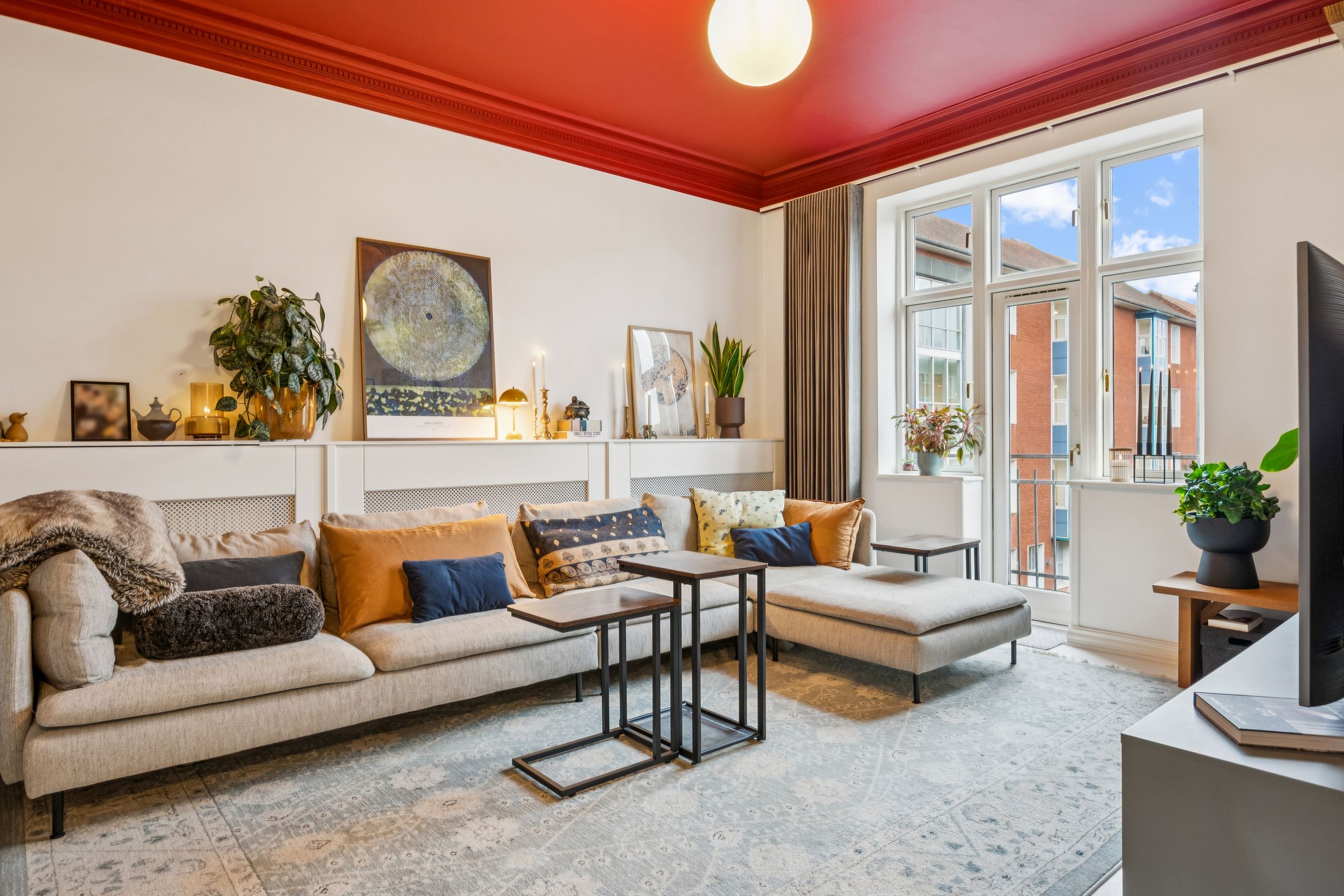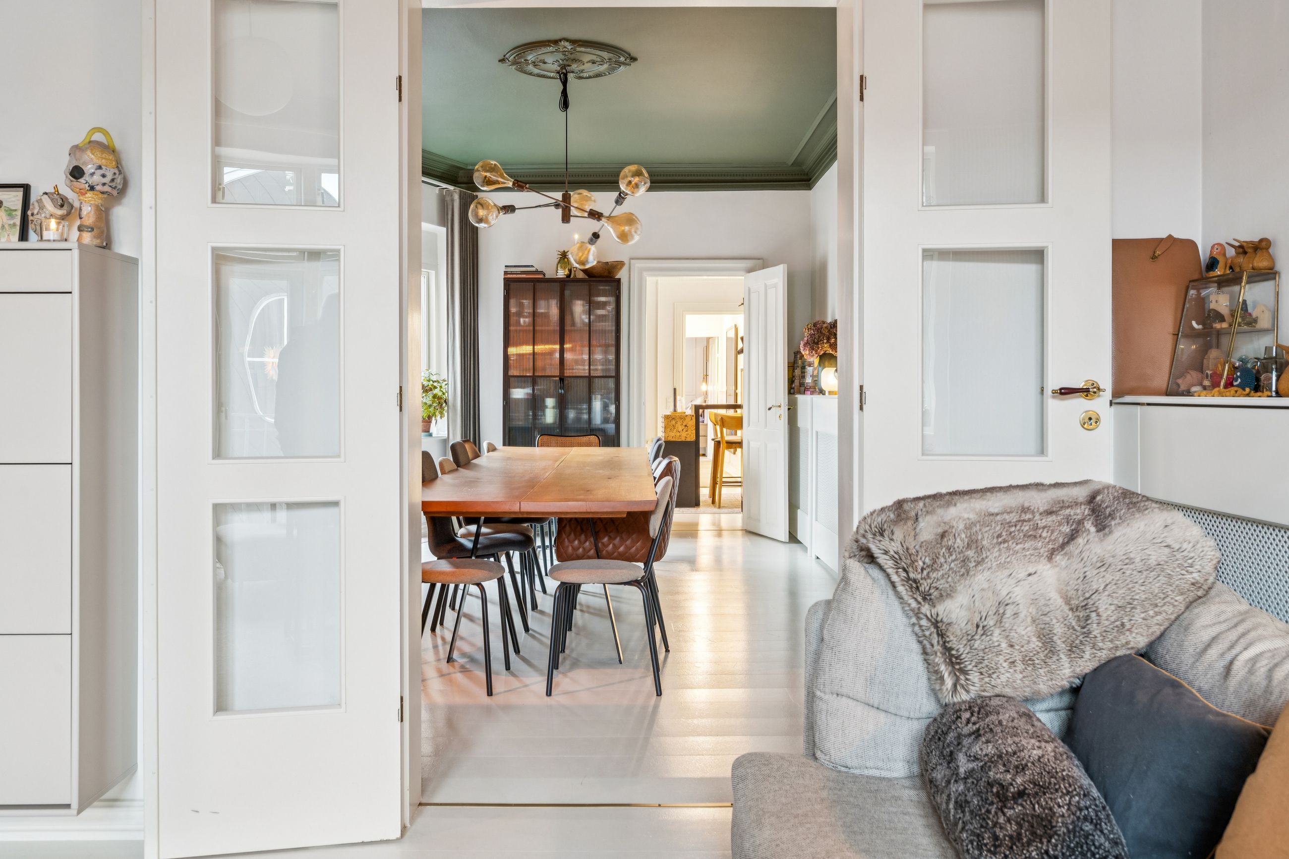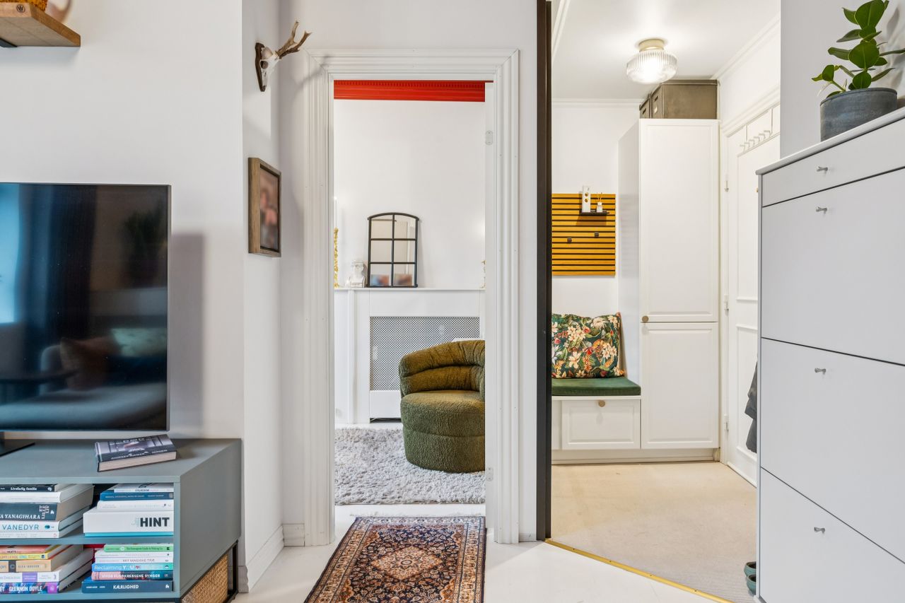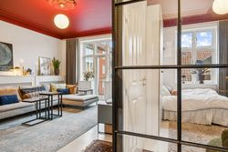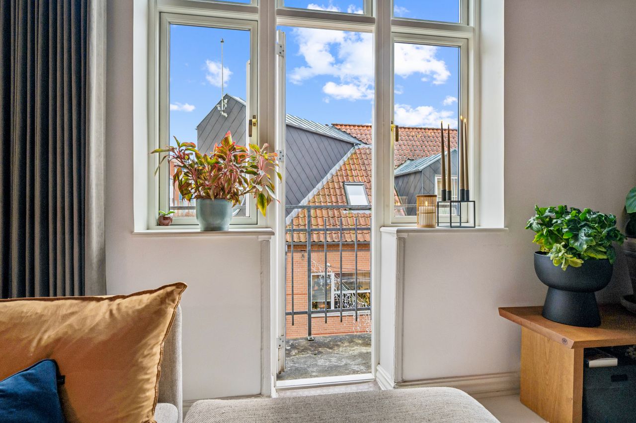Den hyggelige stue danner et naturligt samlingspunkt med endnu en altan og smukke detaljer i både lofter og gulve. I alt tre altaner giver lejligheden en sjælden følelse af lys, luft og udsyn.