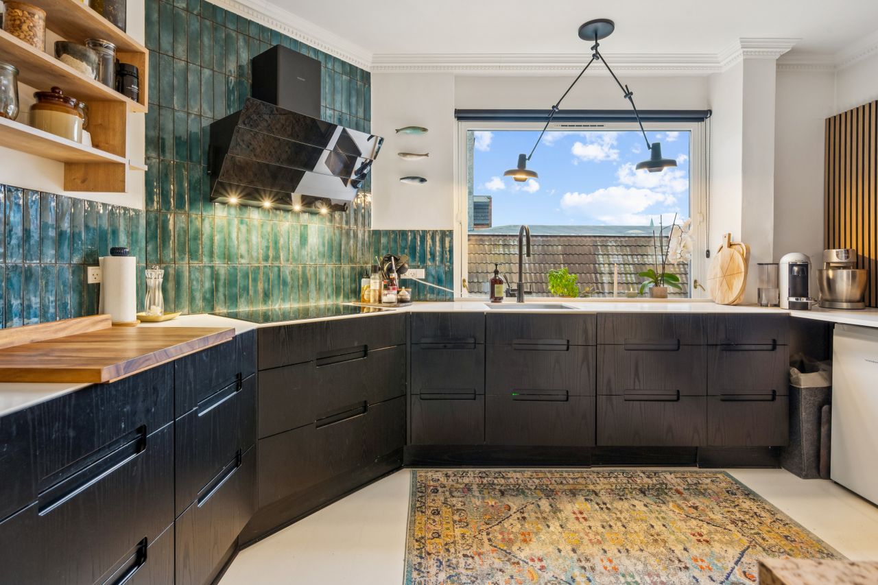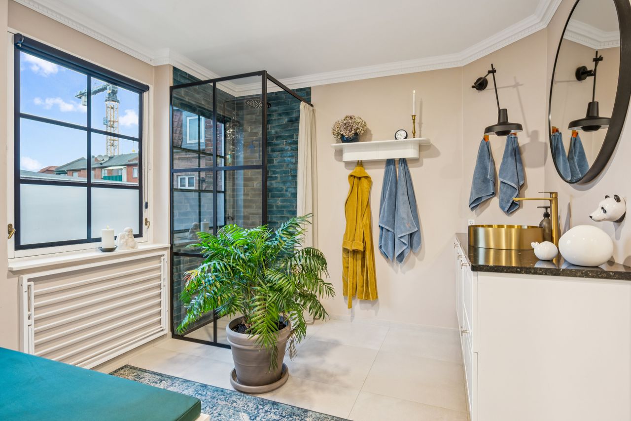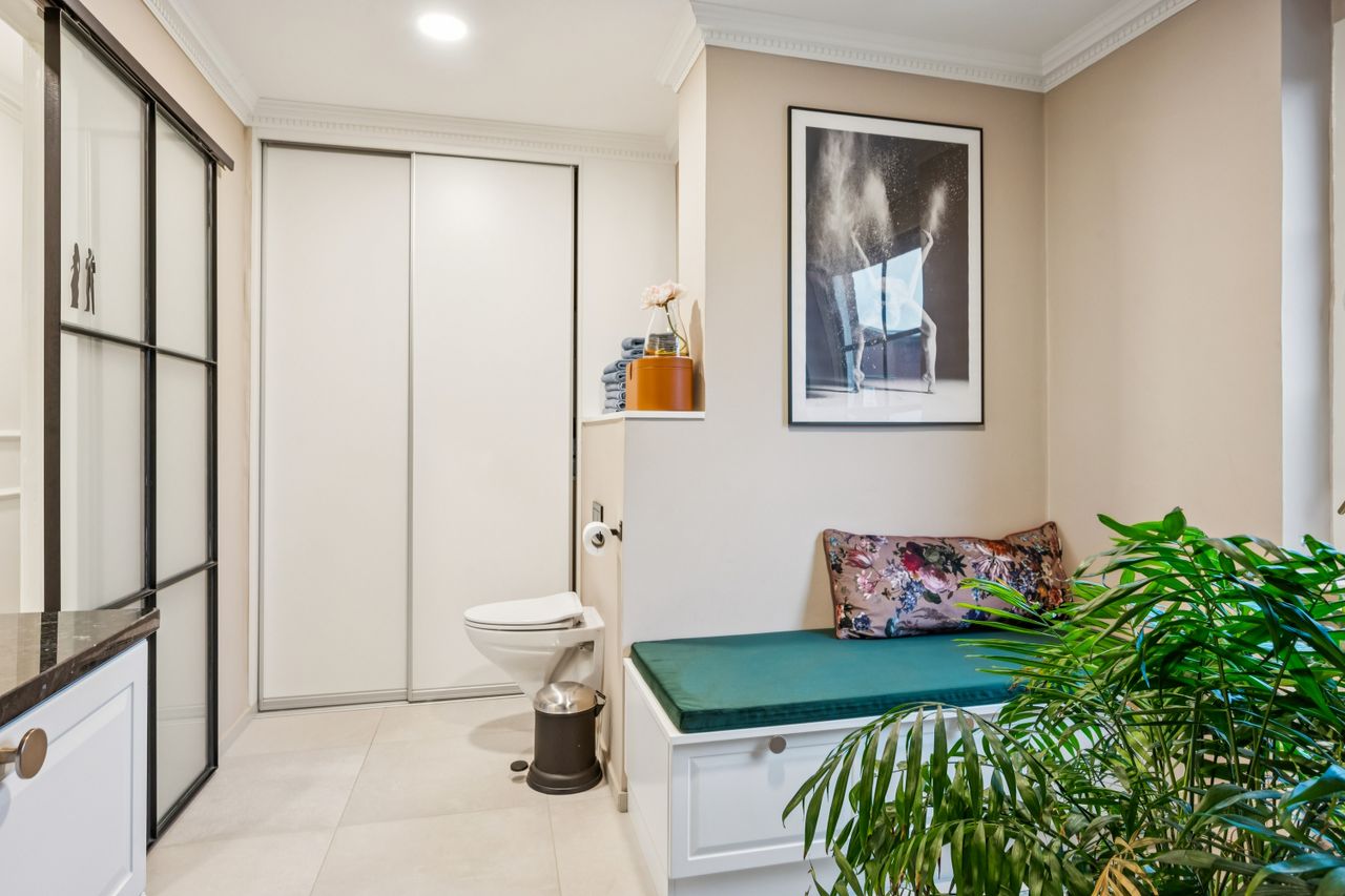 Badeværelset er i særklasse – stort, velindrettet og udført med kvalitetsinventar og lækre materialer, der understreger den gennemførte æstetik. Dertil har du vaskesøjle gemt pænt væk bag skabslågerne.