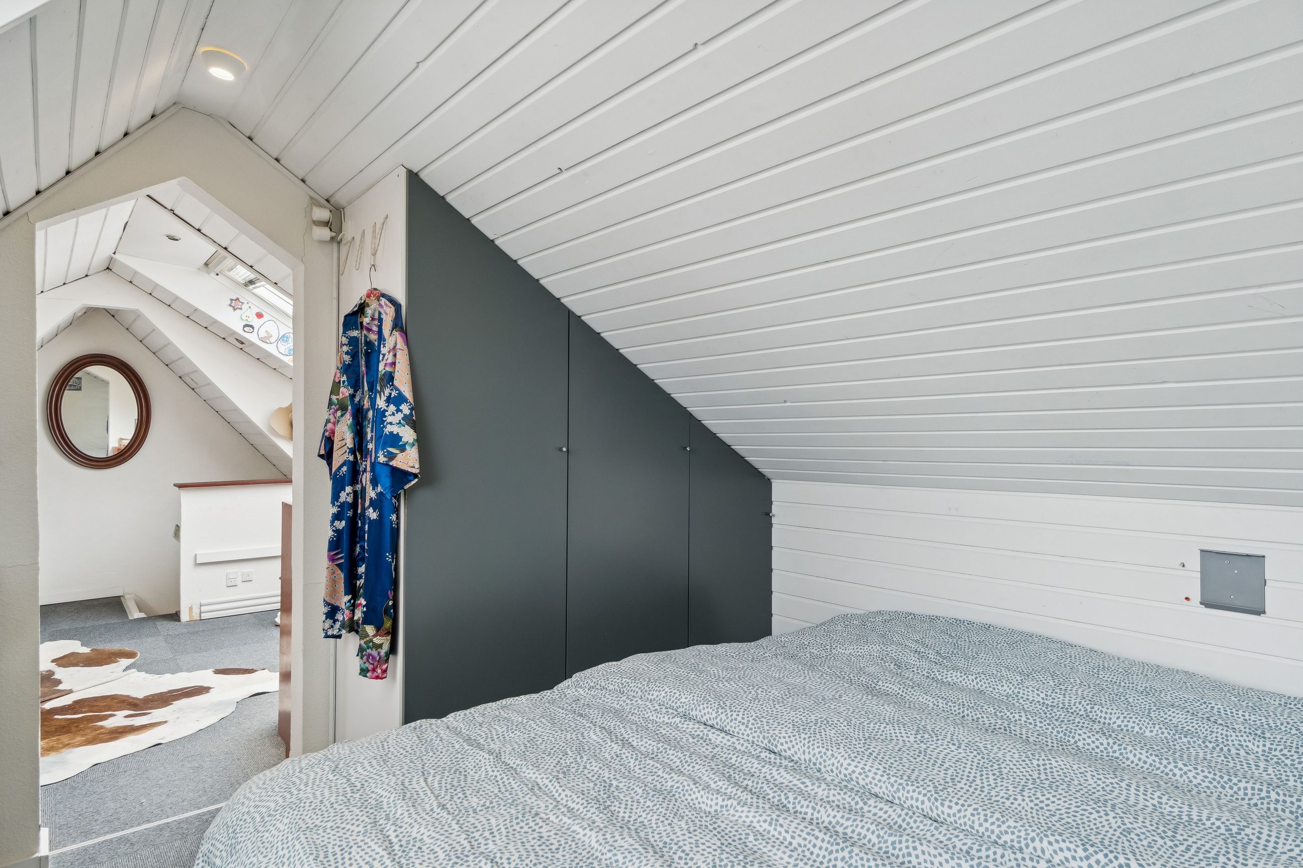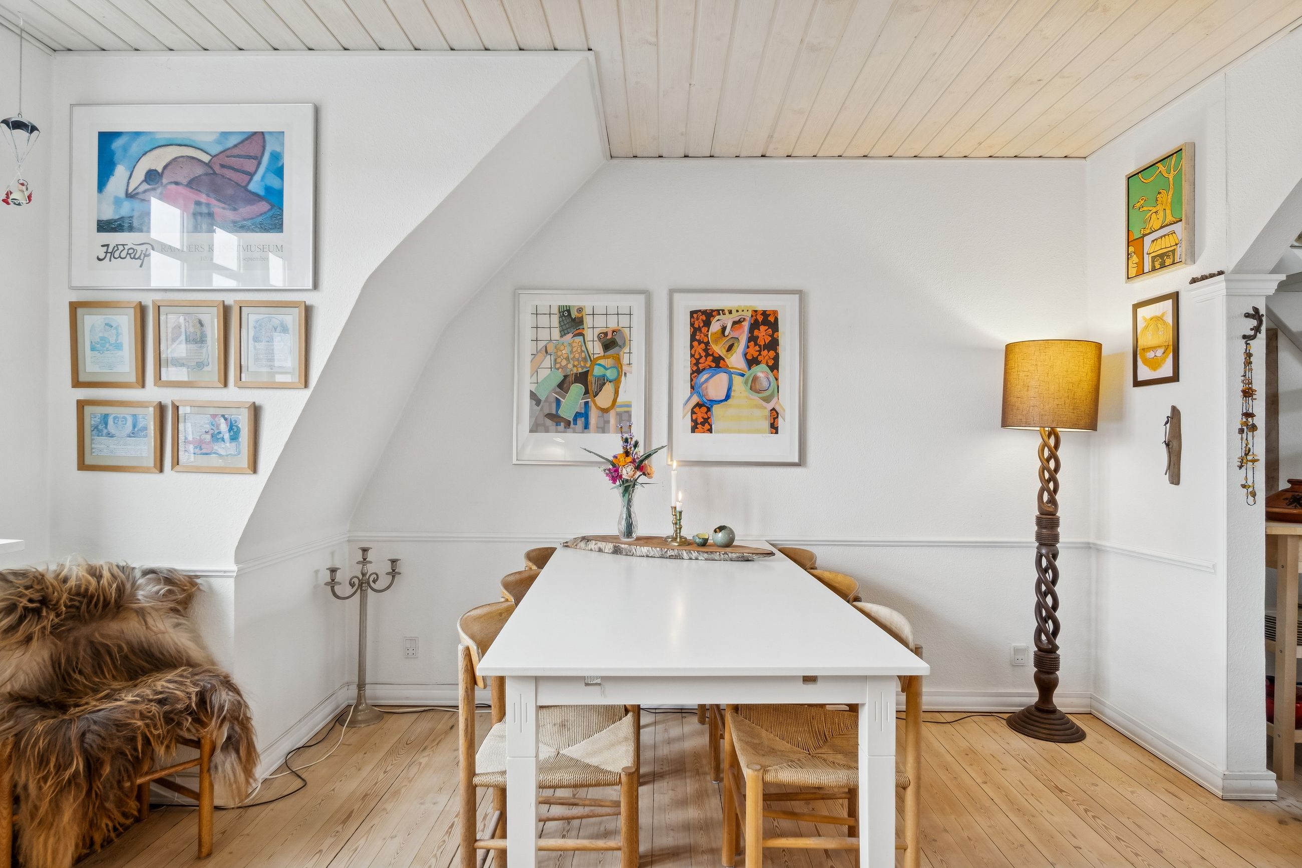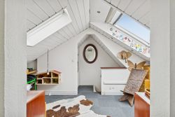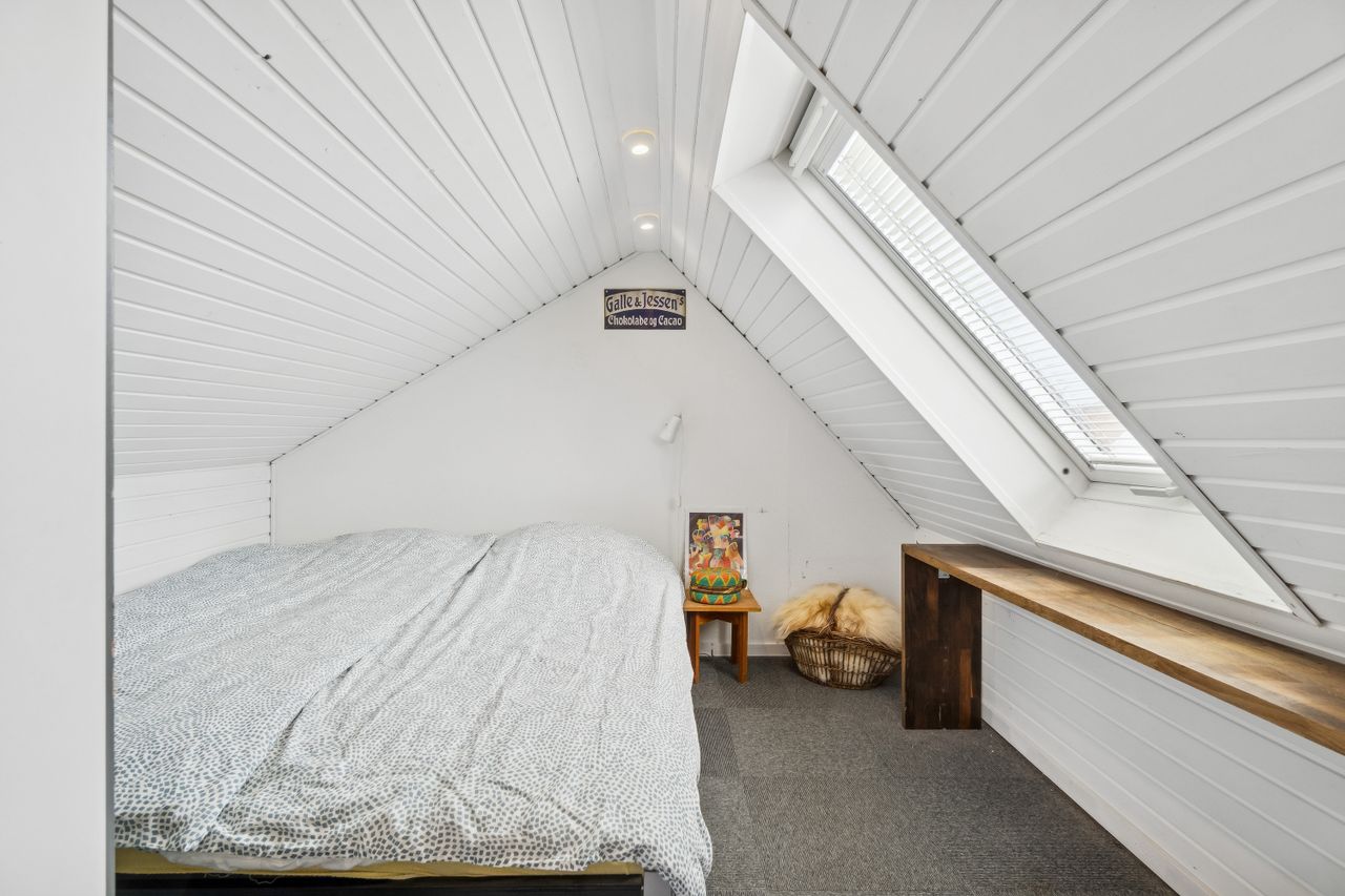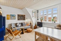 Lejlighedens hjerte - opholdsrummet - er stort, rummeligt og gennemlyst, og med en stor bredskuldret kvist ud mod gaden, som gør at man helt glemmer den smule skråvægge der er i lejligheden. Også i køkkenet er der en god stor kvist.