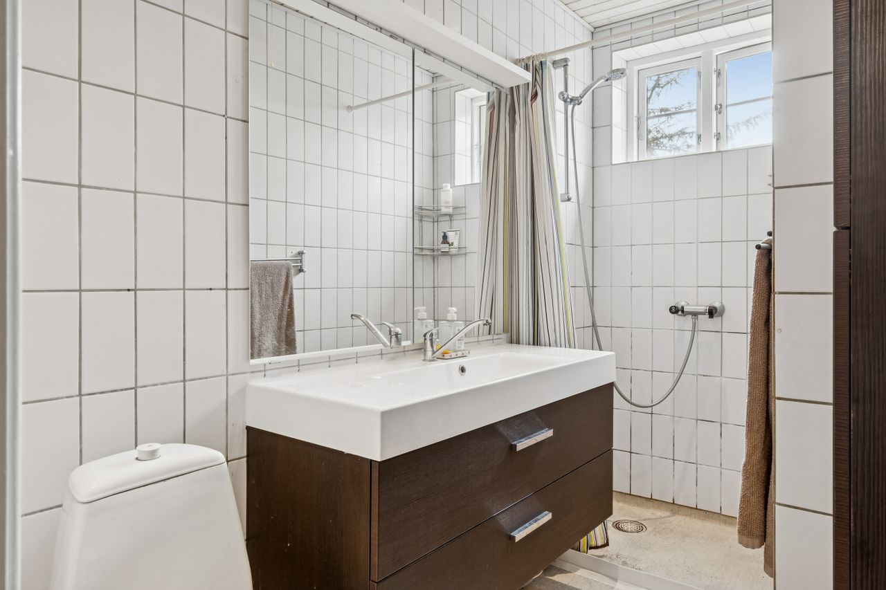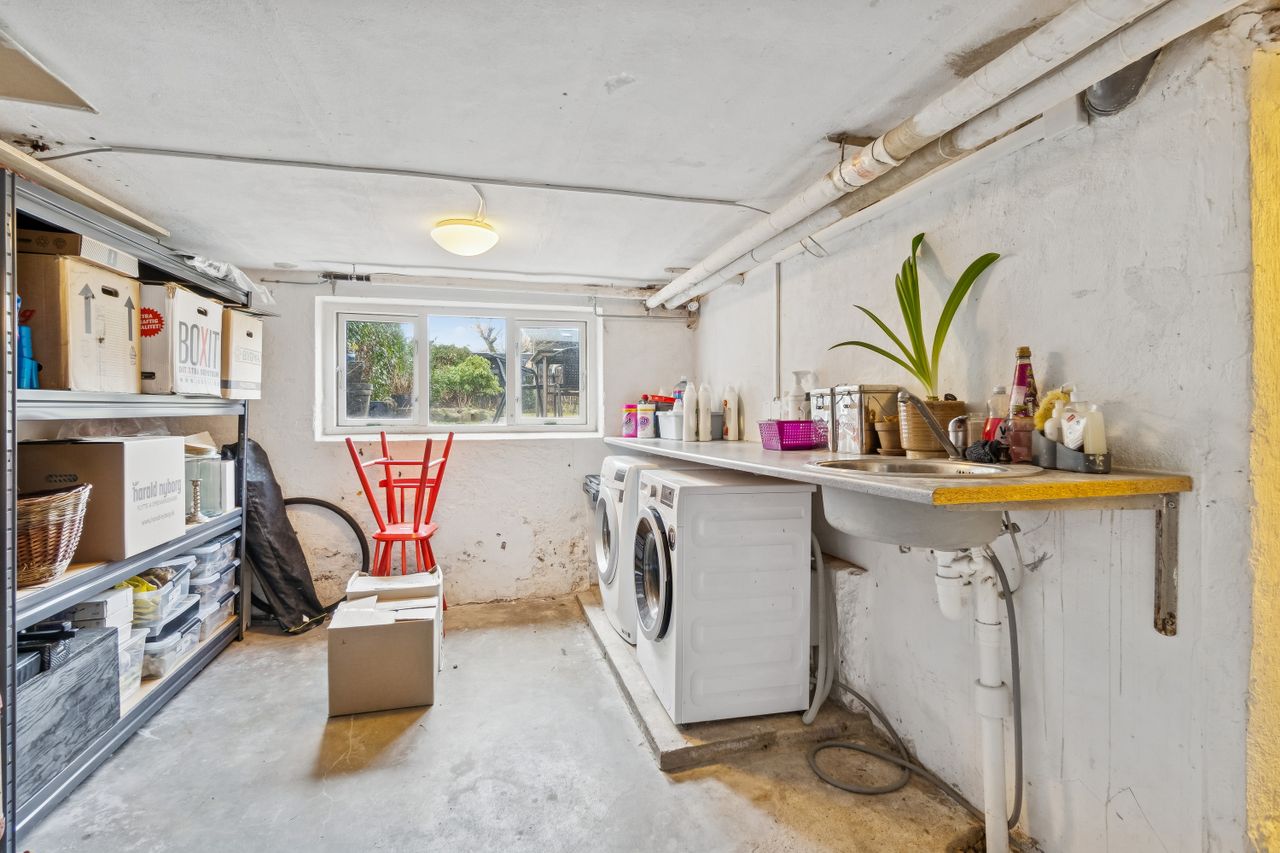 Til lejligheden hører også brugsret til et pulterrum i kælderen og et stort kælderrum med værkstedsbord og mere god opbevaring, fælles med den ene stuelejlighed. Endelig er der en vaskekælder, ligeledes fælles med den ene stuelejlighed.