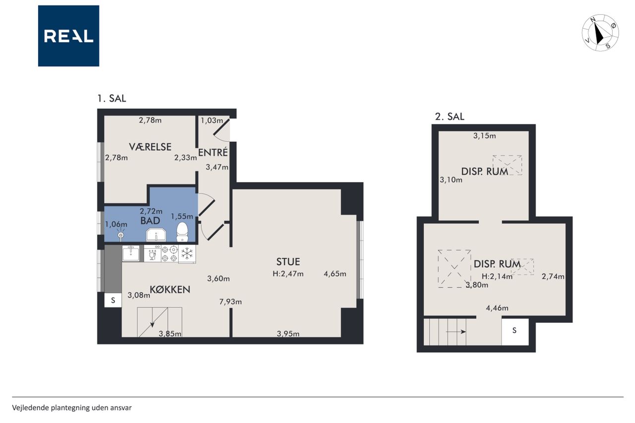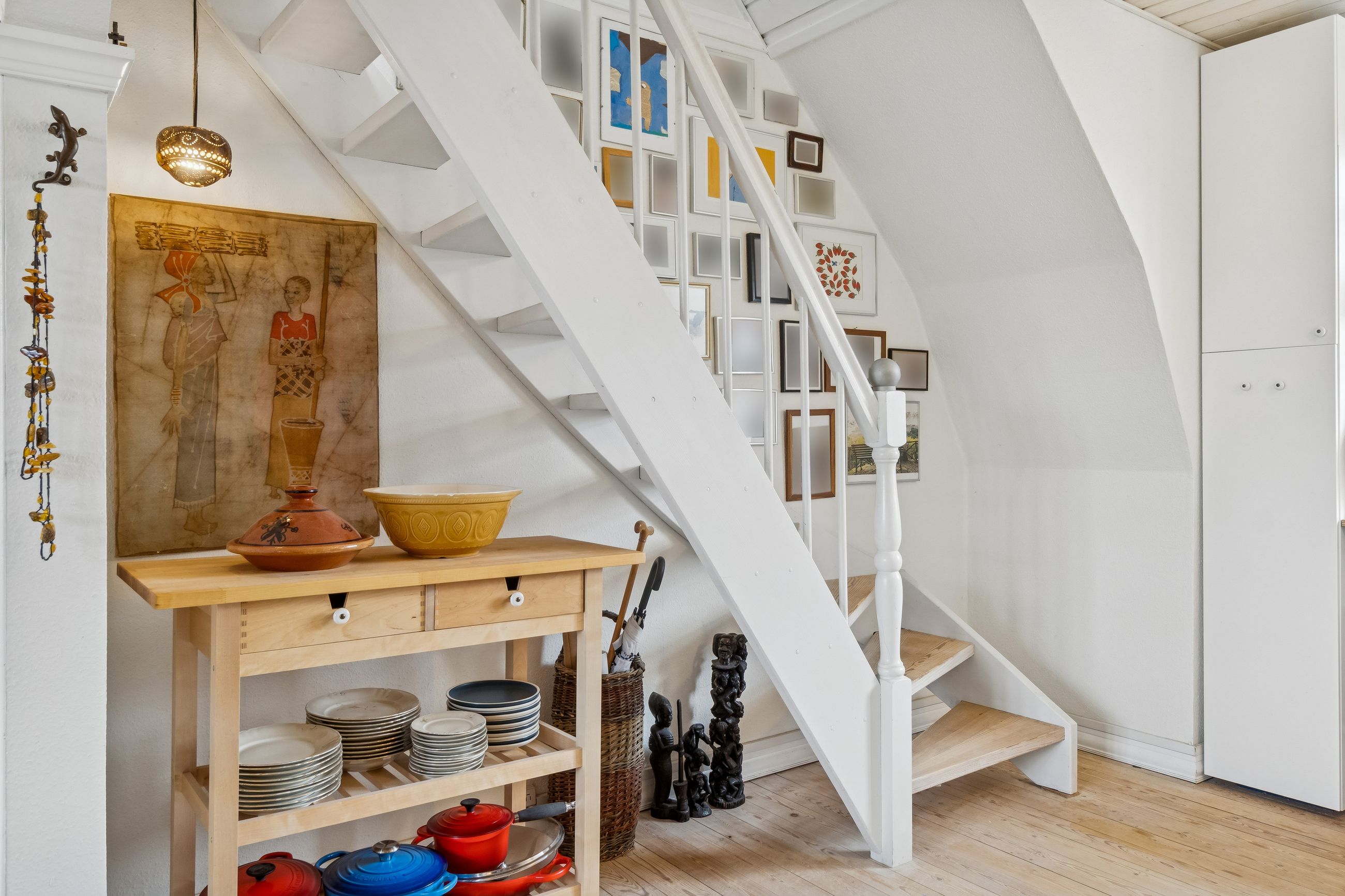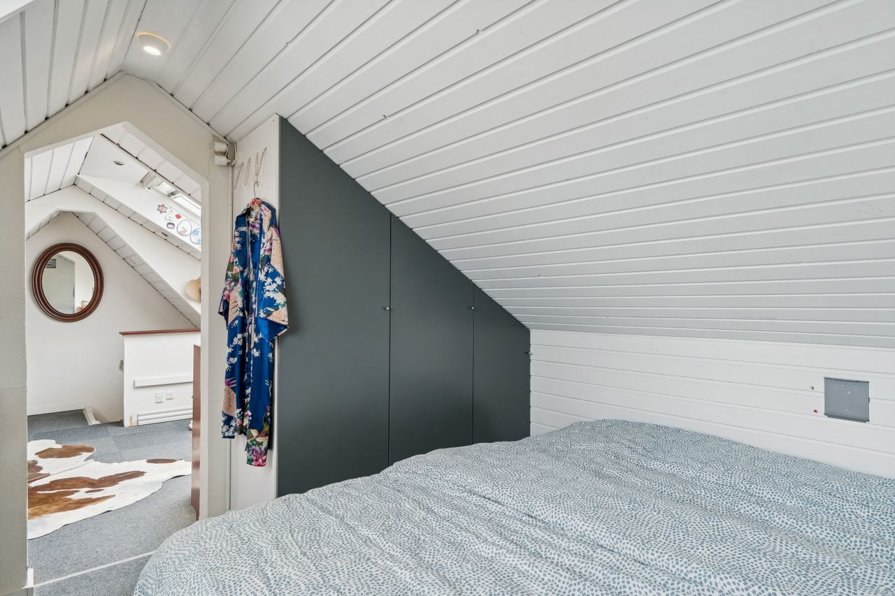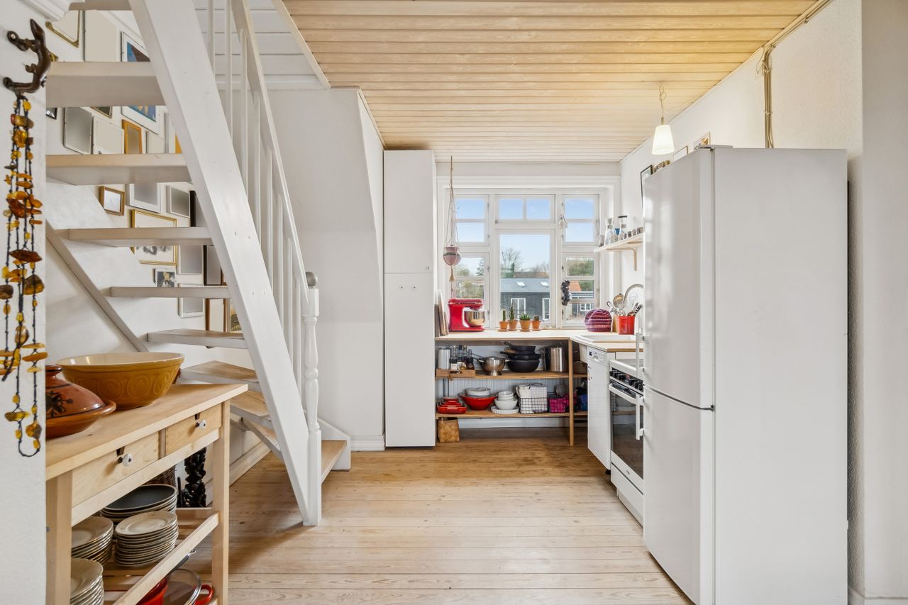 I køkkenet går der er åben trappe op til ejendommens 2.sal, hvor du finder to gode isolerede loftsrum i direkte og åben forbindelse med lejligheden. Loftsrummene er ikke en del af lejlighedens boligareal, så det er altså god ekstra plads, oveni lejlighedens 53 m2 boligareal.