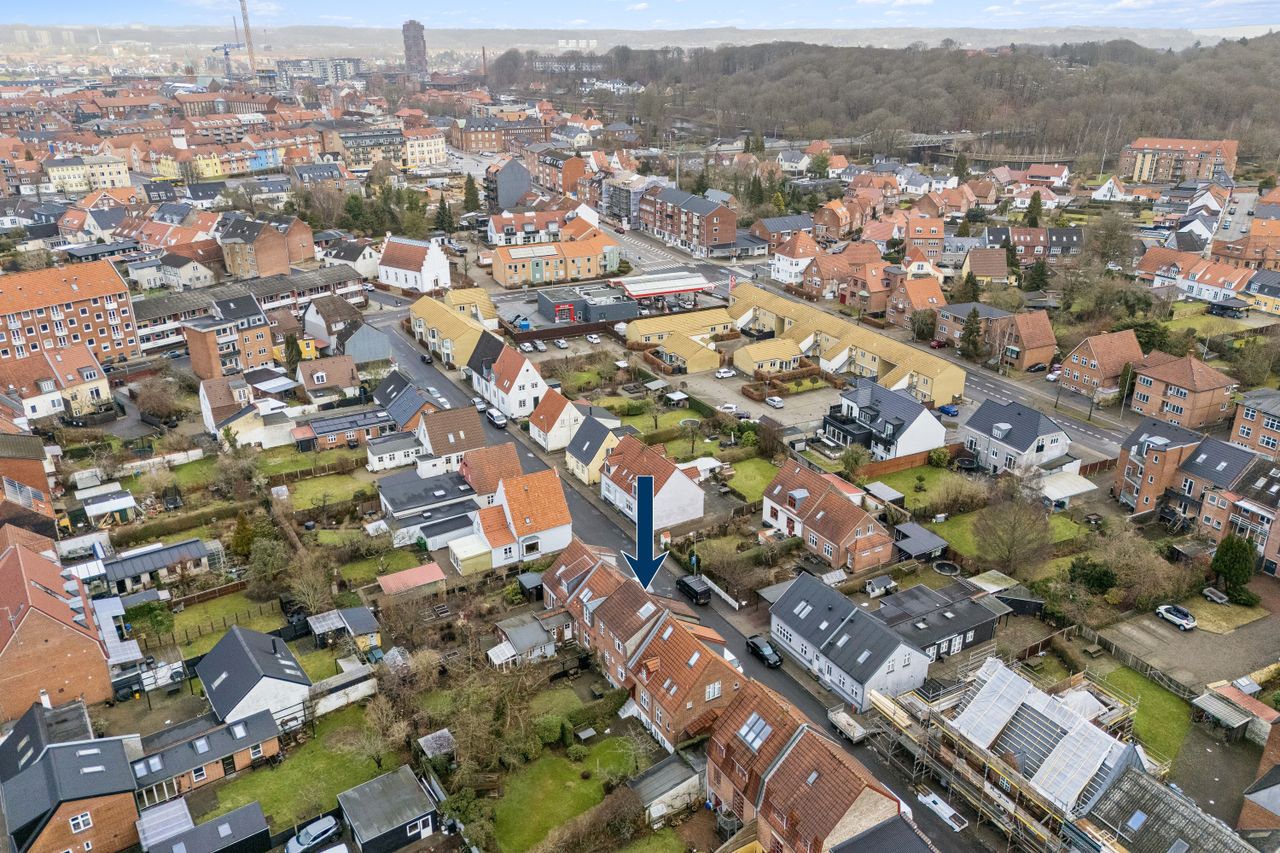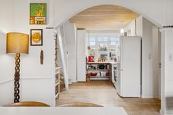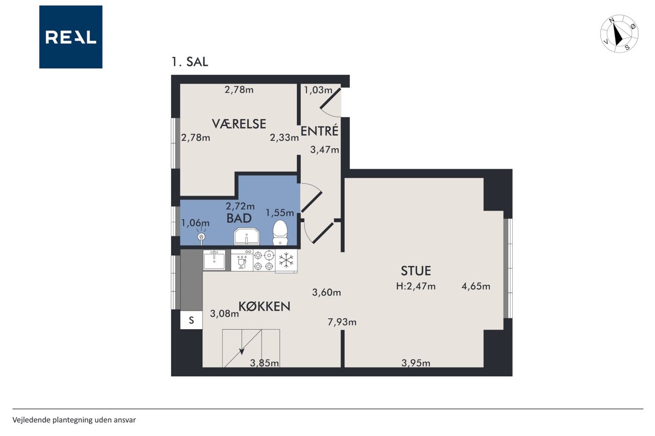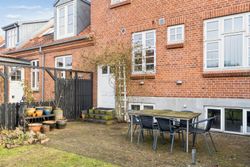 Fra gadedøren er der gennemgang til haven, trappe ned til ejendommens kælder, og en pæn trappe op til lejlighedens hoveddør. På reposen er der god plads til sko og overtøj. Fra lejlighedens entré er der adgang til soveværelset, lejlighedens meget store badeværelse og det store åbne opholdsrum med stue, køkken og alum.