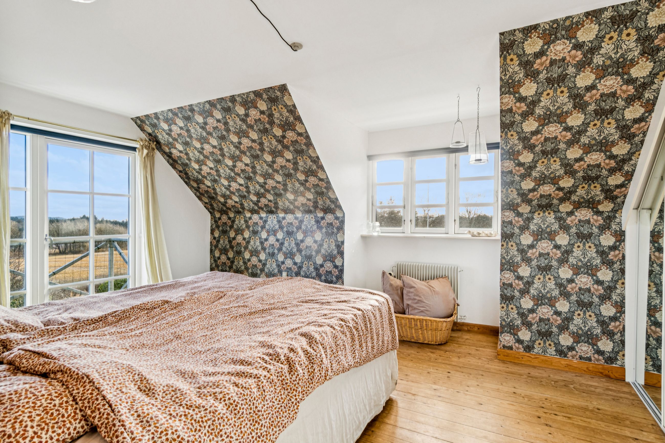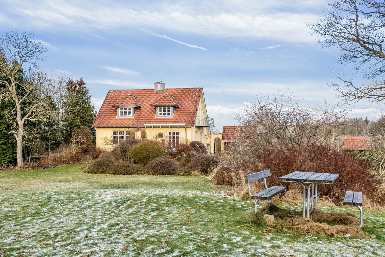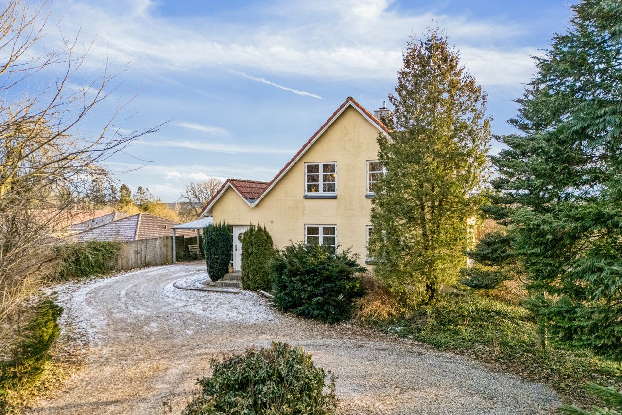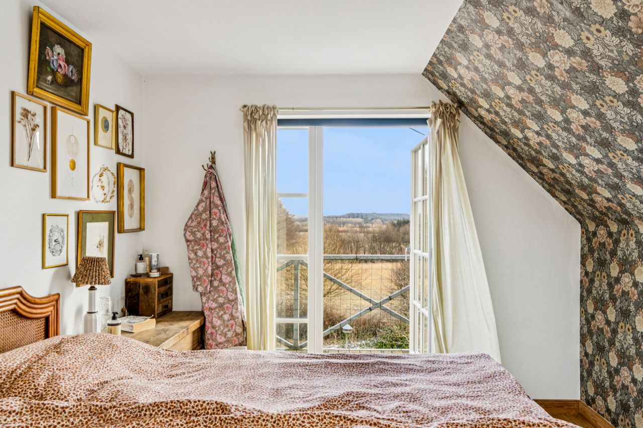 Indvendigt mødes I af hyggelige opholdsrum med en varm og hjemlig atmosfære. Her er plads til både samvær og fordybelse, og flere steder i boligen kan I nyde udsigten til det omkringliggende landskab, som skifter karakter med årstiderne. De store vinduespartier trækker naturen helt ind i hjemmet og understreger den landlige charme.