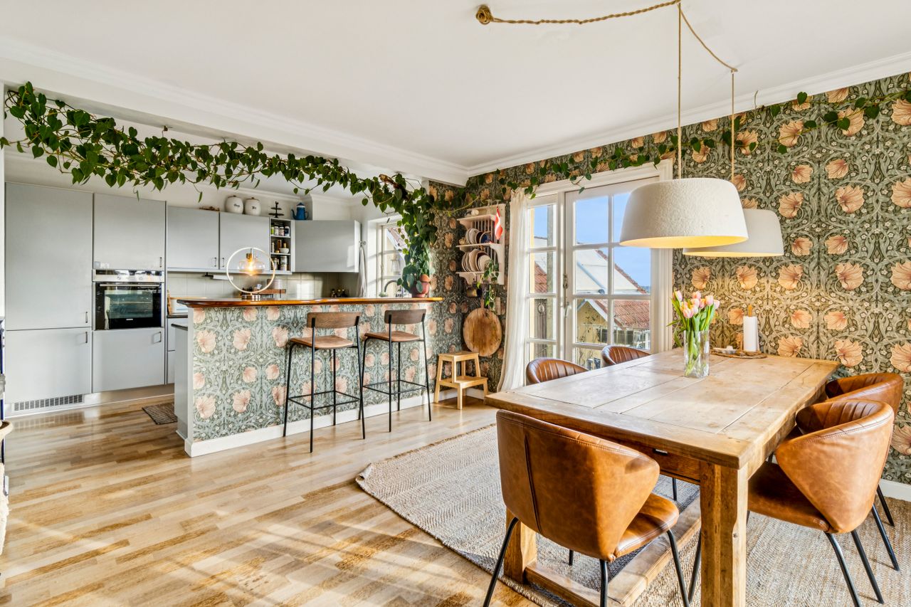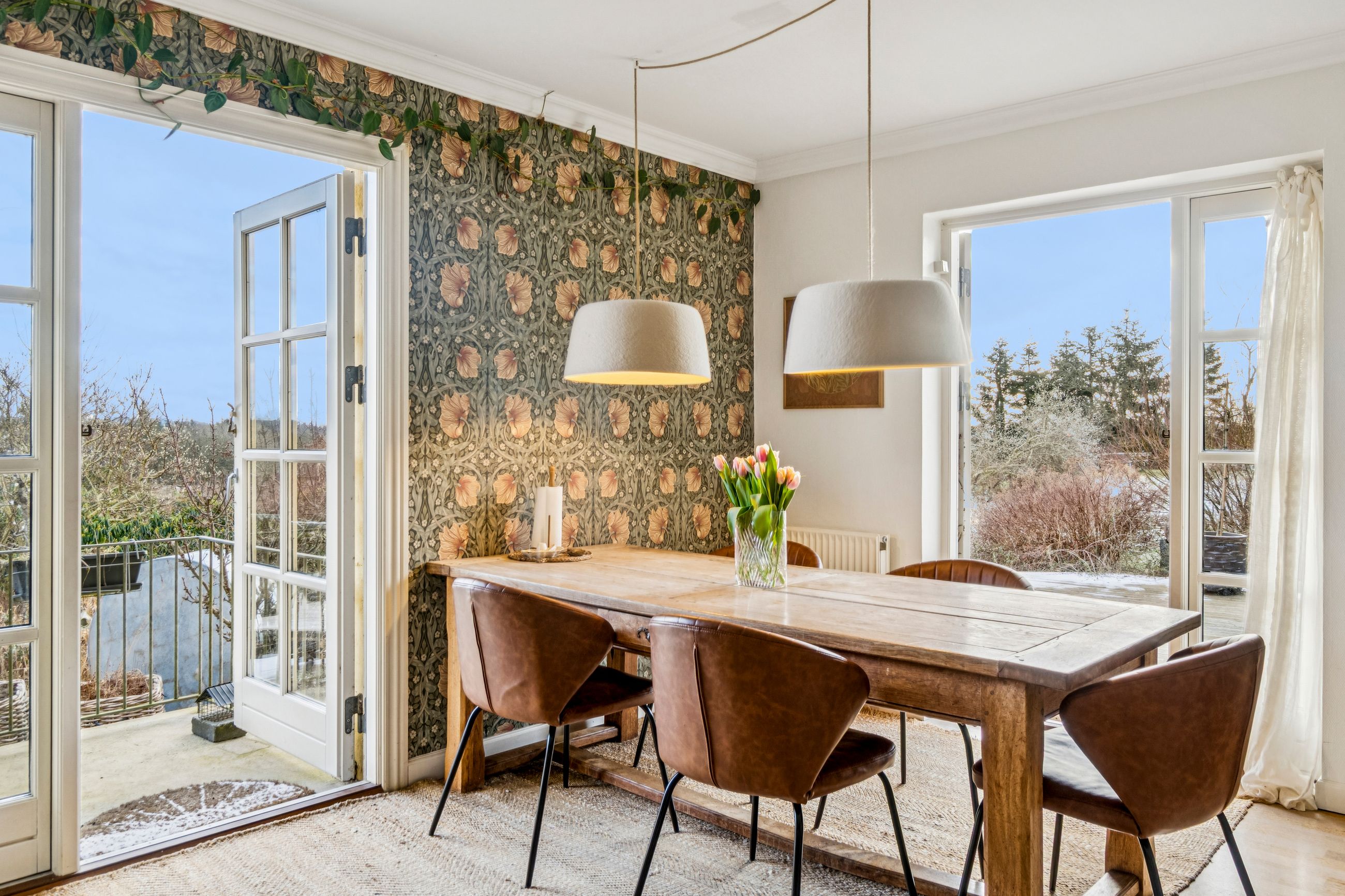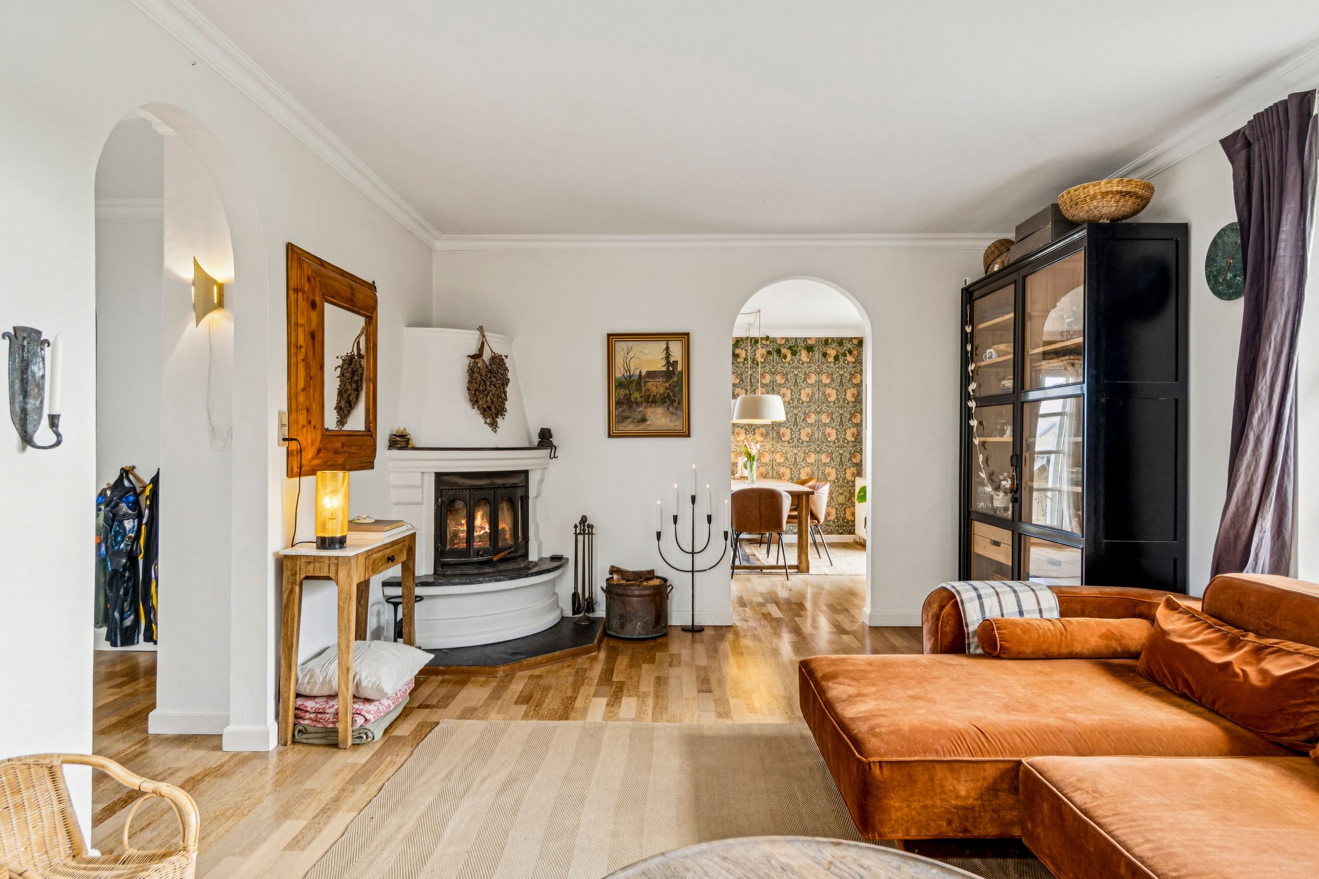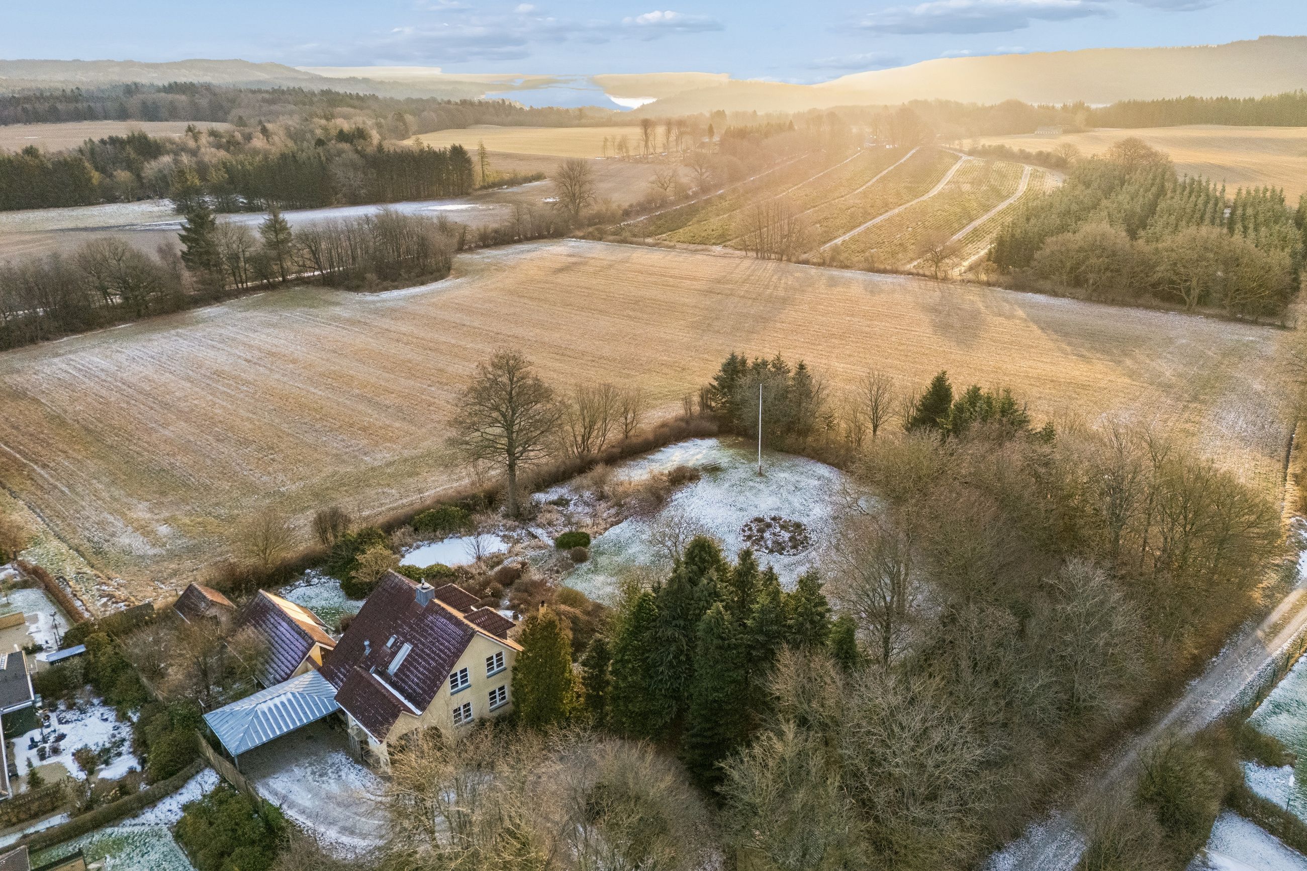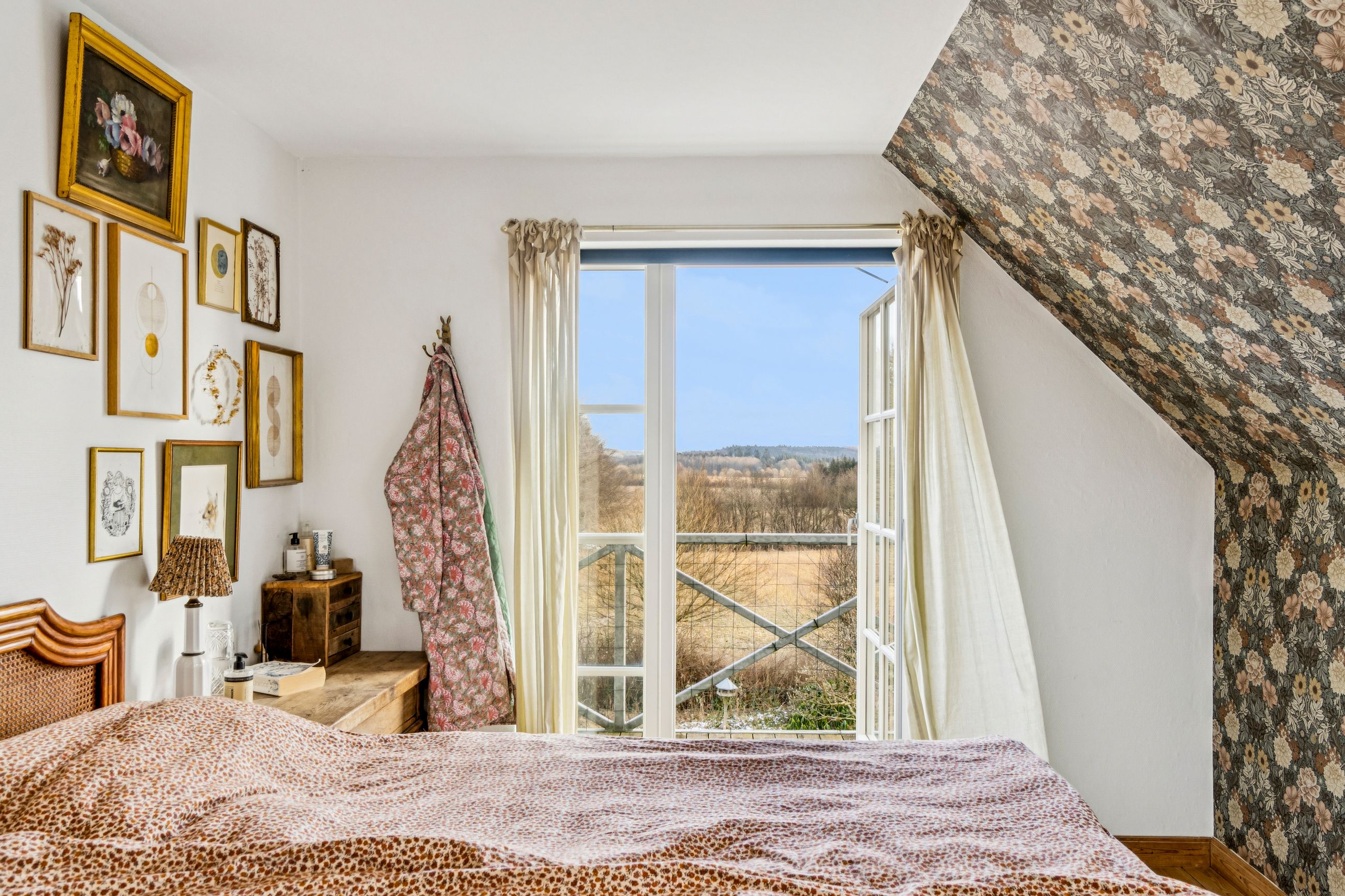 Indvendigt mødes I af hyggelige opholdsrum med en varm og hjemlig atmosfære. Her er plads til både samvær og fordybelse, og flere steder i boligen kan I nyde udsigten til det omkringliggende landskab, som skifter karakter med årstiderne. De store vinduespartier trækker naturen helt ind i hjemmet og understreger den landlige charme.
