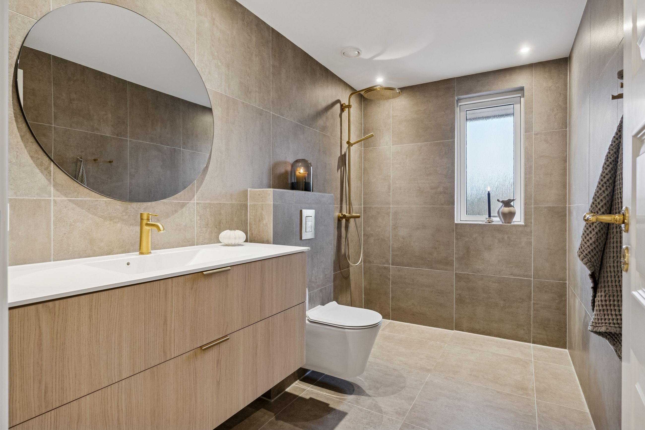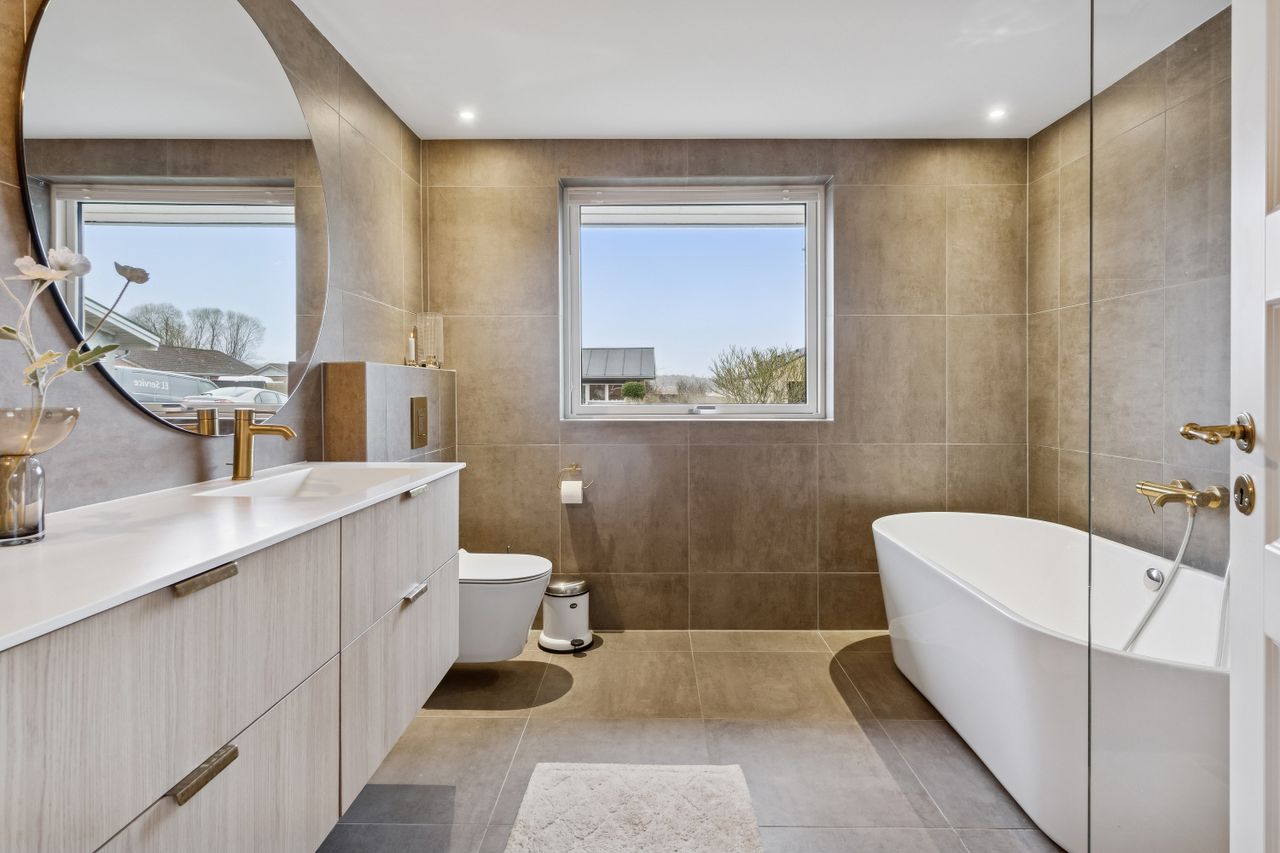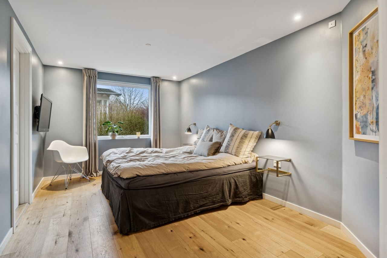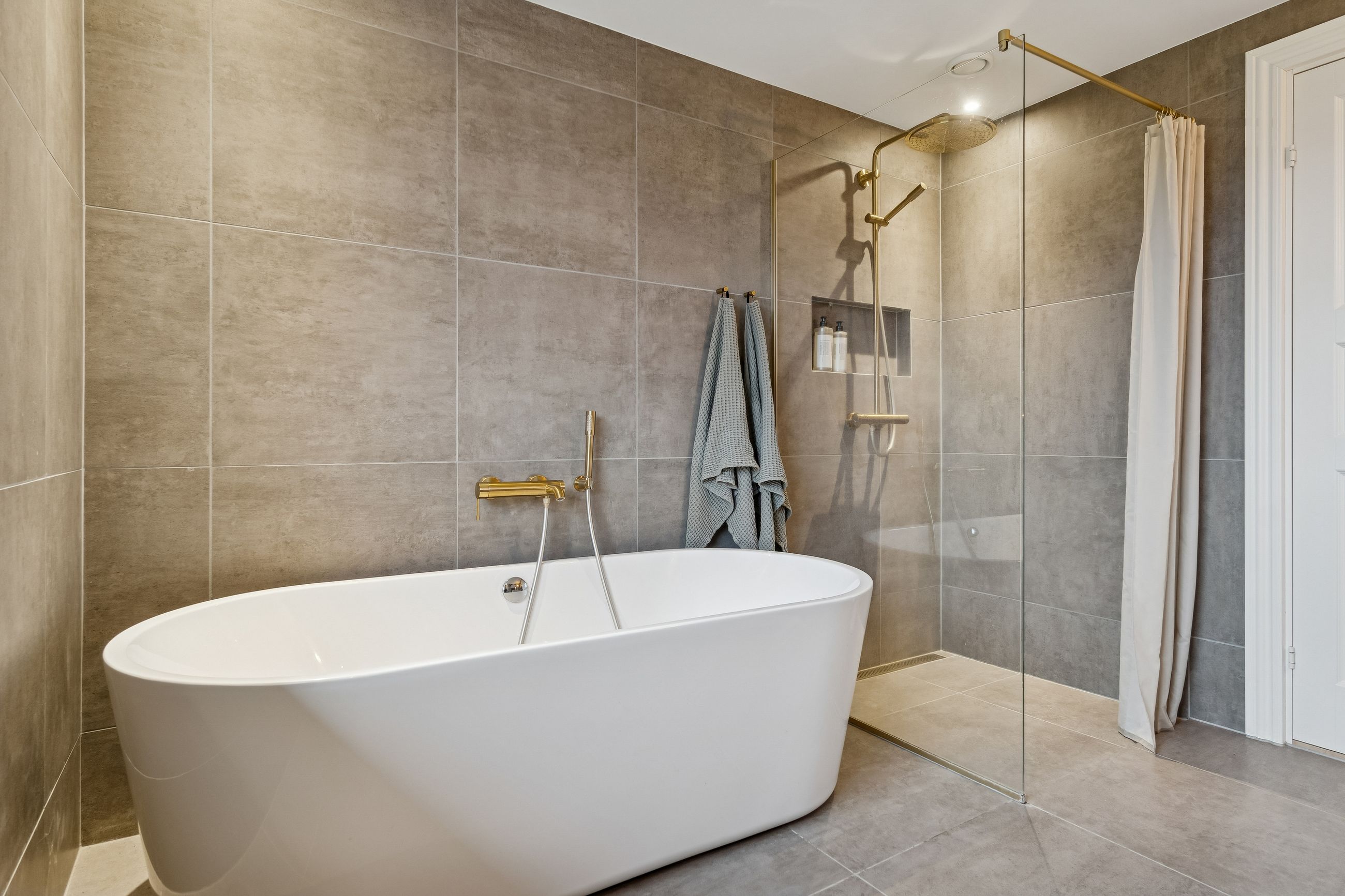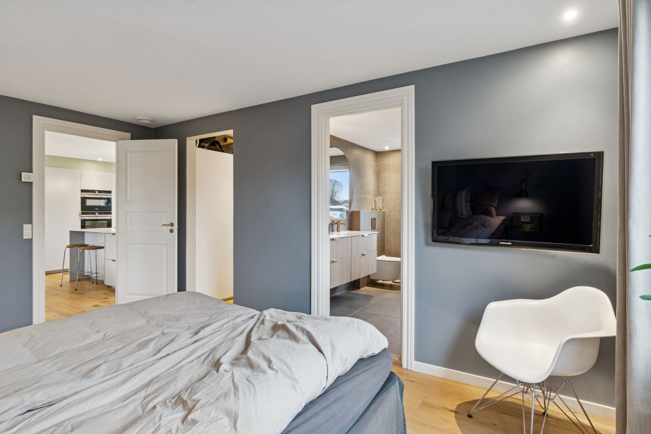 Forældreafdelingen er placeret for sig selv og byder på et stort og lækkert badeværelse med både bruseniche og badekar samt tilhørende walk-in-closet – en privat oase i hjemmet.