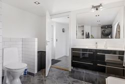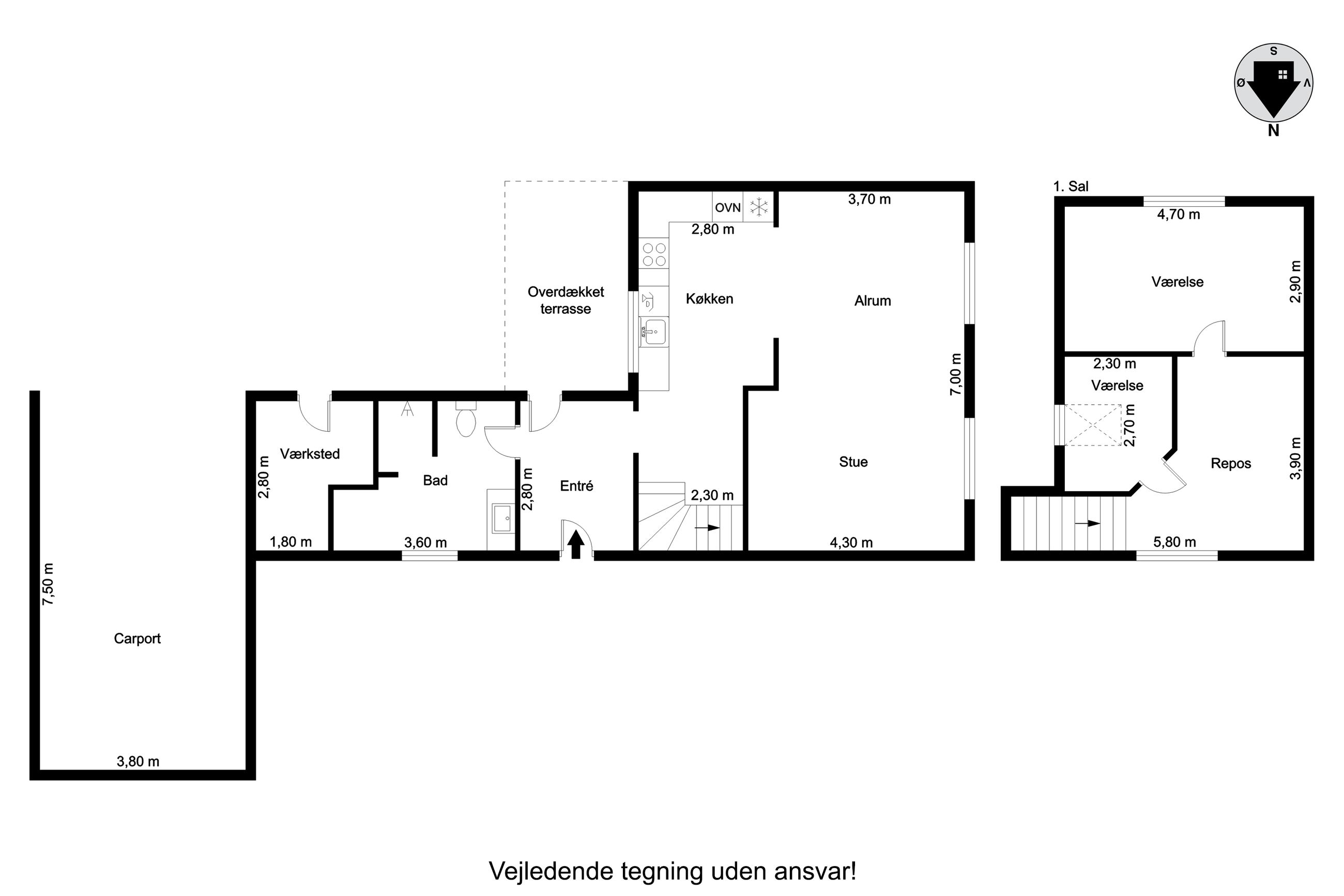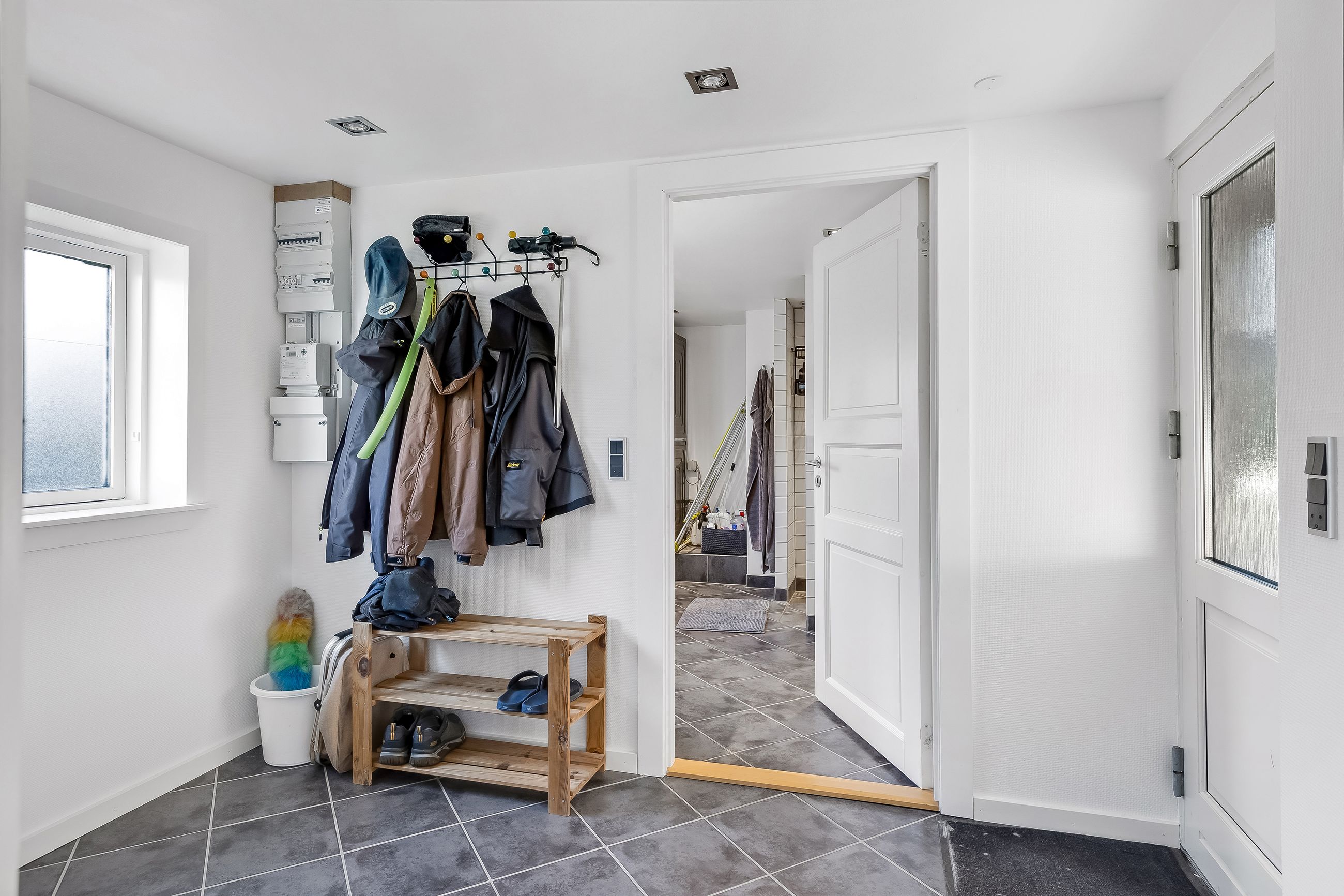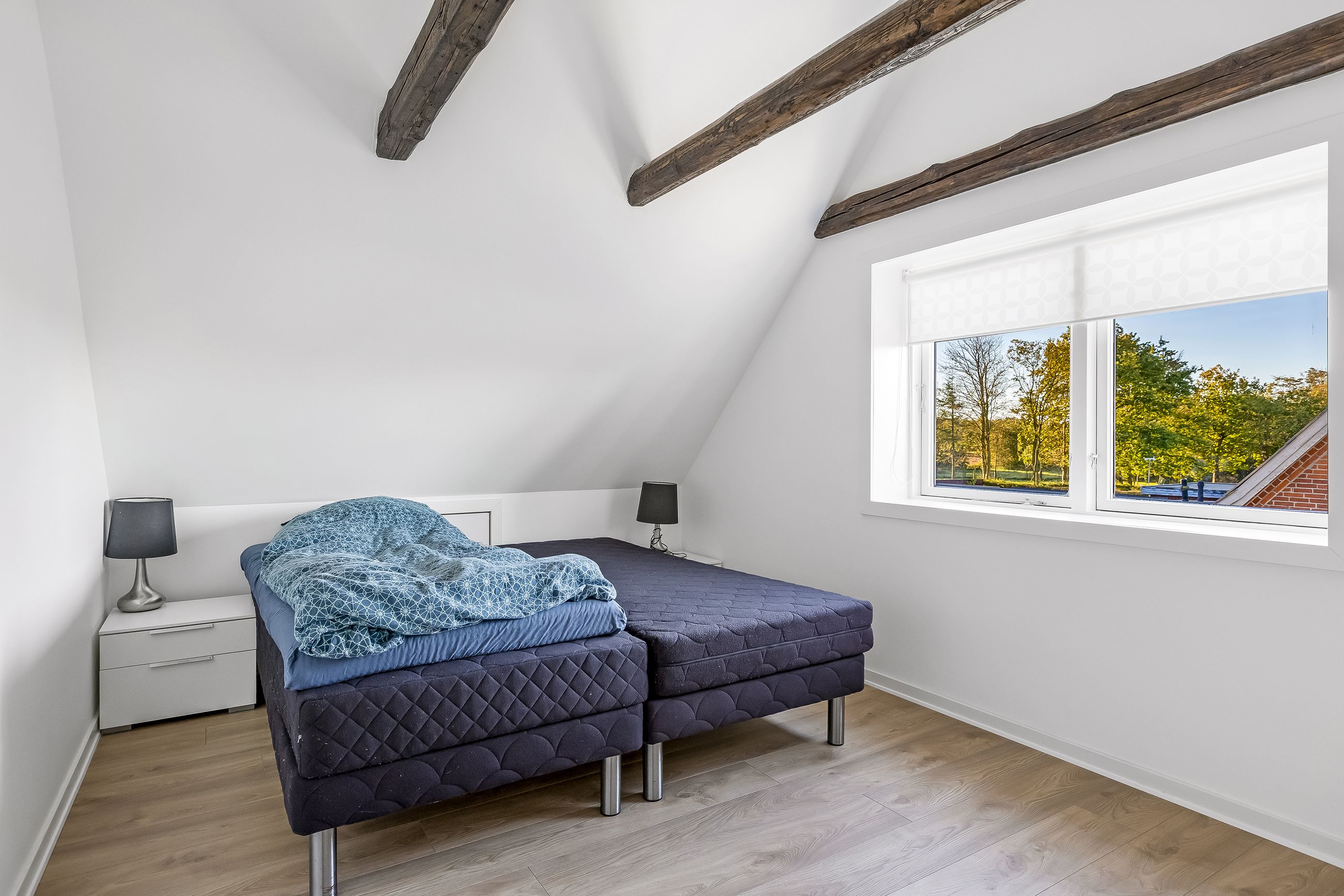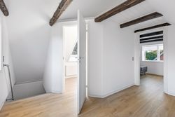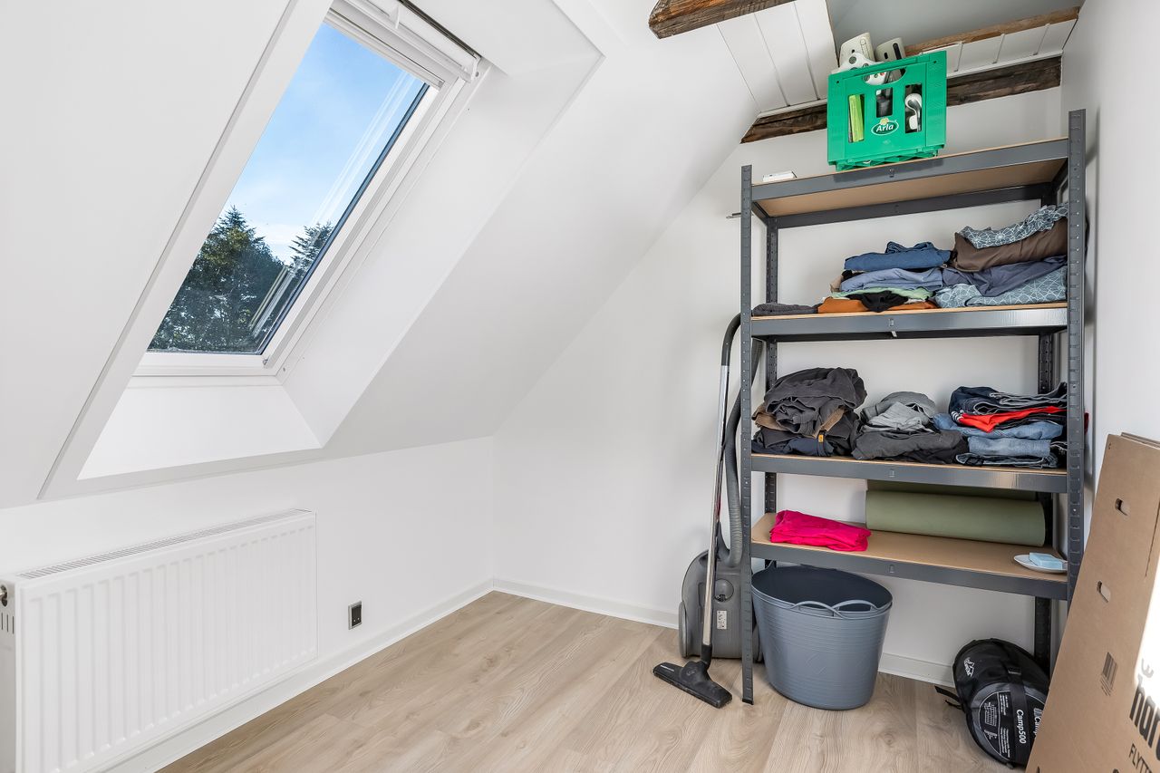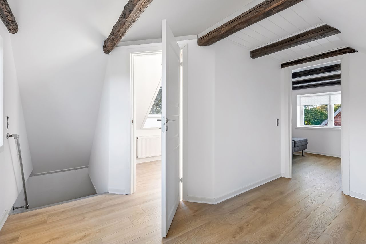 Baggangen fungerer også som bryggers med praktisk opbevaringsplads og på første salen venter to rummelige soveværelser med lofter til kip samt en repos, der kan bruges som kontor eller læsehjørne.