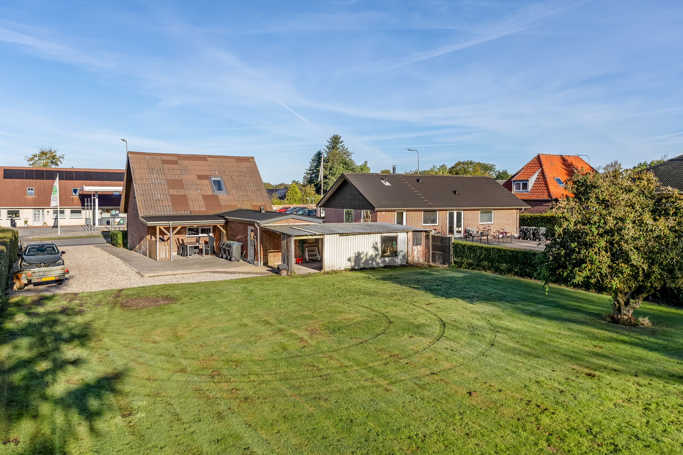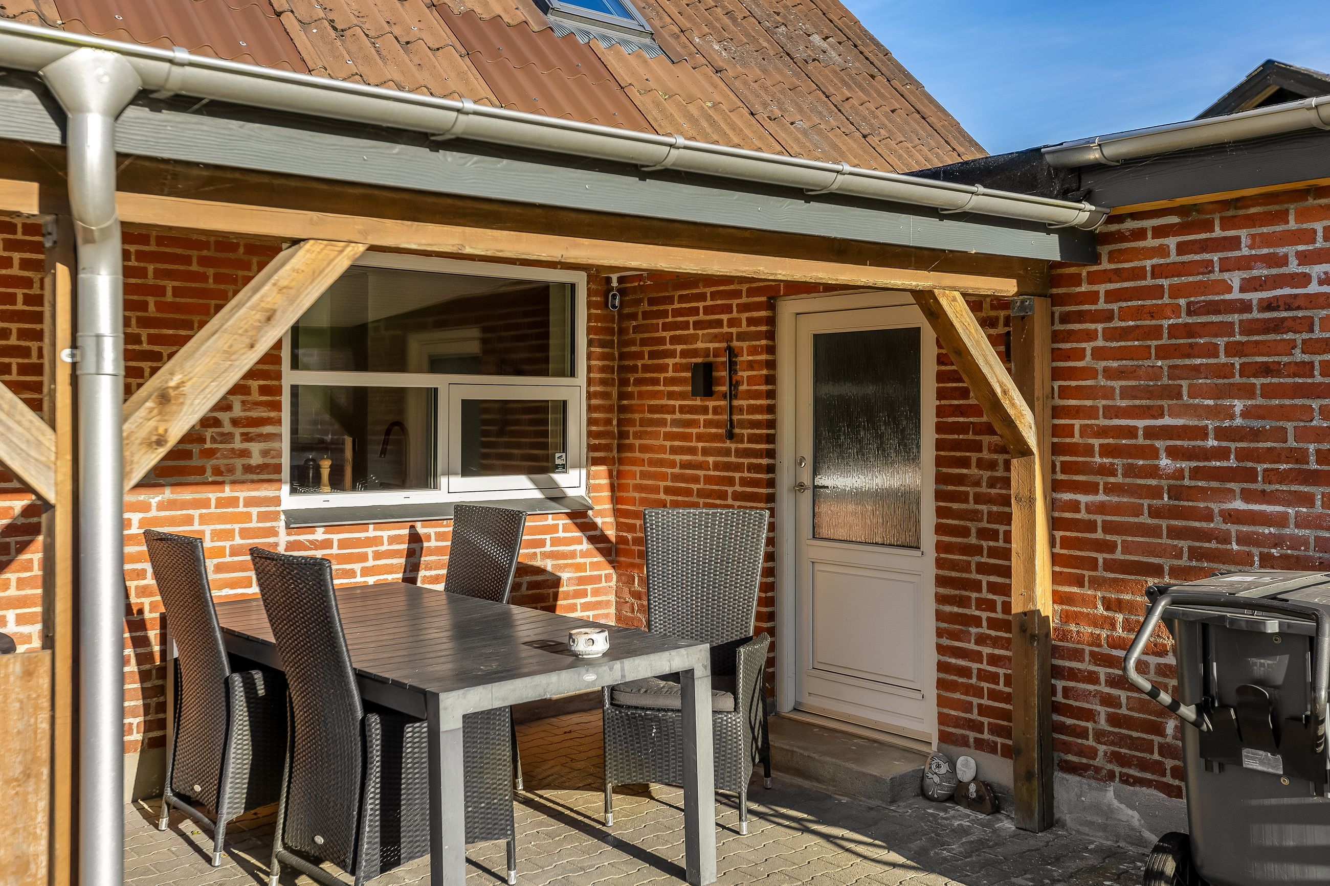 Og når vi kommer udenfor fortsætter de gode oplevelser med en dejlig nem have samt en hyggelig gårdsplads – Og den overdækkede terrasse giver mulighed for at nyde udendørslivet uanset vejret og perfekt til sommerens grillmiddage eller afslapning.