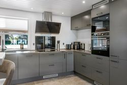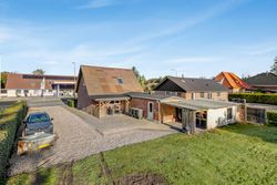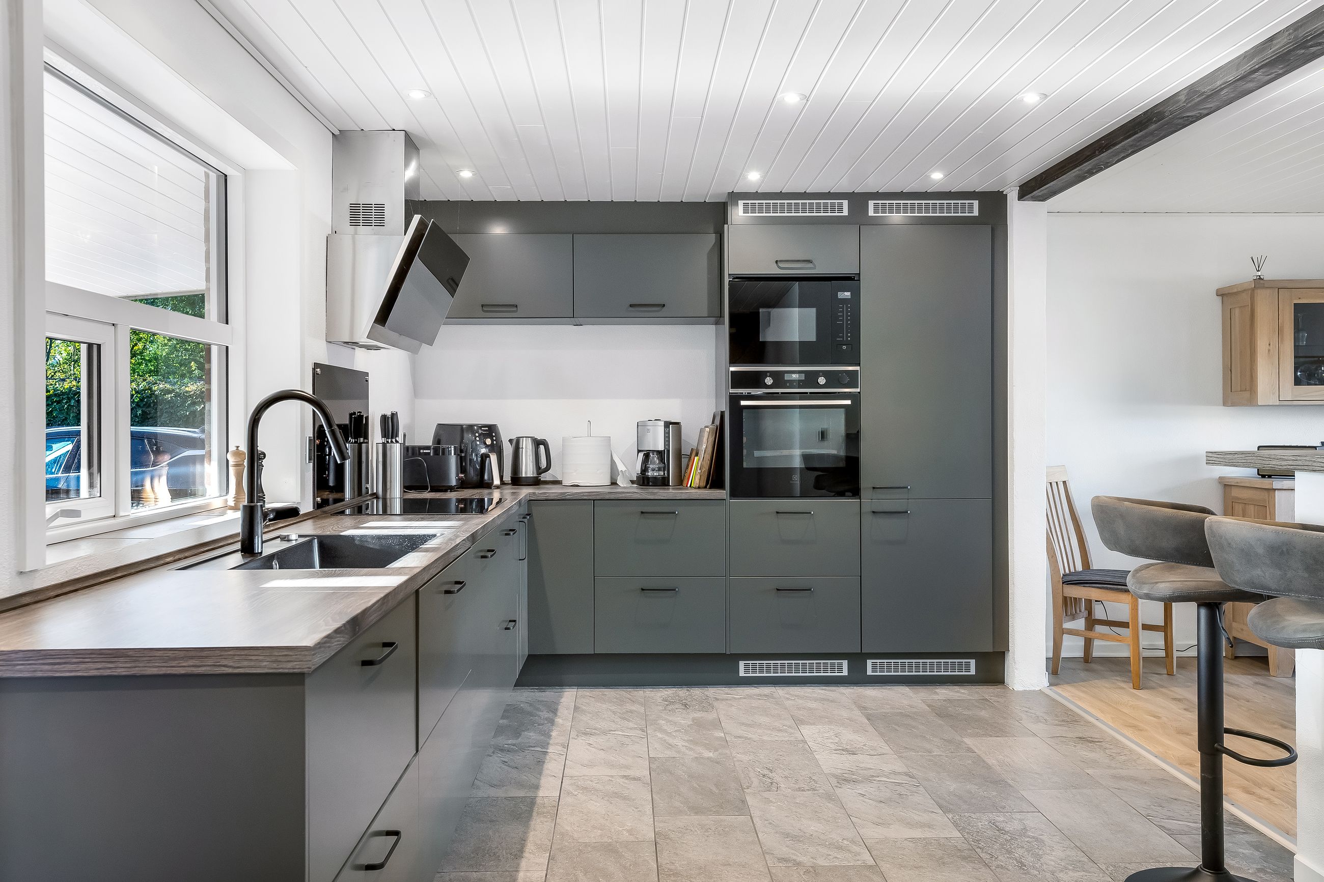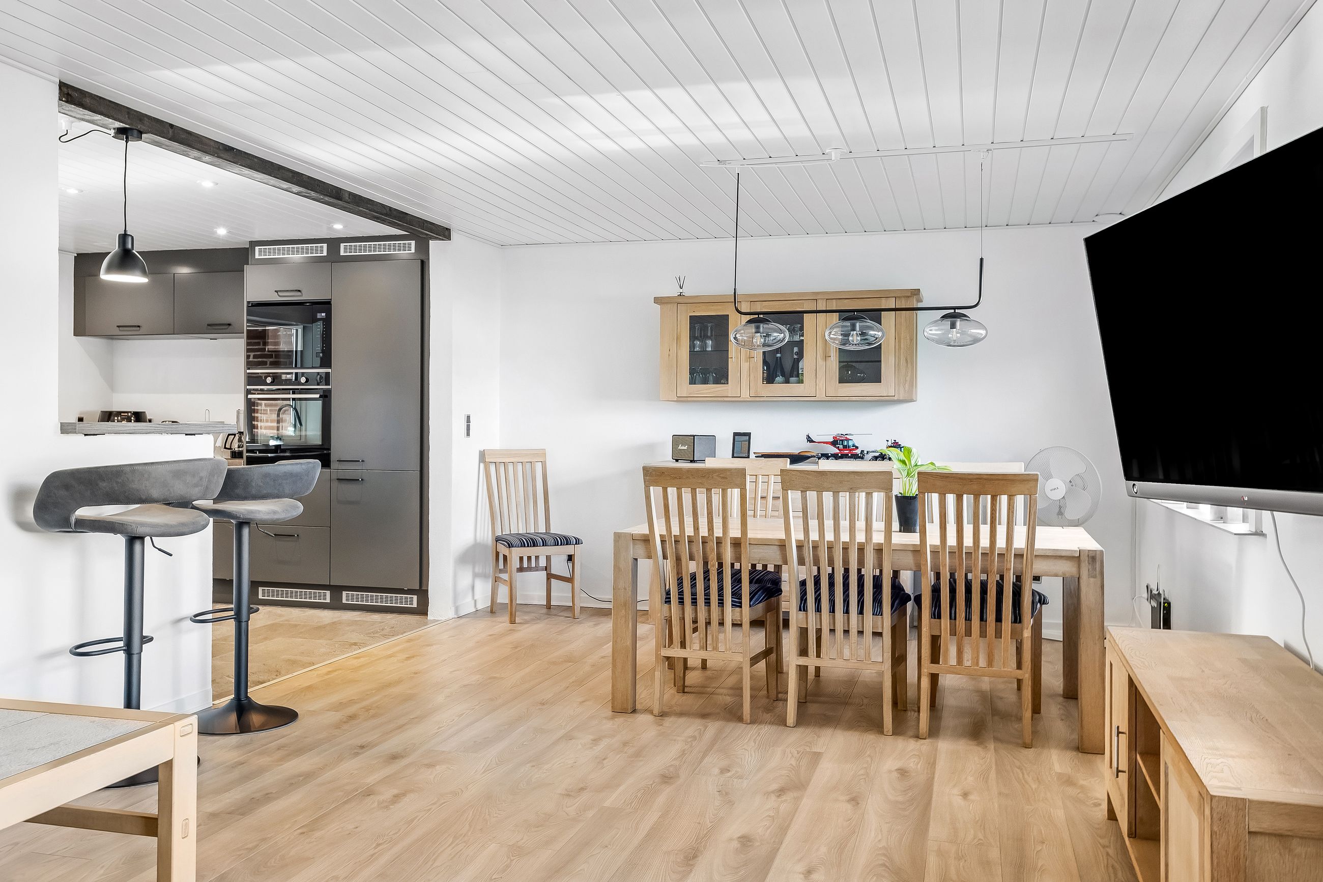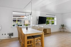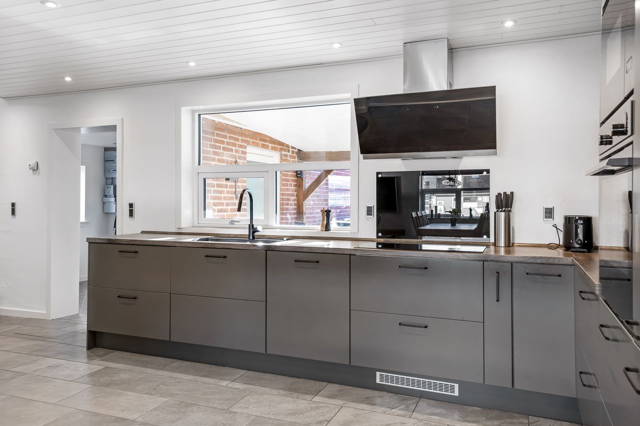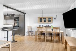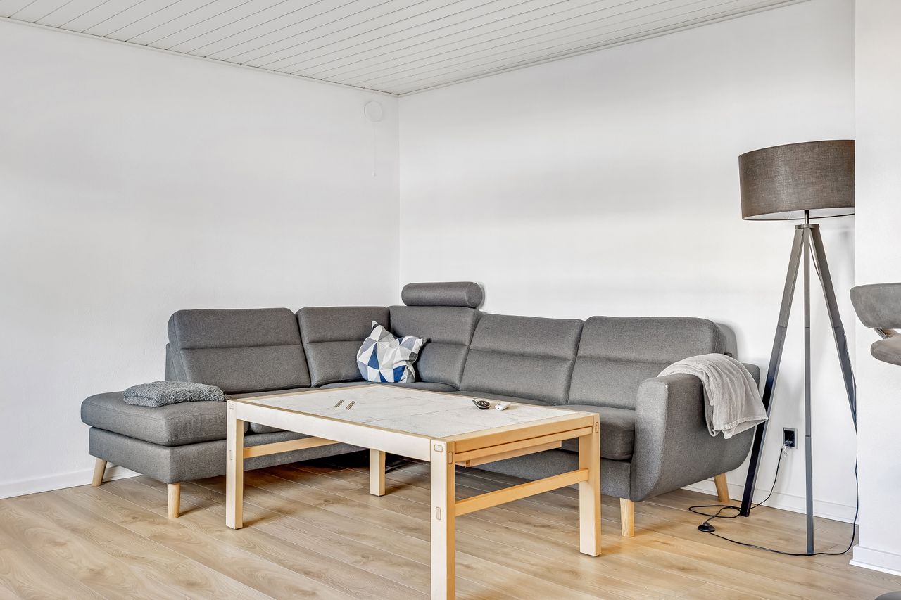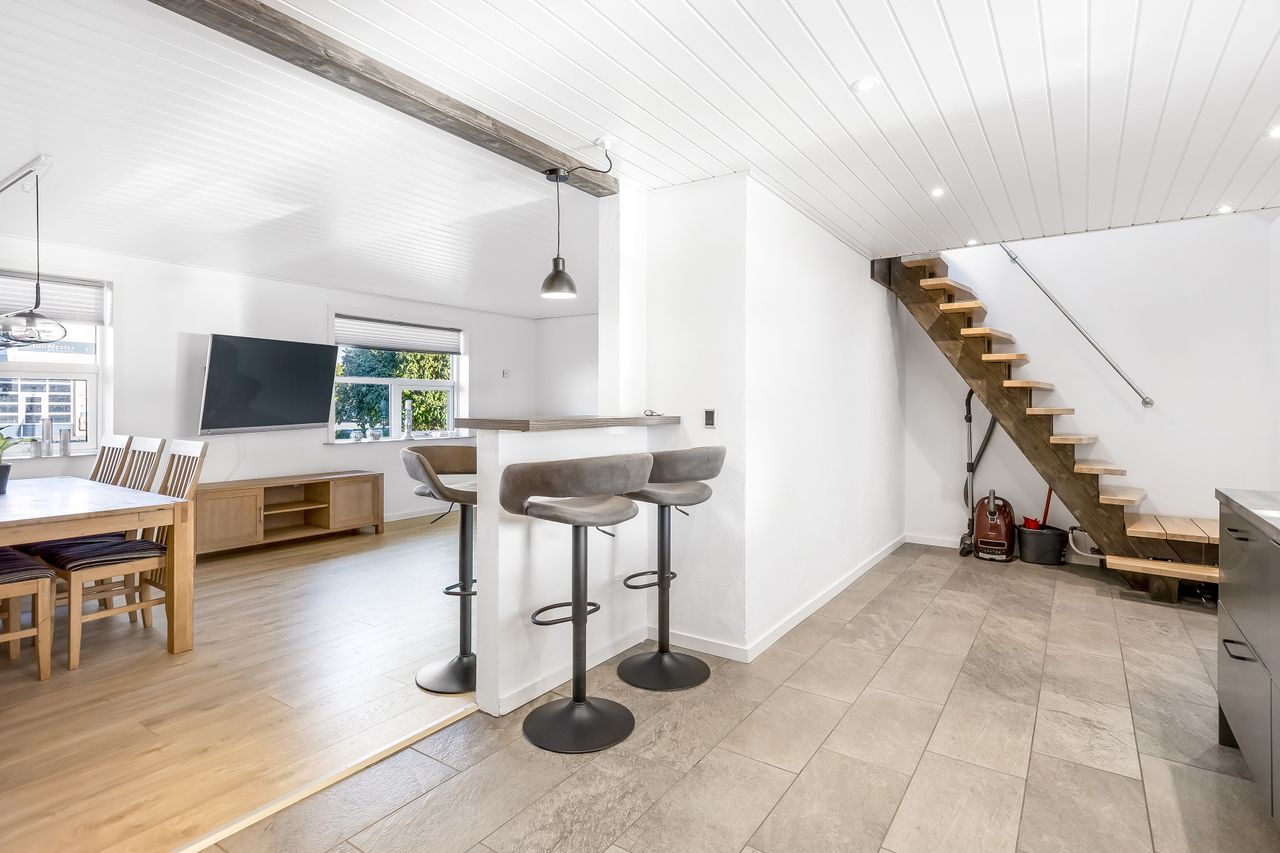 Indenfor mødes du af et lyst køkken-alrum, hvor madlavning og hyggelige stunder går hånd i hånd og opholdsstuen byder på masser af naturligt lysindfald, hvilket skaber en varm og imødekommende stemning.