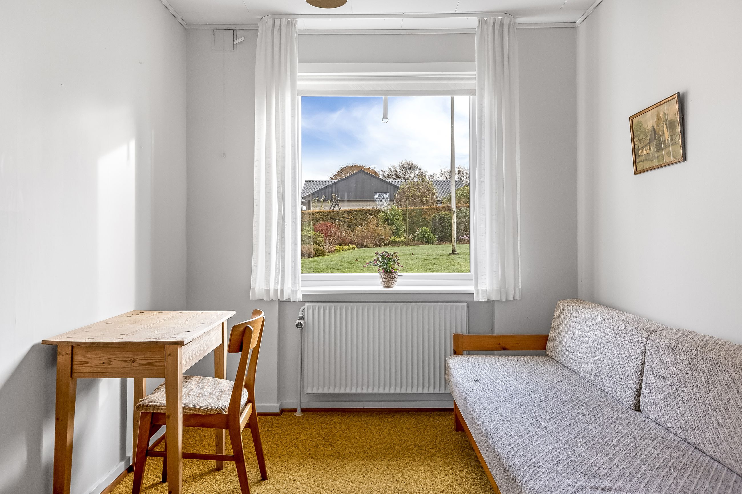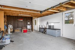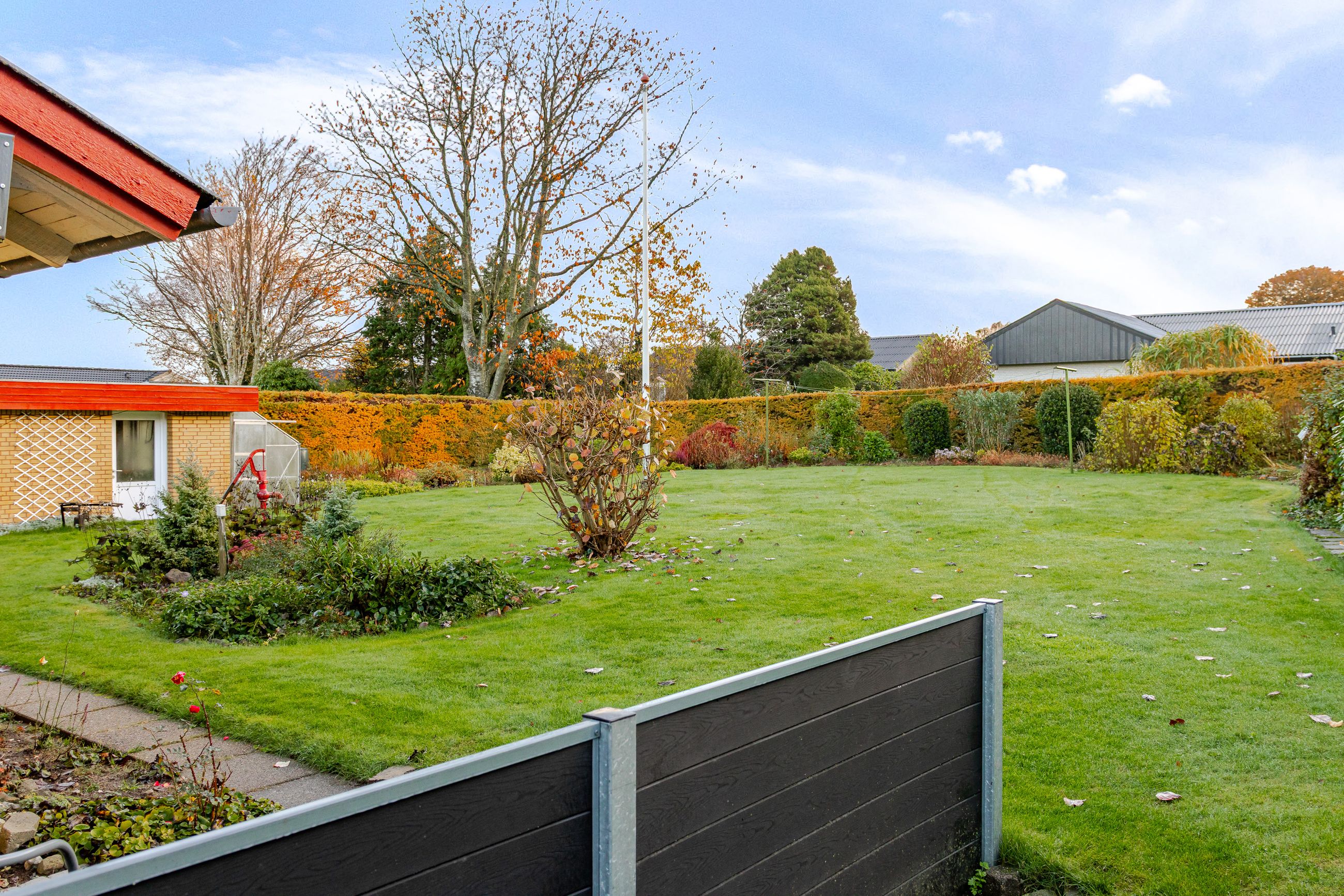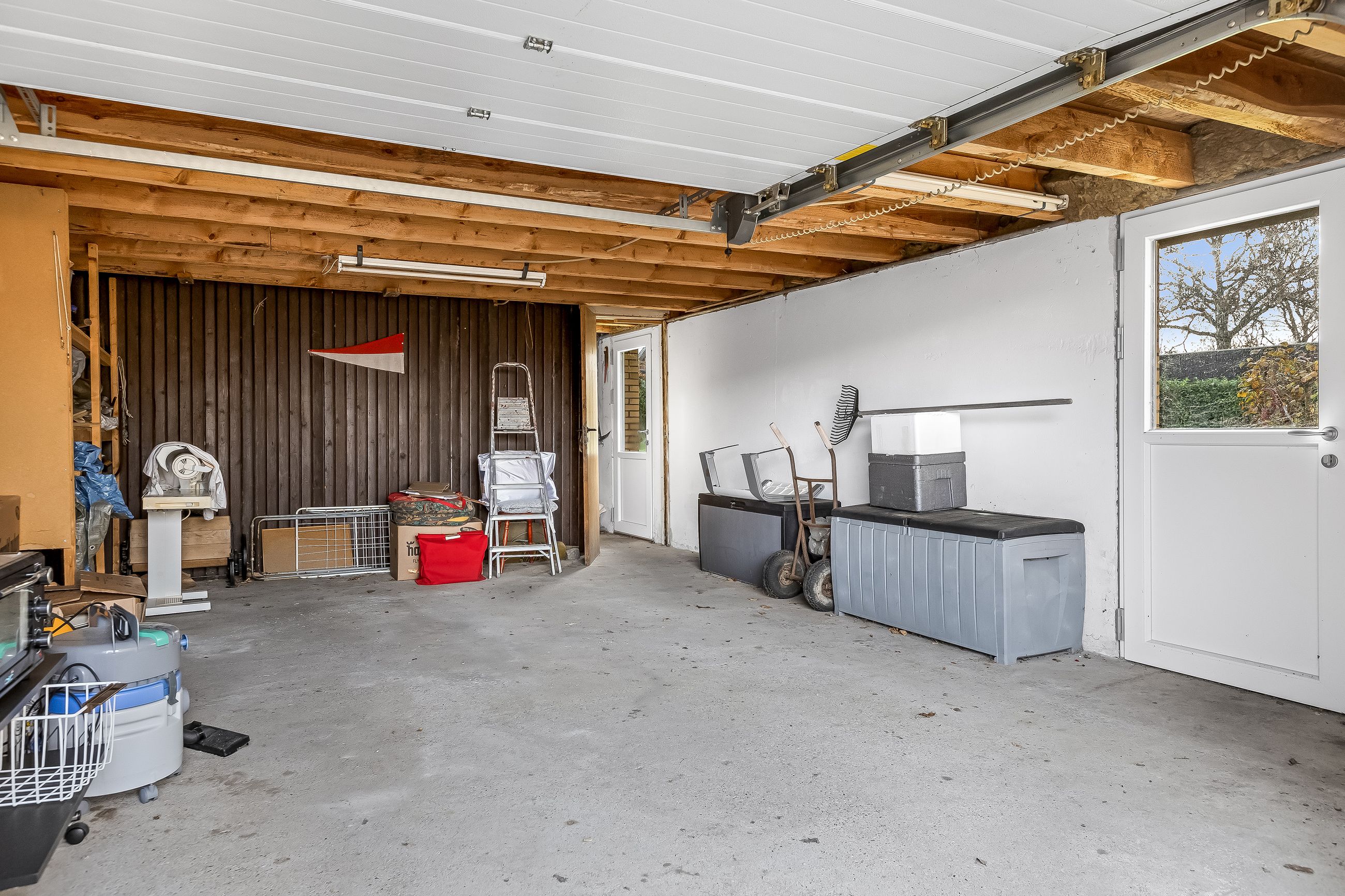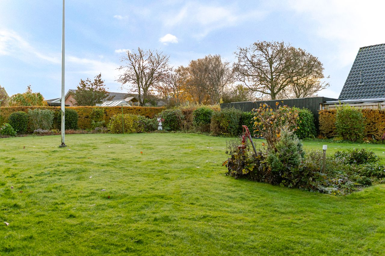 Udenfor mødes du af en pænt anlagt have, der er lukket af for privatlivets skyld – perfekt til legende børn eller afslapning under åben himmel. En solid muret garage giver god plads til bilparkering samt opbevaring af værktøj eller cykler.