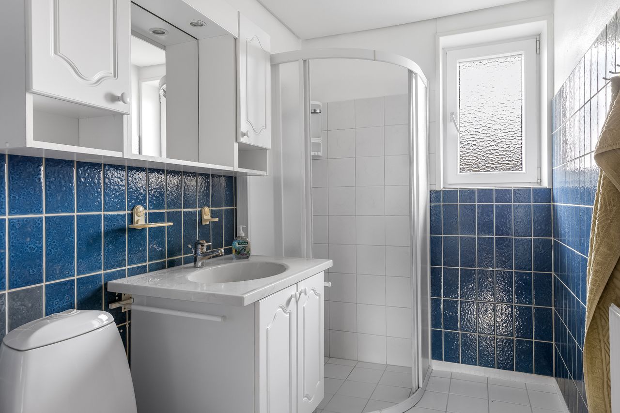 Det hyggelige spisekøkken er hjertet i huset med plads til både madlavning og hyggelige måltider. Badeværelset er godt indrettet med brus og gode materialer.