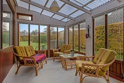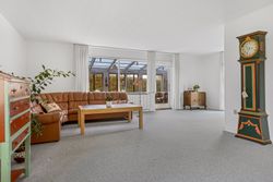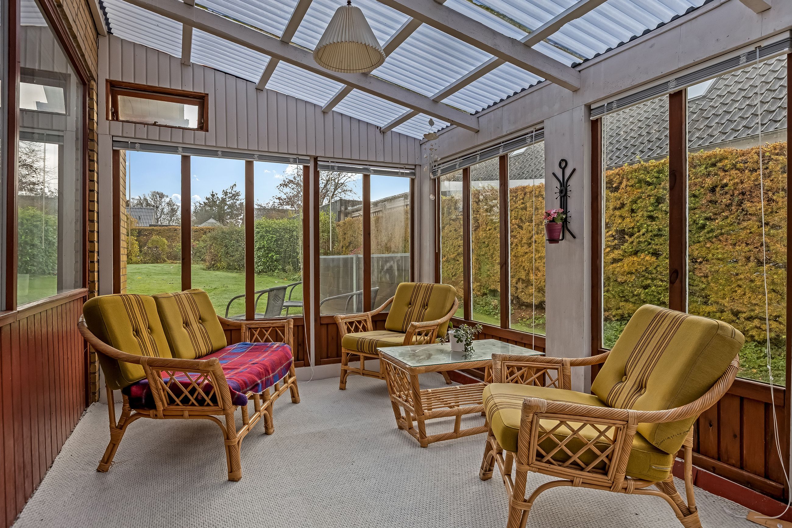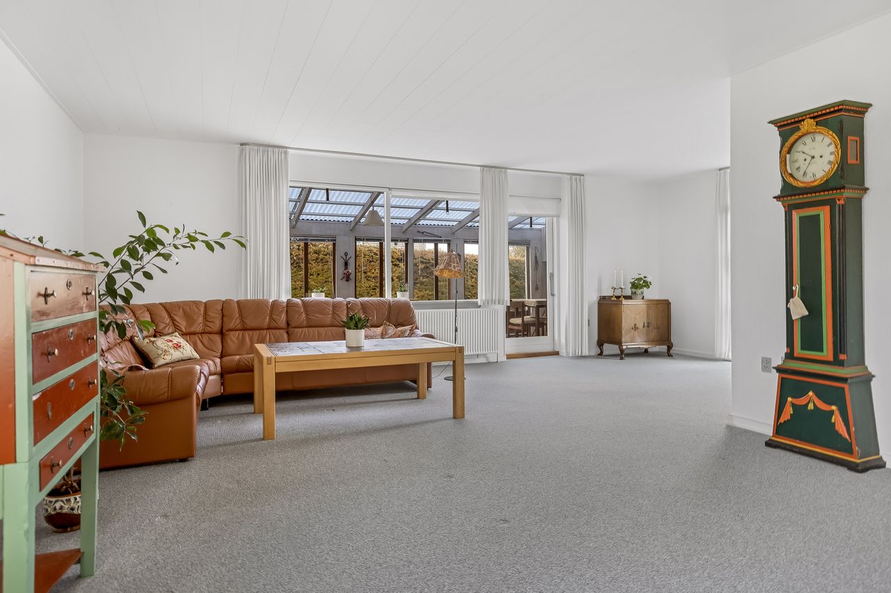 Den dejlige opholdsstue i vinkel skaber en naturlig overgang til udestuen, hvor man kan nyde udsigten over haven året rundt.