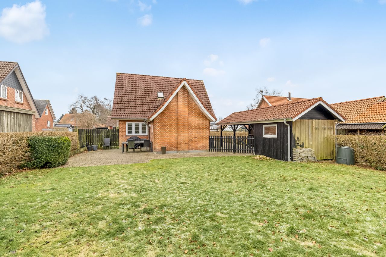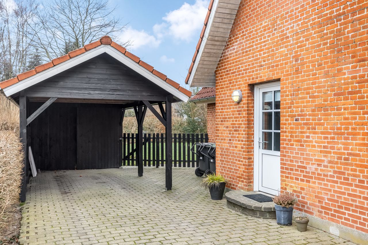 Udendørs finder du en dejlig have fyldt med frodige buske og træer – det perfekte sted at nyde solrige dage eller dyrke din grønne hobby. En solid Carport beskytter din bil mod vejrets luner, mens det gode udhus giver ekstra opbevaringsplads.